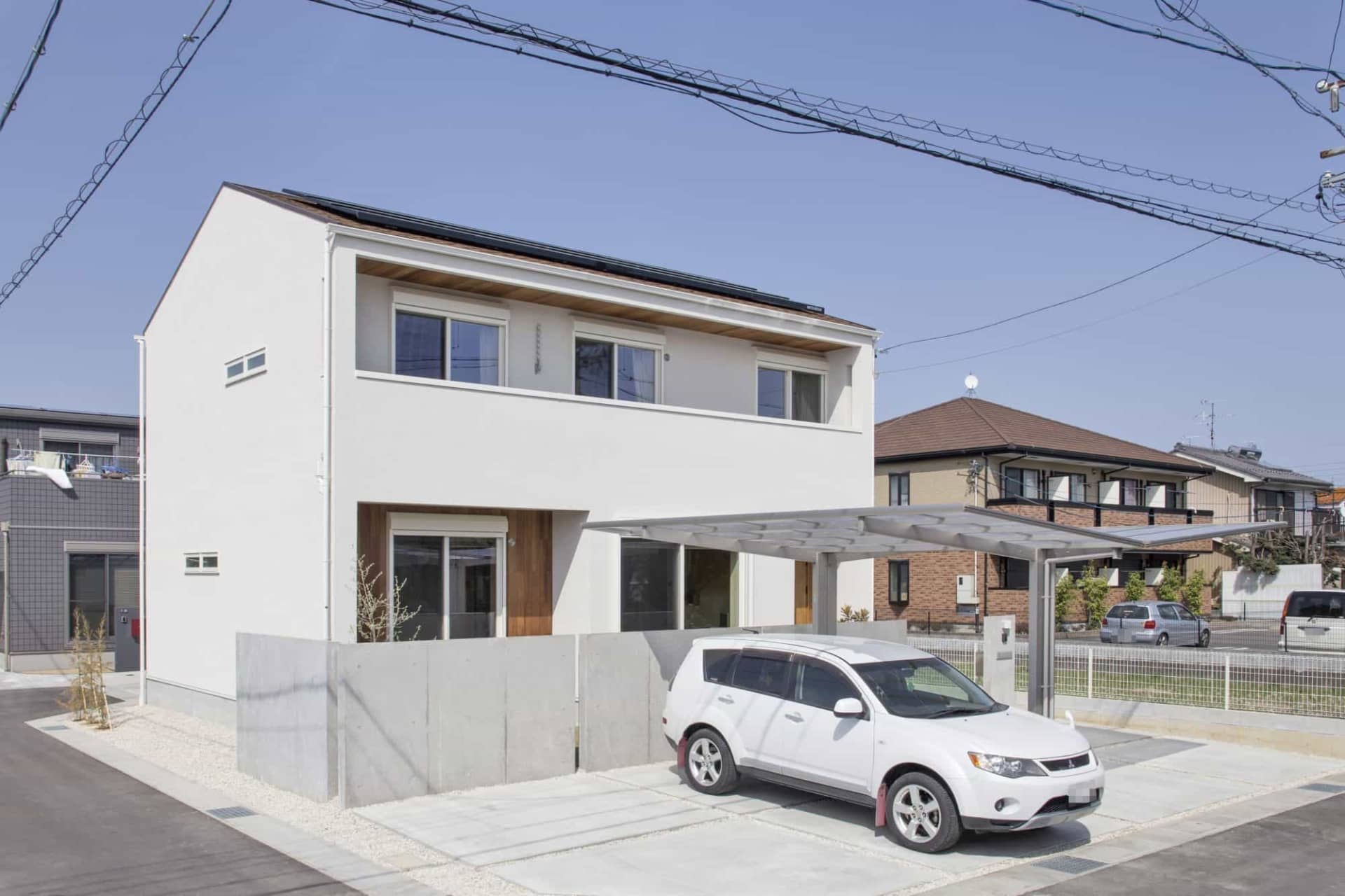 クリーム色の塗り壁と、和室と玄関部のレッドシダーの木の外壁、そして軒裏にも同じレッドシダーを使用し、ナチュラルな雰囲気の外観です。