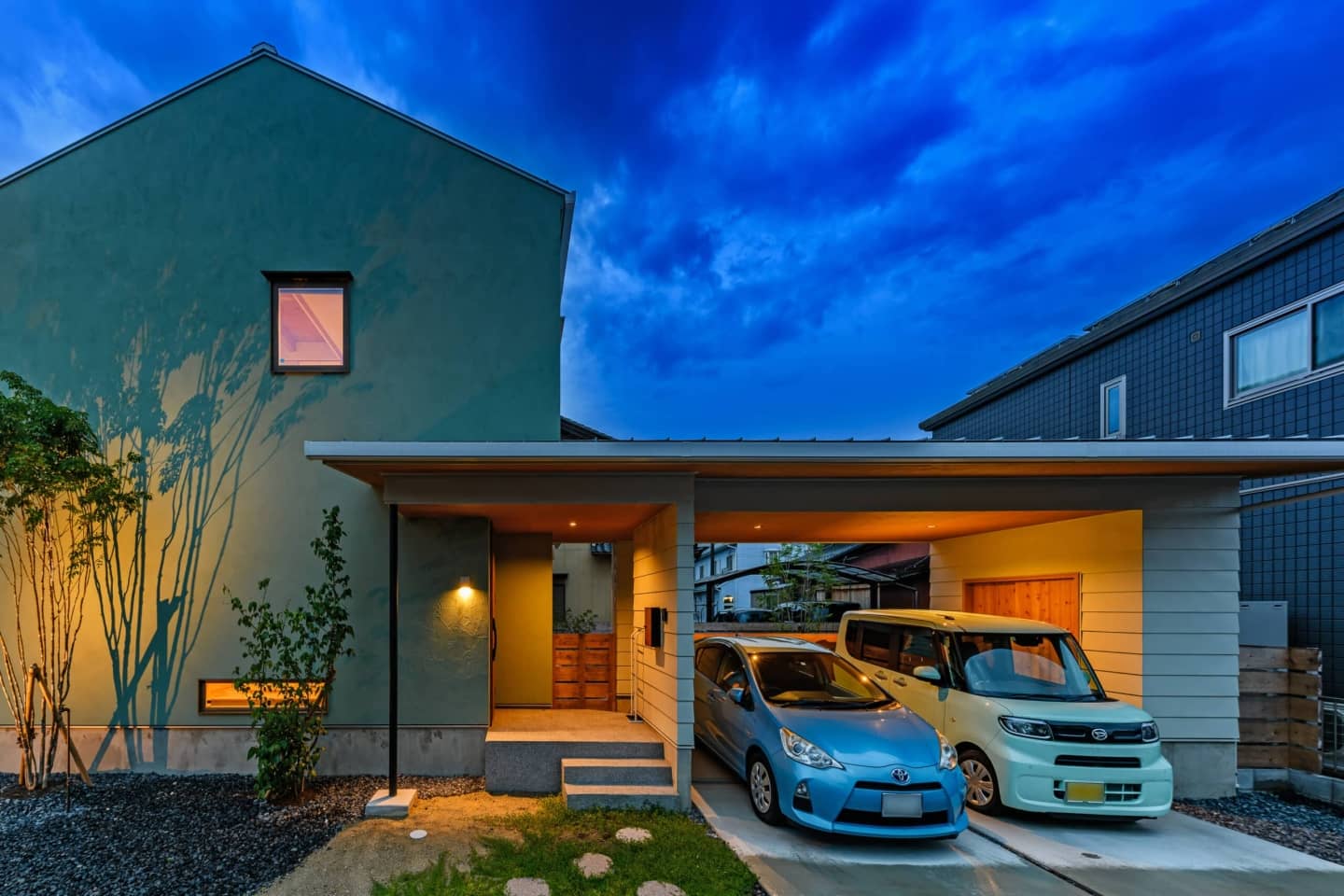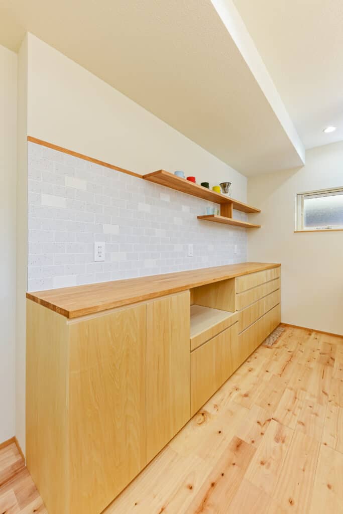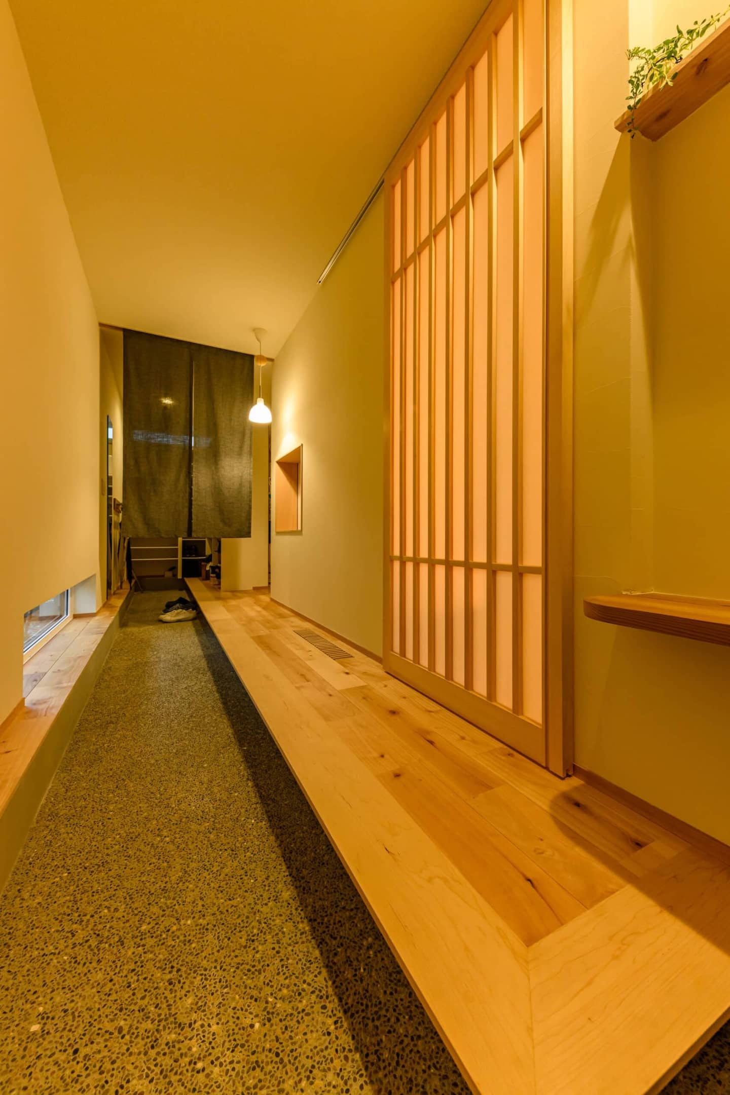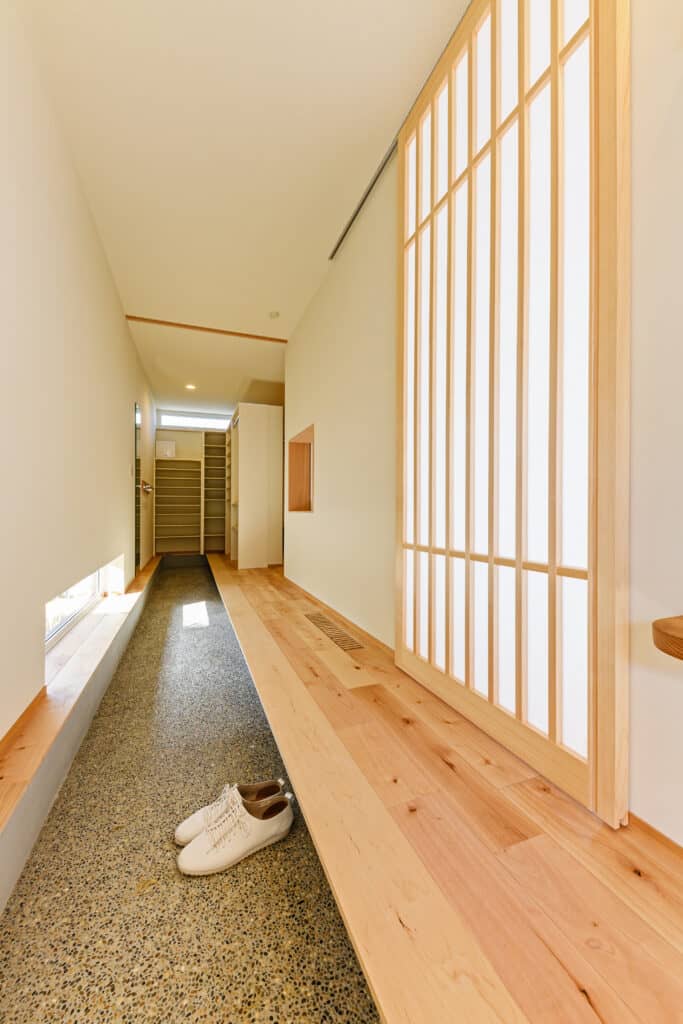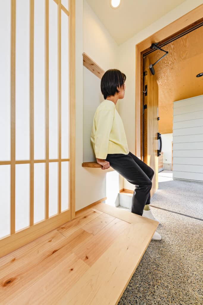 玄関には少し腰掛けるのにちょうど良い高さの小さなベンチを設置。長い玄関土間は動線が二手に分かれており、シーンによって使い分けることが出来ます。