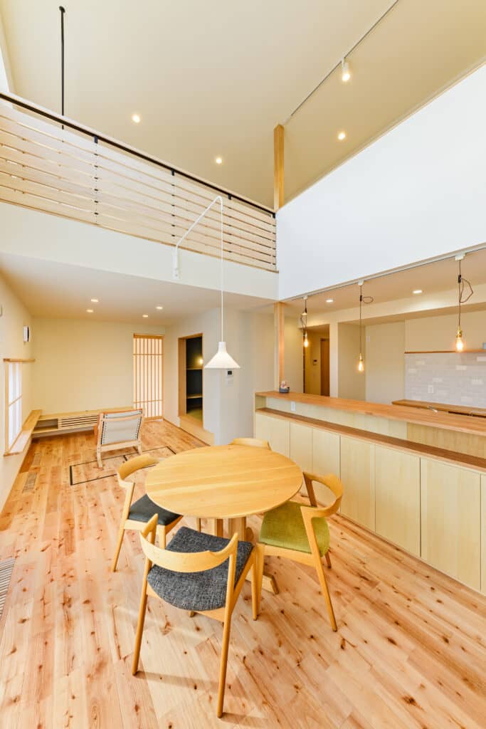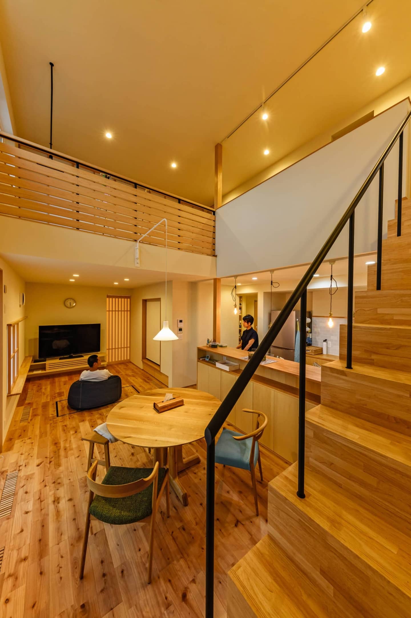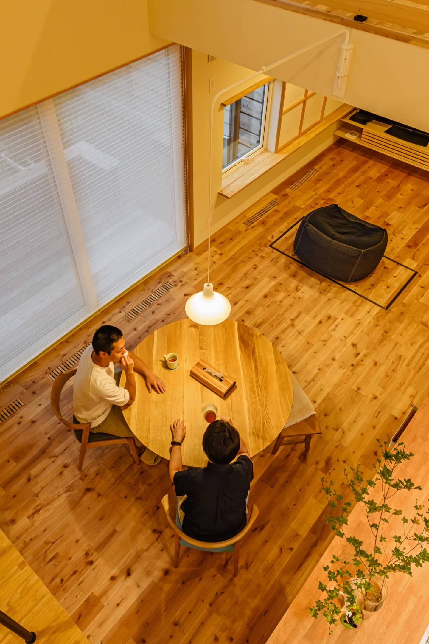 住宅街ですが、吹き抜けや大きなサッシからふんだんにお日様を取り込めるように設計し、暖かくて開放的なLDKになりました。