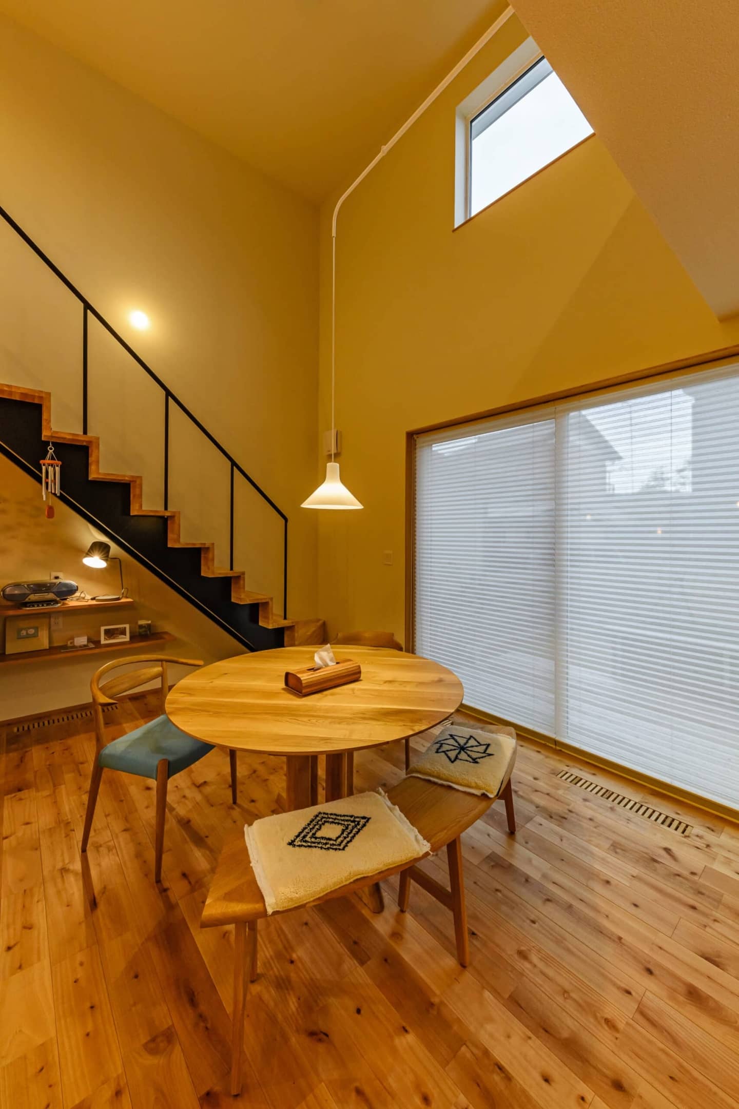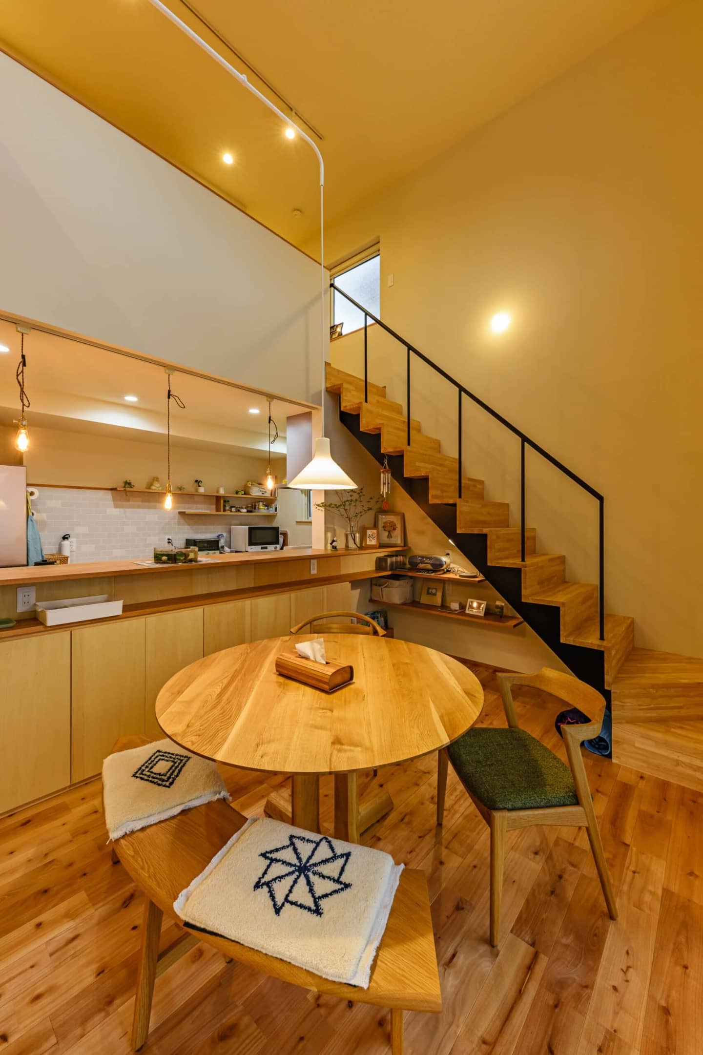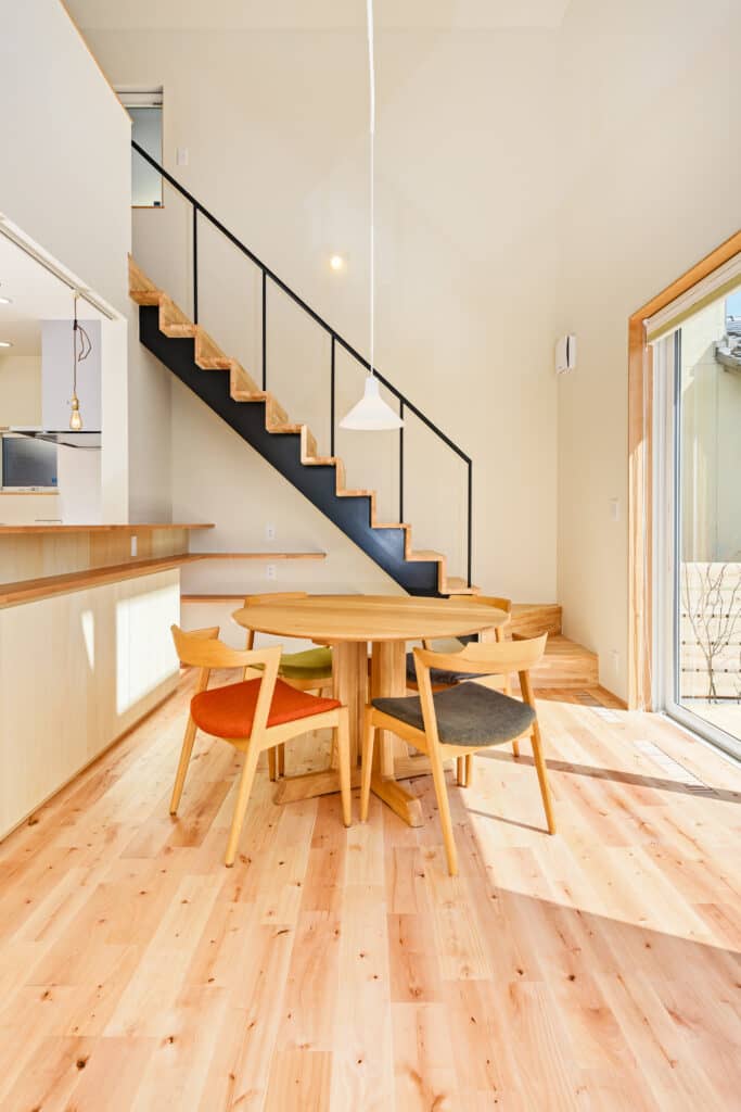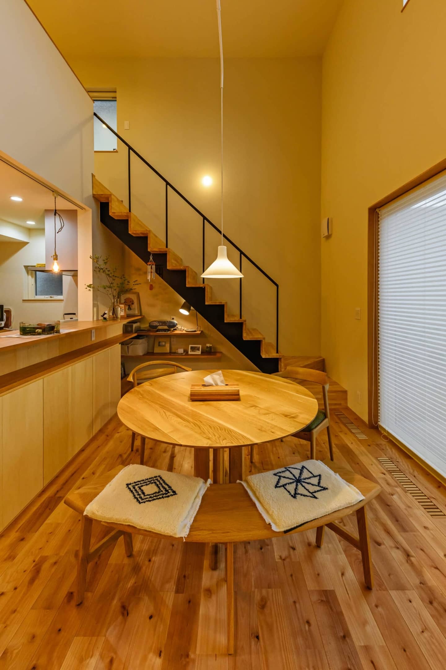 住宅街ですが、吹き抜けや大きなサッシからふんだんにお日様を取り込めるように設計し、暖かくて開放的なLDKになりました。