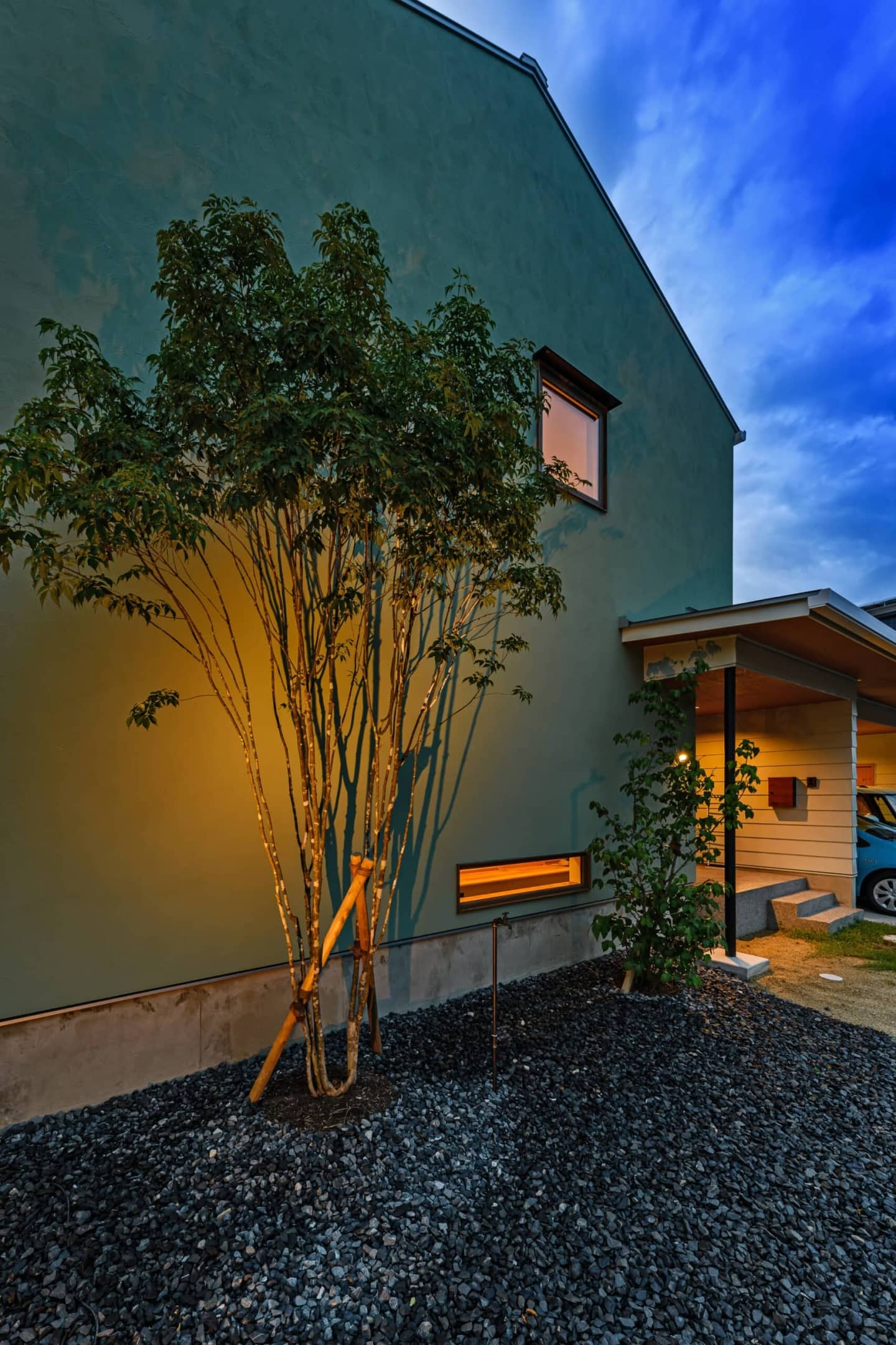 まちに開く側に配置したシンボルツリーの1つであるアオダモは、夜はライトアップで違う表情が見られます。