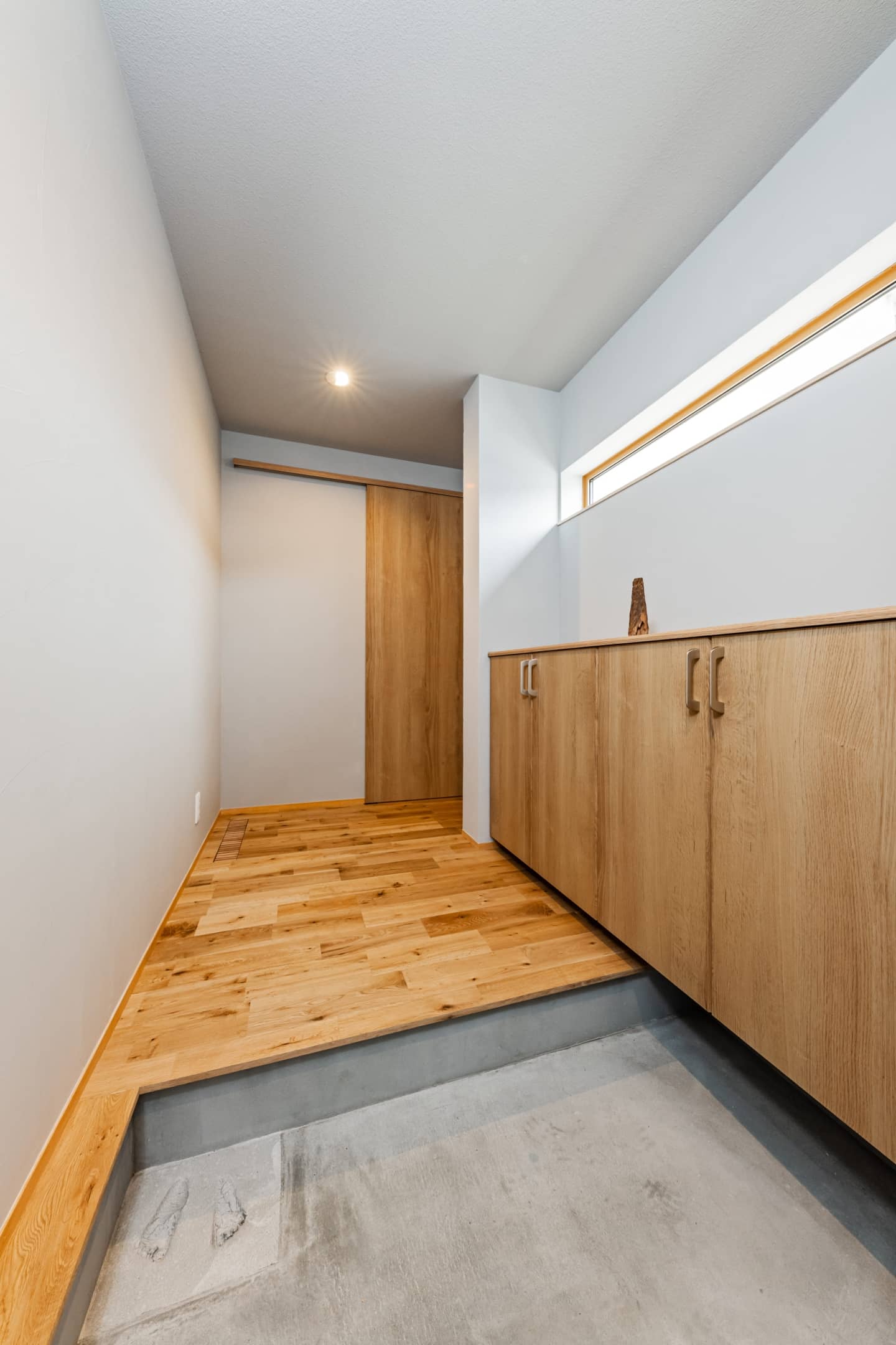 広めの玄関土間は扉が開いてもリビングの方が見えないように配置しました。