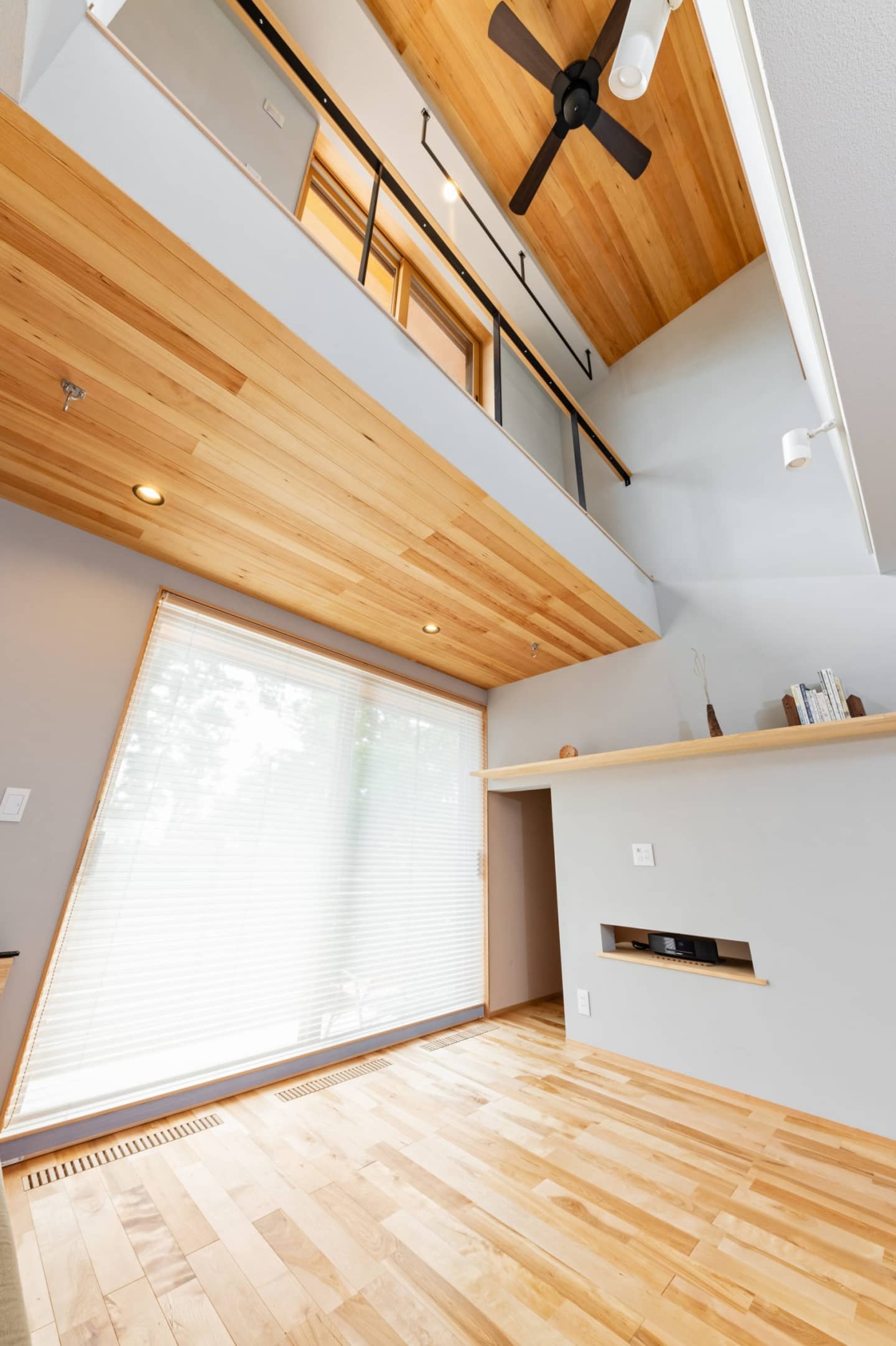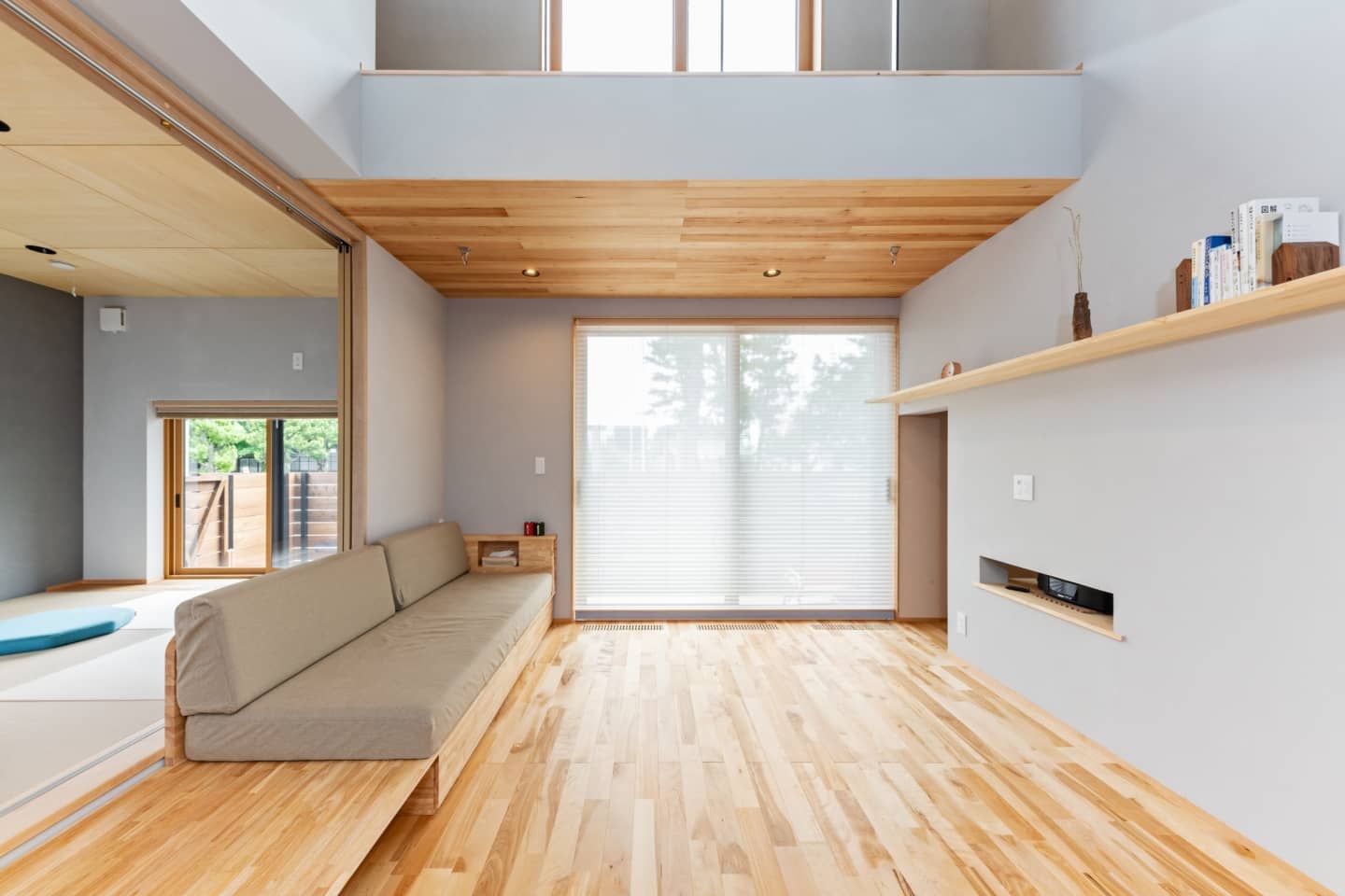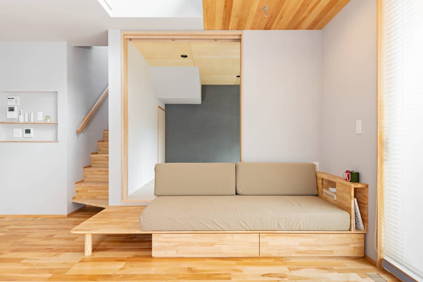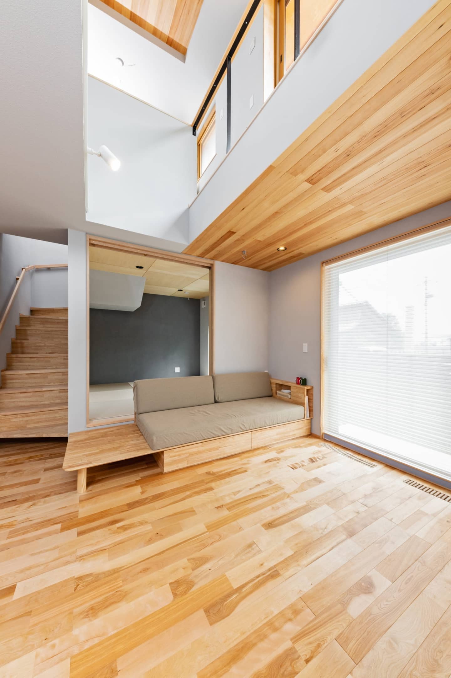 床下エアコンの暖房は吹抜けを通じて下へ抜けます。無印ソファを改造した造作ソファーも設置しました。