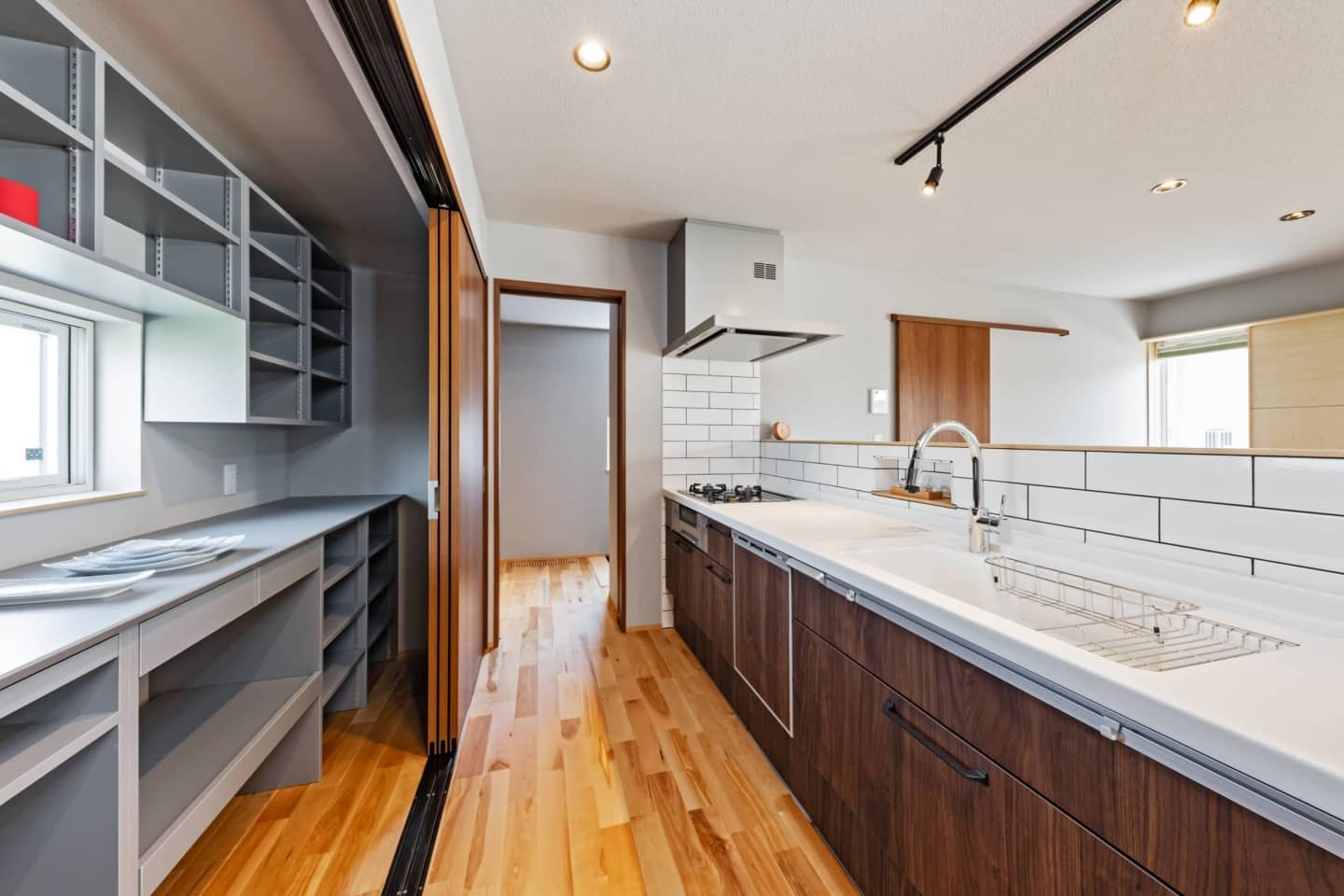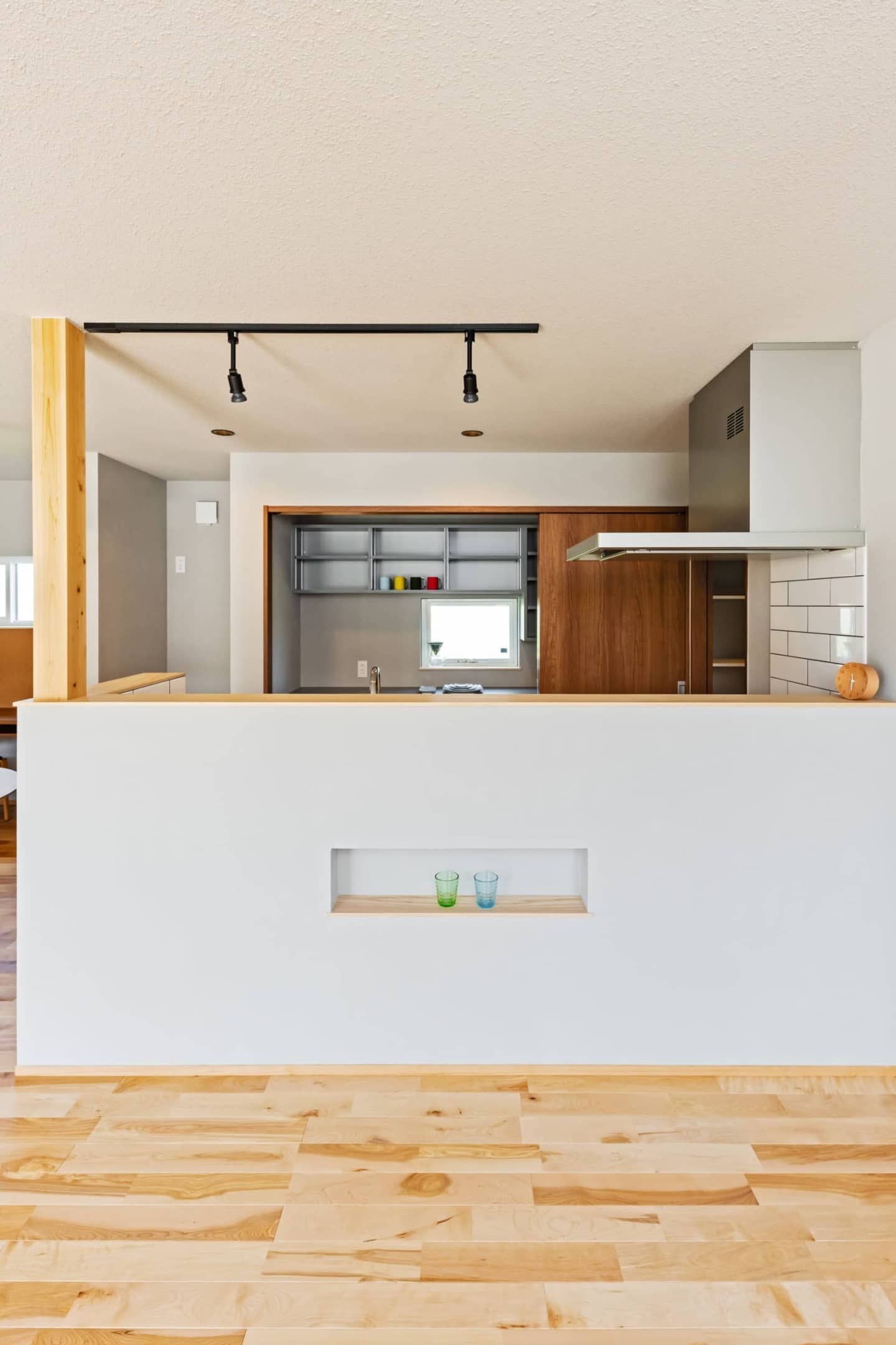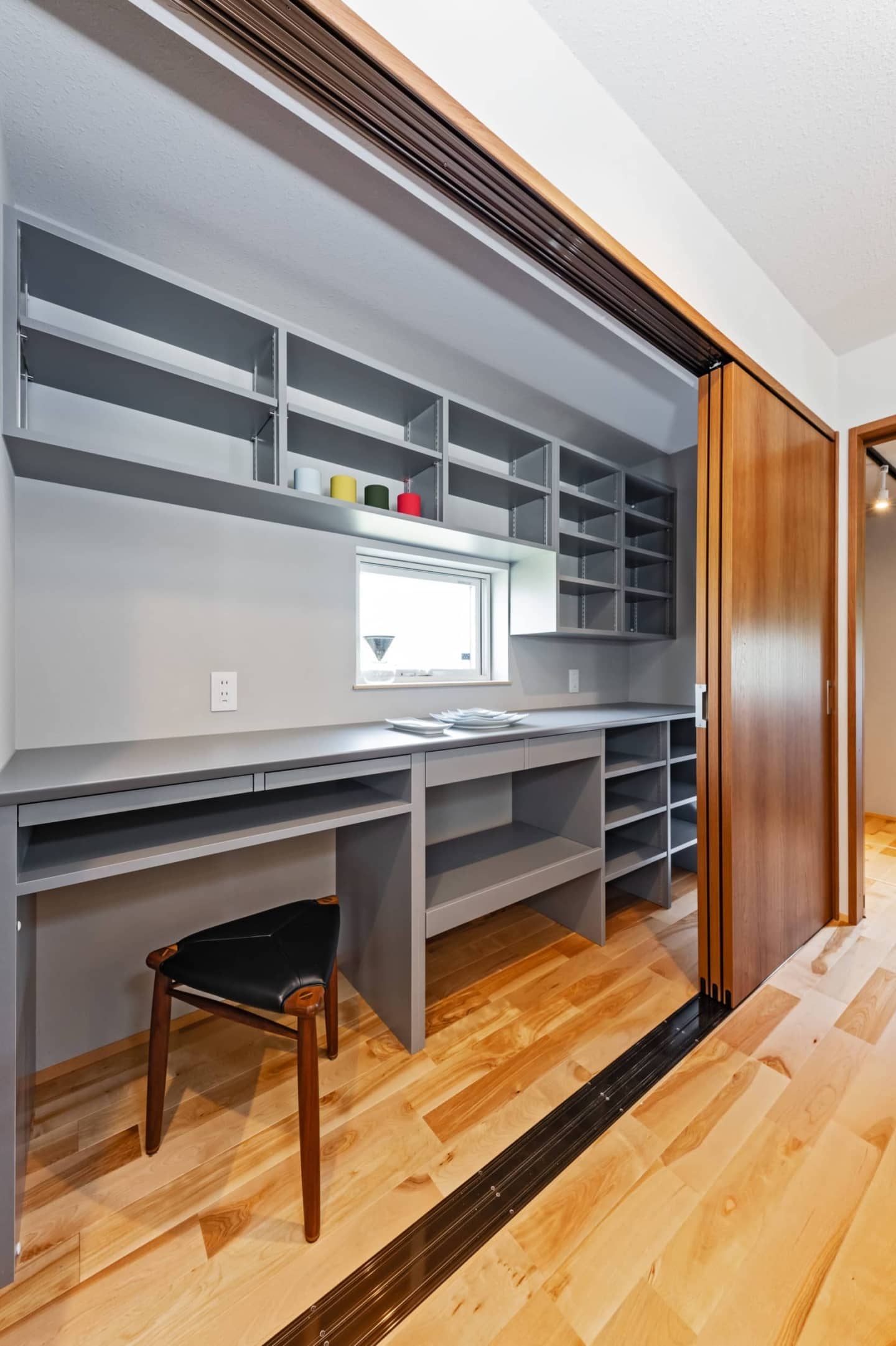 キッチンの背面はエムズ定番のしまえる造作家具。家具の色もグレーとこだわっています。