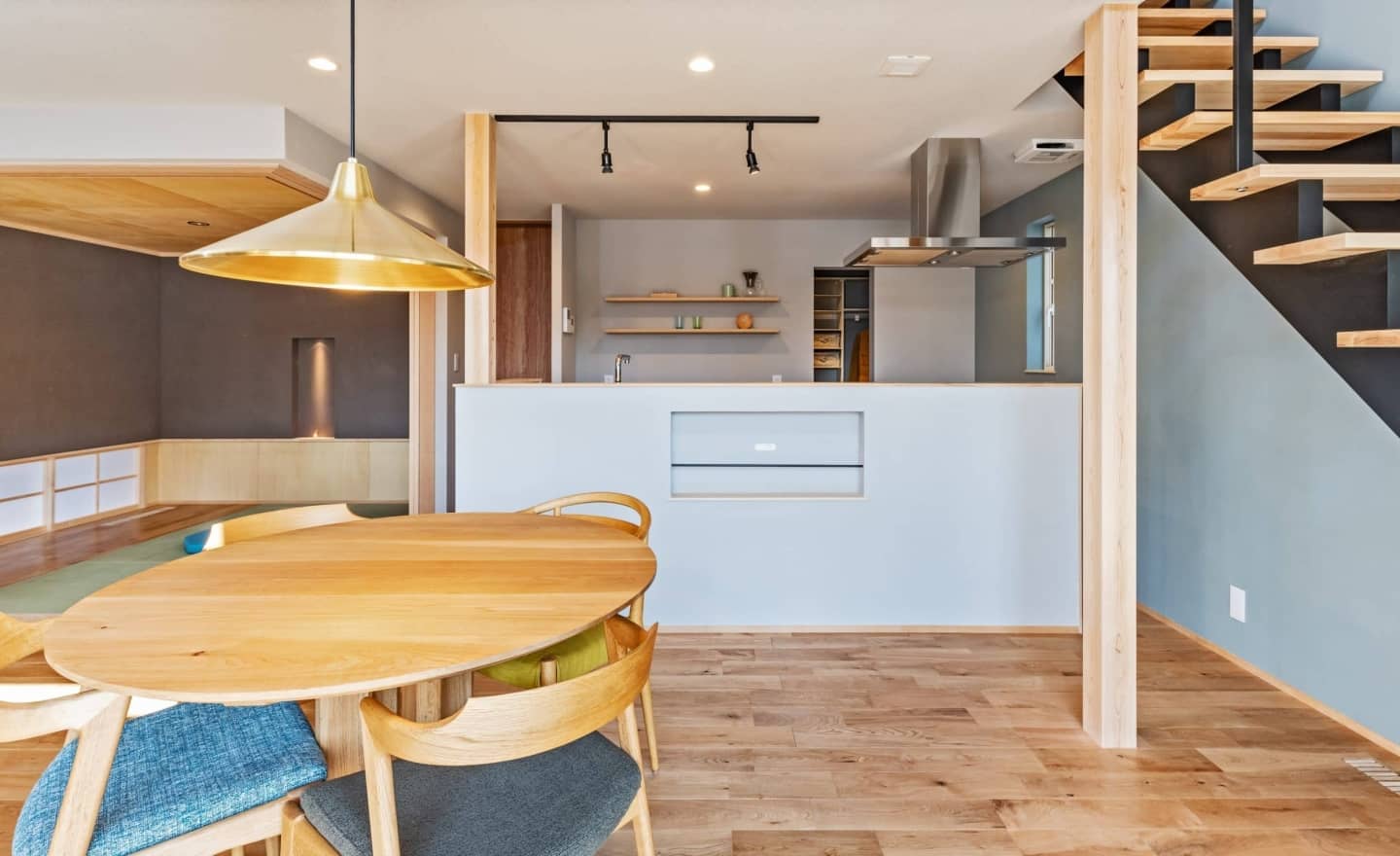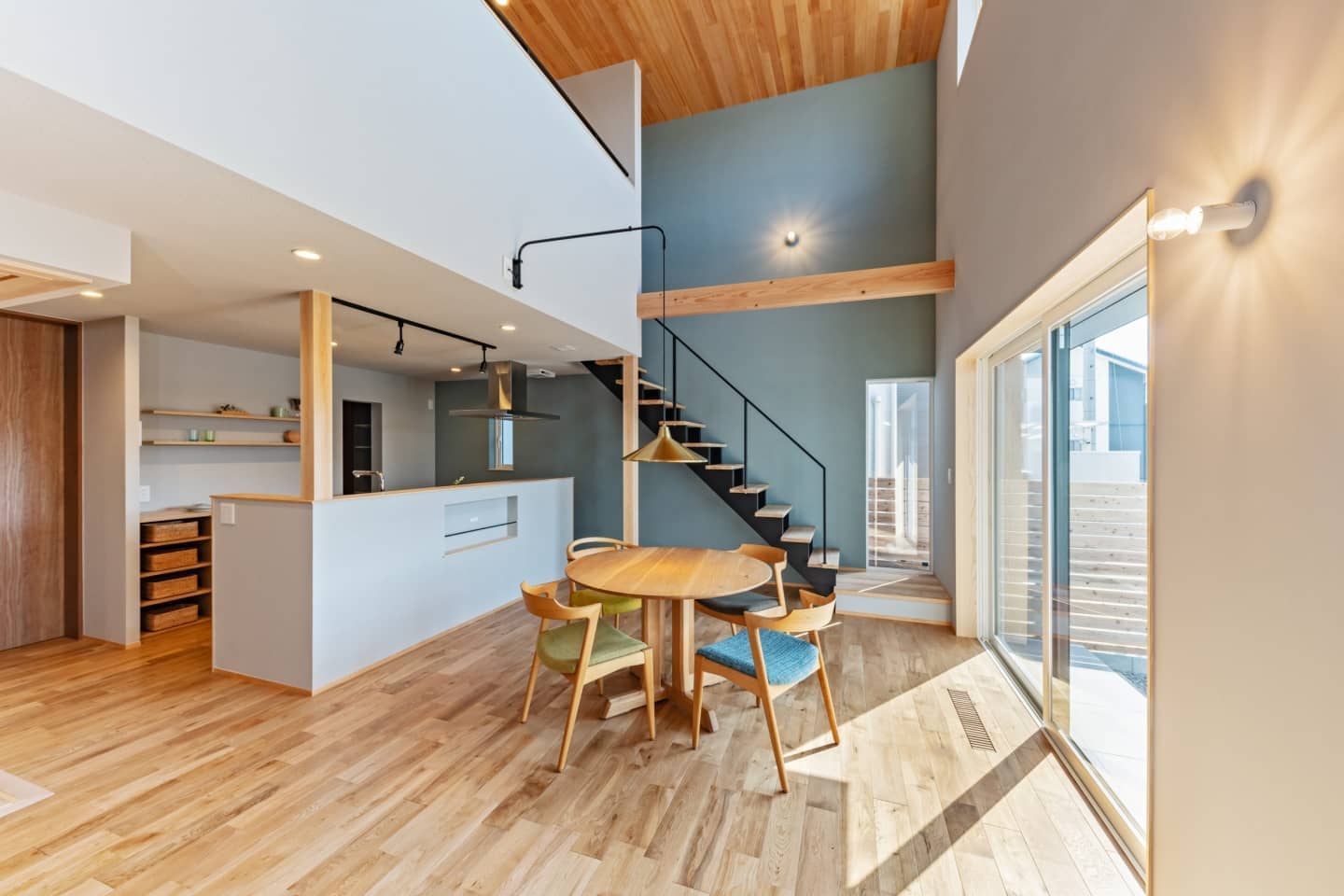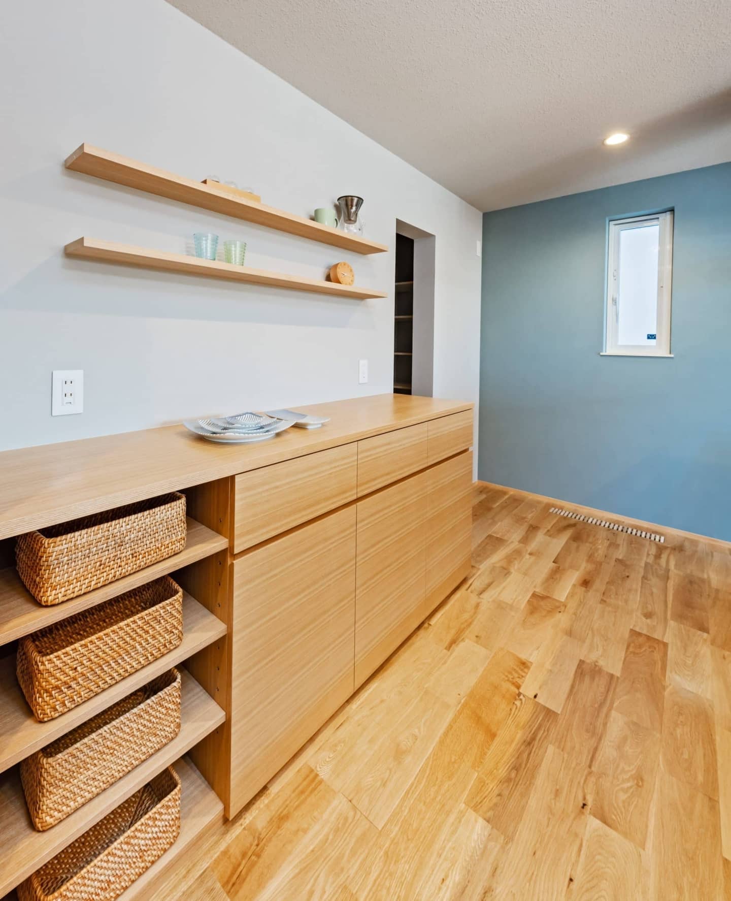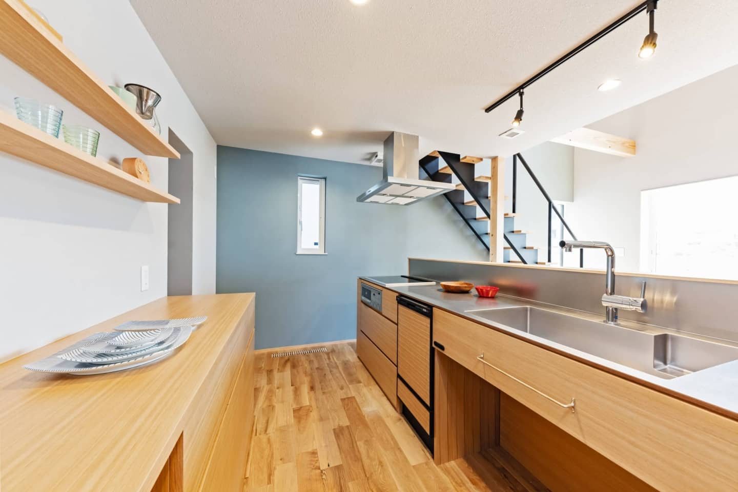 ブルーを基調としたシンプルな外観同様、屋内はグレーを基調としたシンプルな仕上がりで、こだわりの造作キッチンをLDKに配置。
