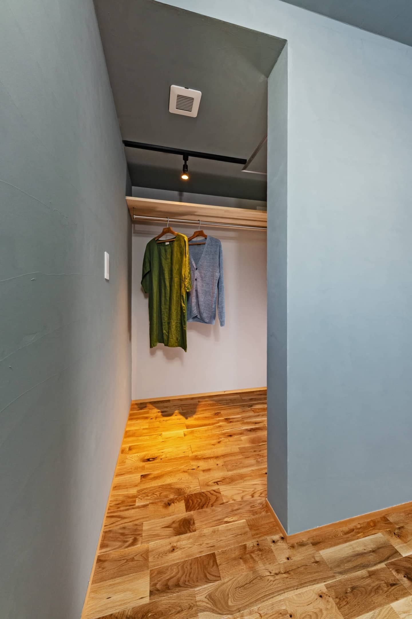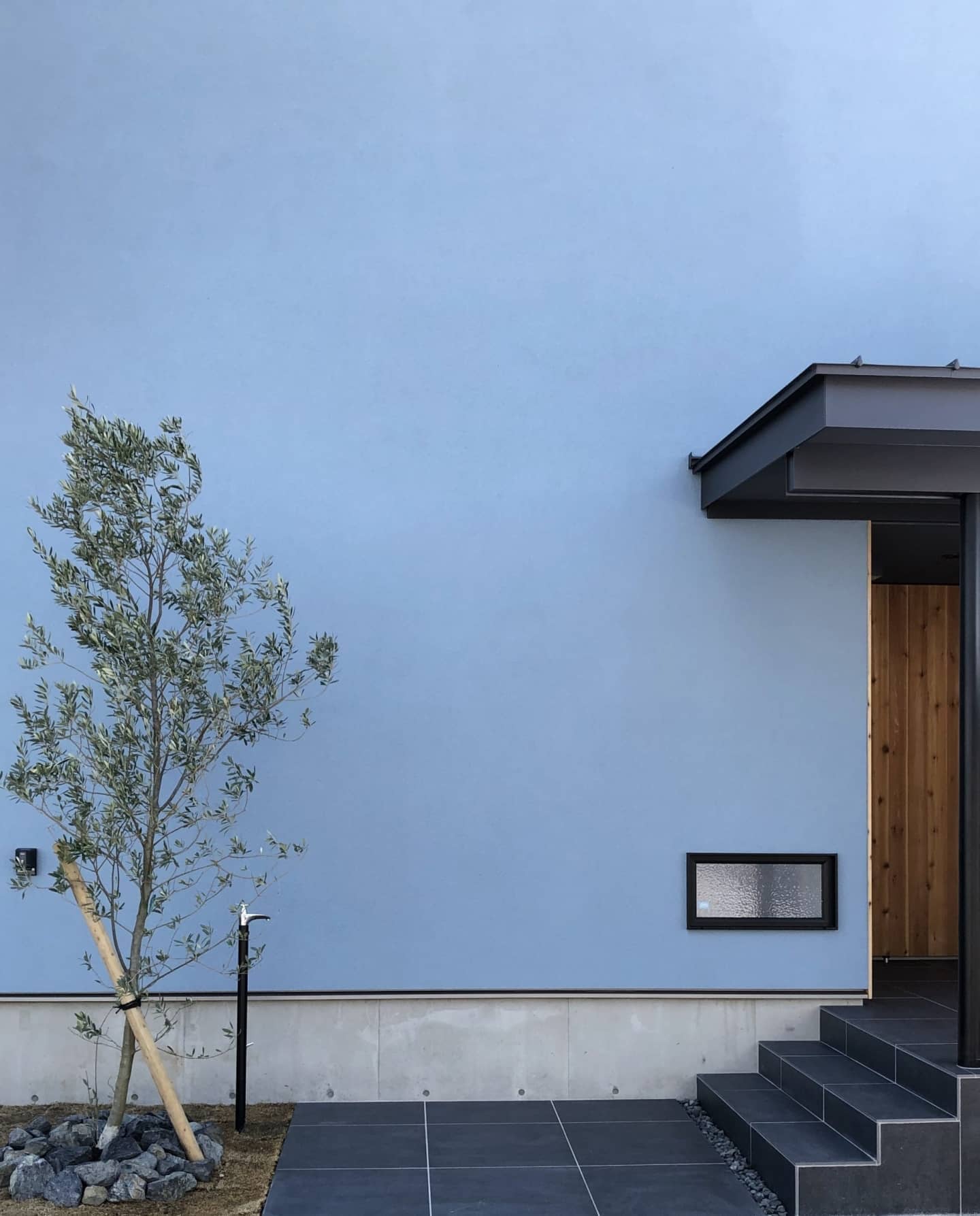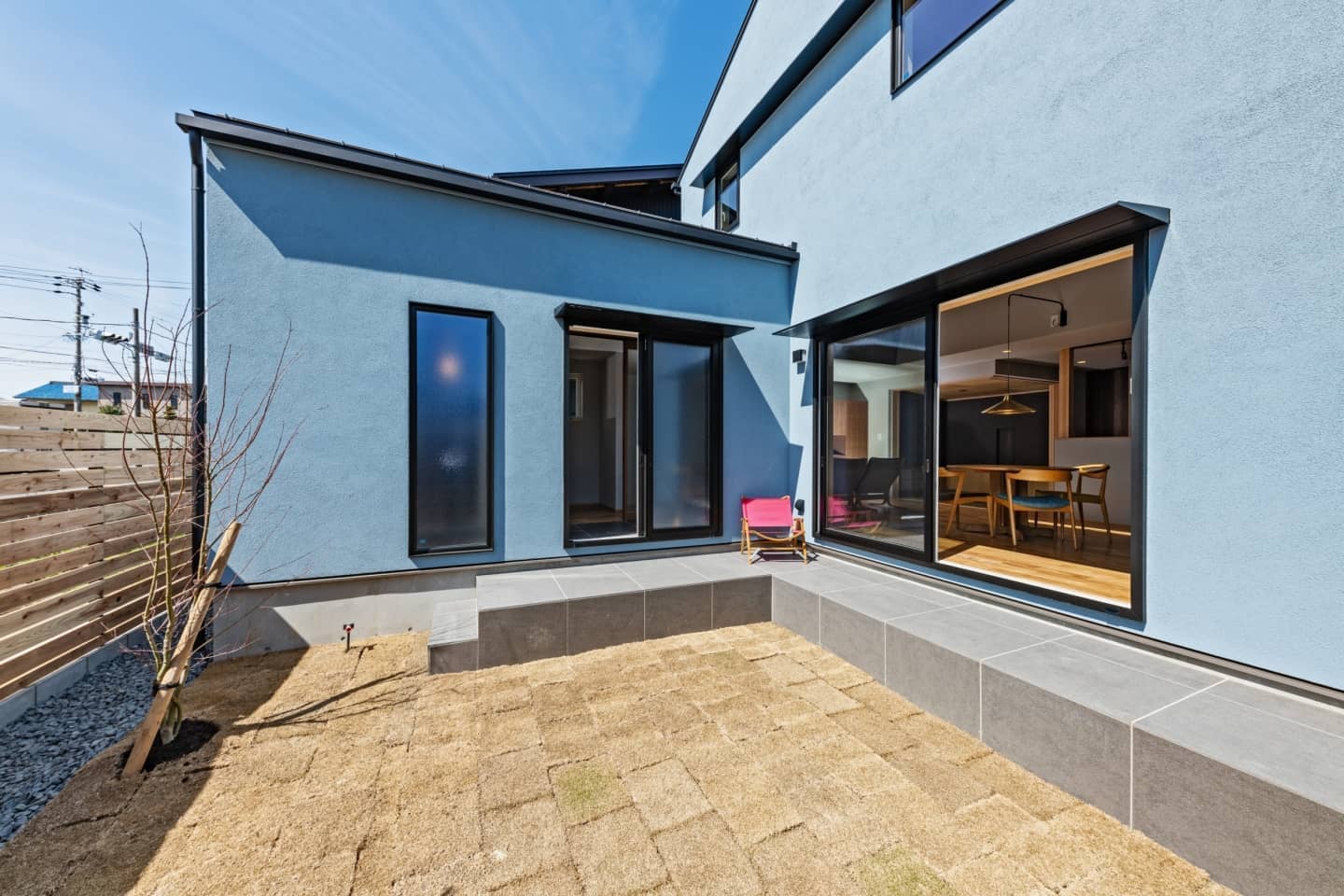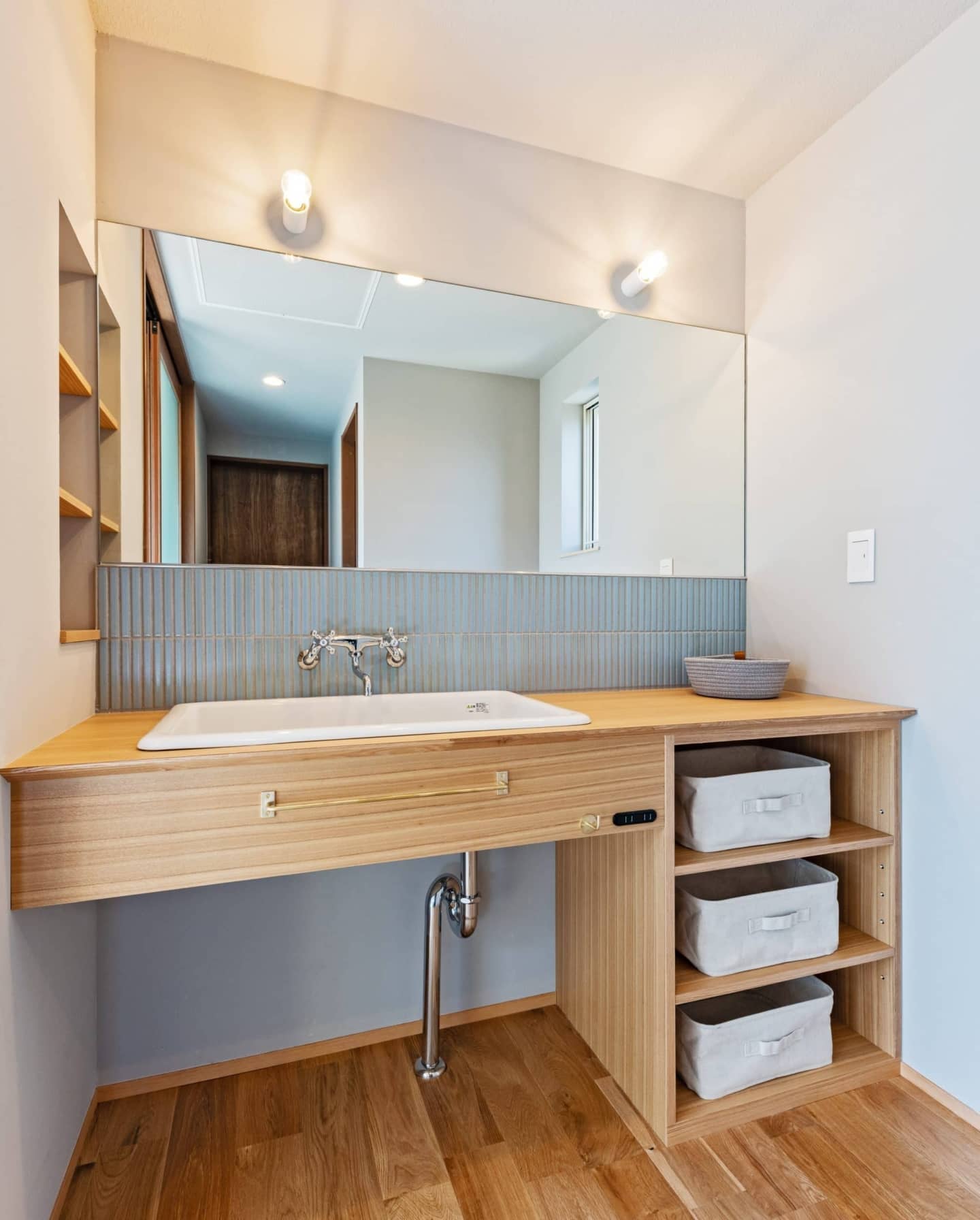 ブルーを基調としたシンプルな外観同様、屋内はグレーを基調としたシンプルな仕上がりで、こだわりの造作キッチンをLDKに配置。