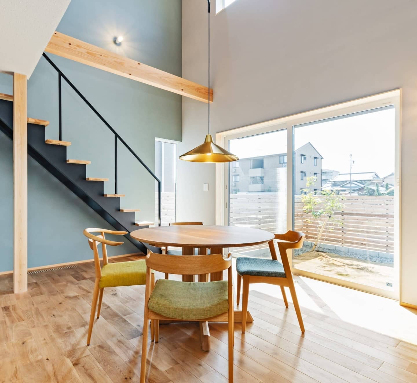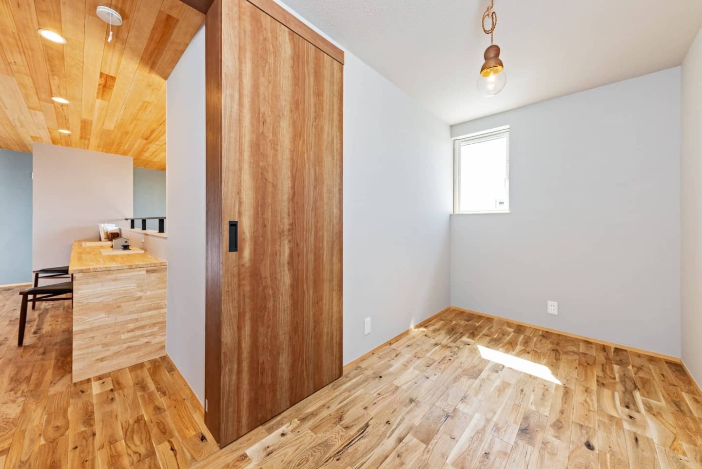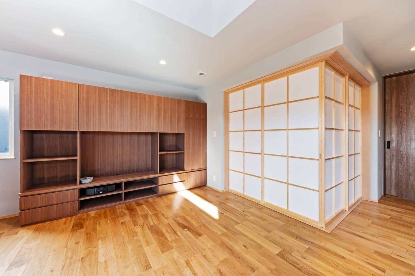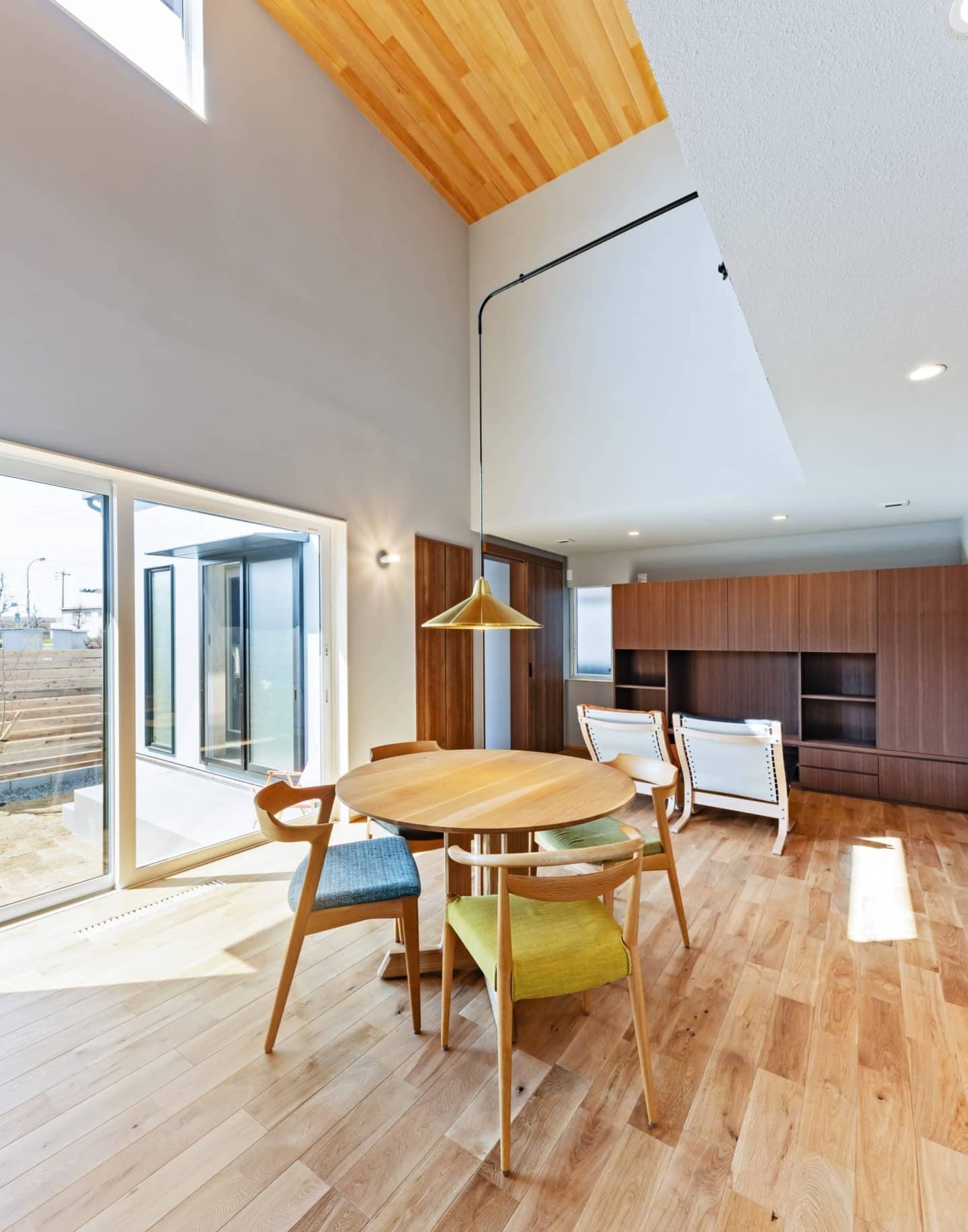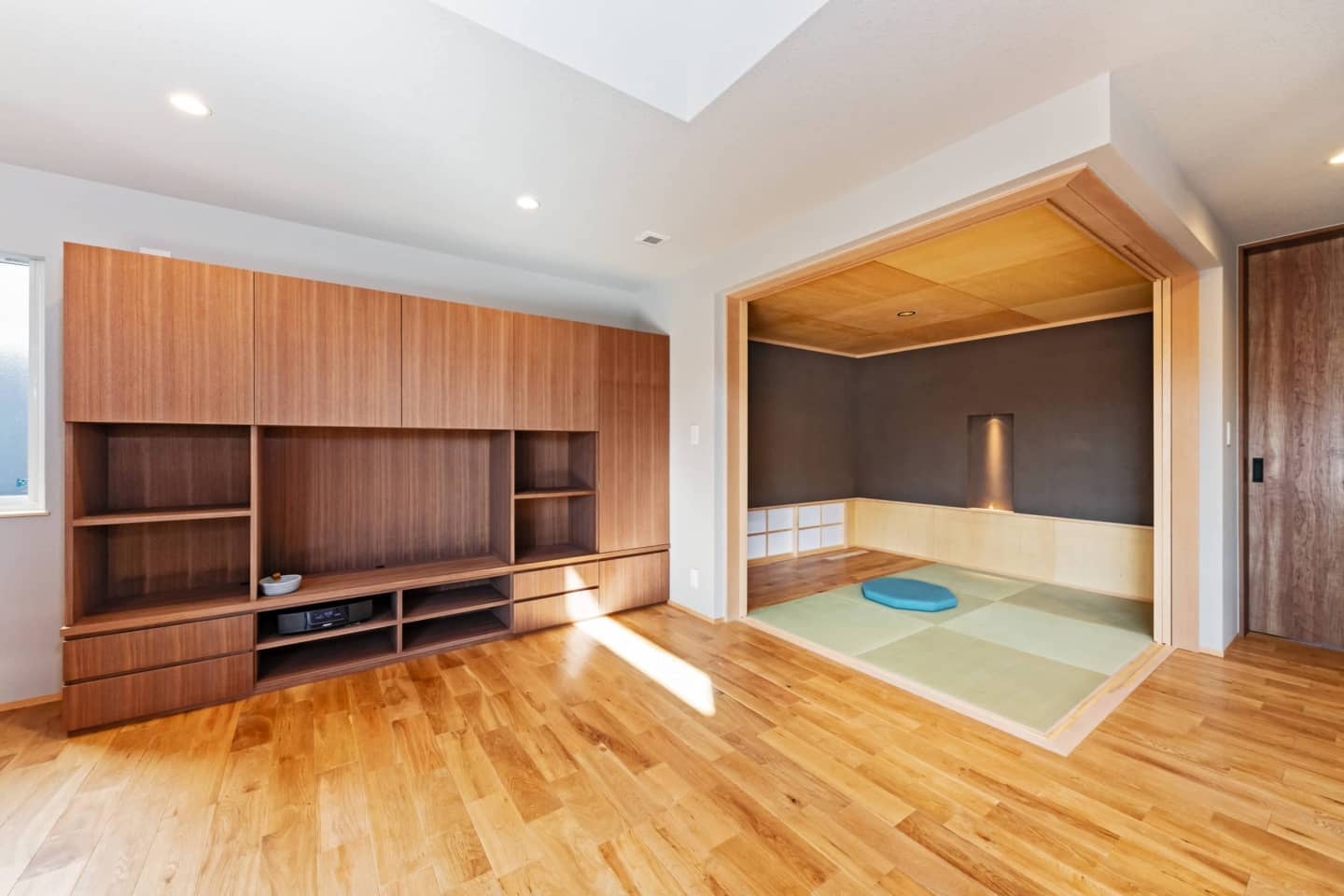 LDKに併設した和室は吹抜けとは対照的に天井高をあえて低くし、落ち着きのある空間となりました。