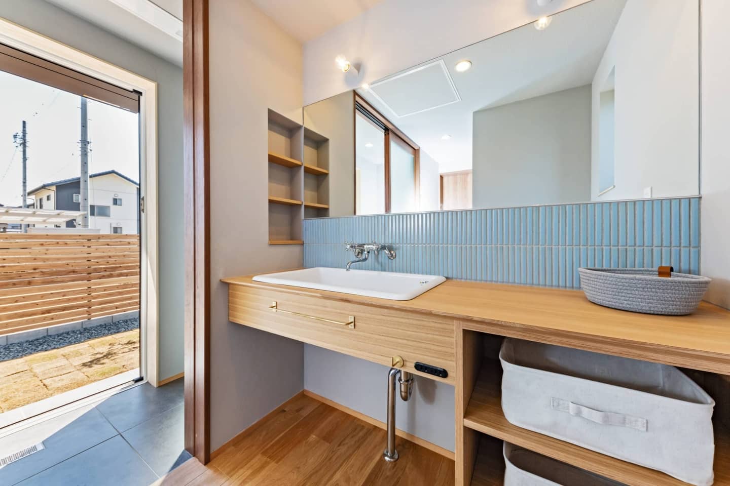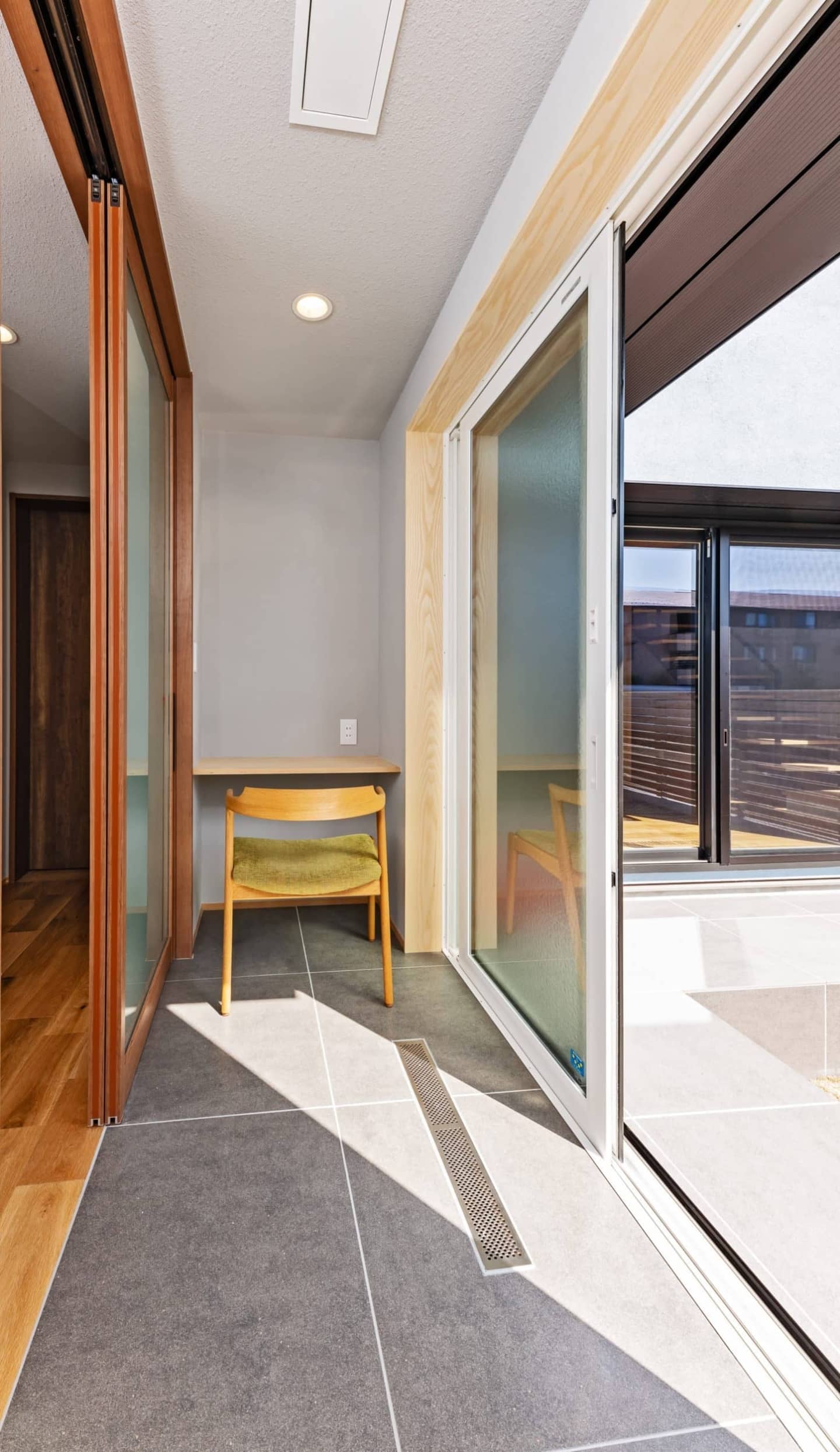 洗面室からすぐのサンルームは日当たりも◎で洗濯物もたくさん干すことができます。そのままデッキに出て外干しも楽々です。