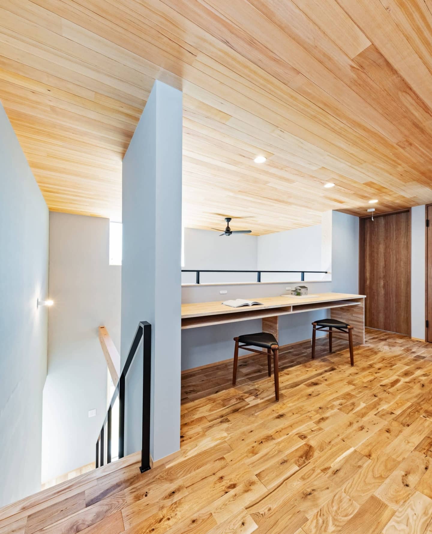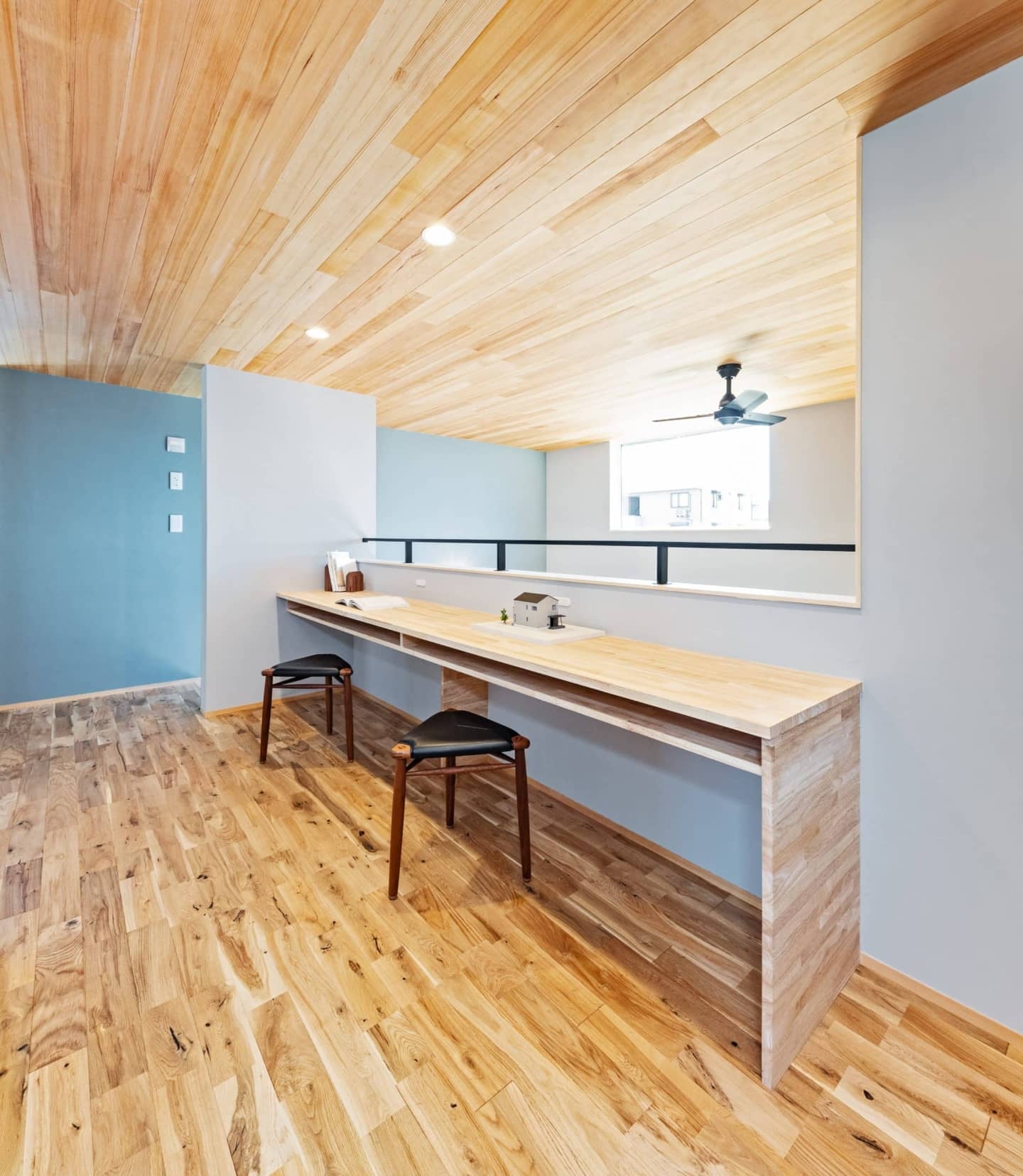 南の大きな吹抜けからは、採光を確保しながら2階のホールのスタディカウンターを通じて、1階リビングに繋がるダイナミックな間取りです。