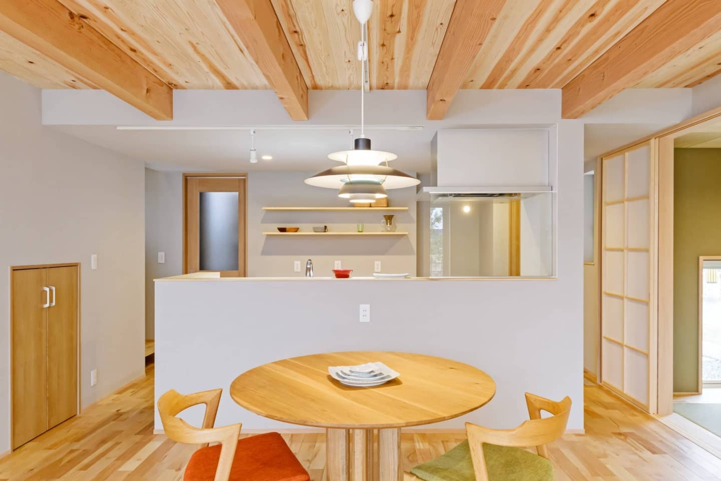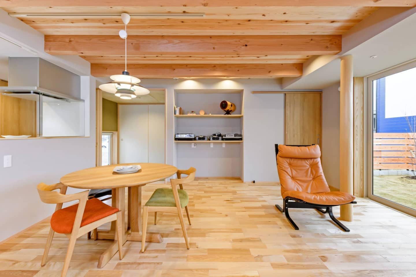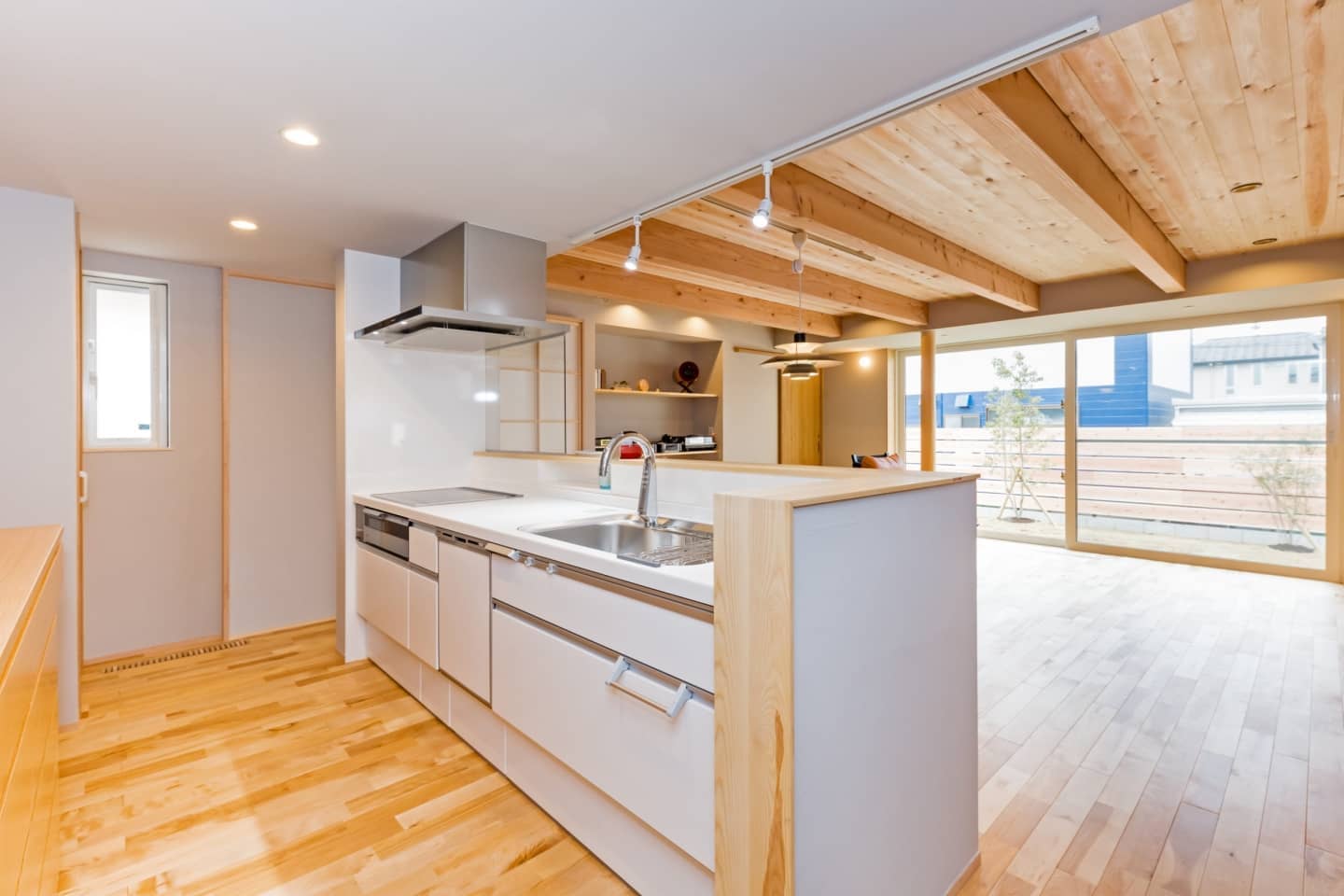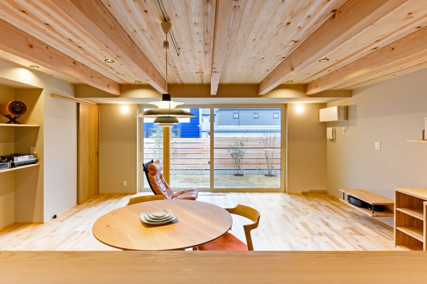 LDKは木の質感溢れるデザインで、階高はおさえてありますが大開口のオーダーサッシで広がりを持たせています。