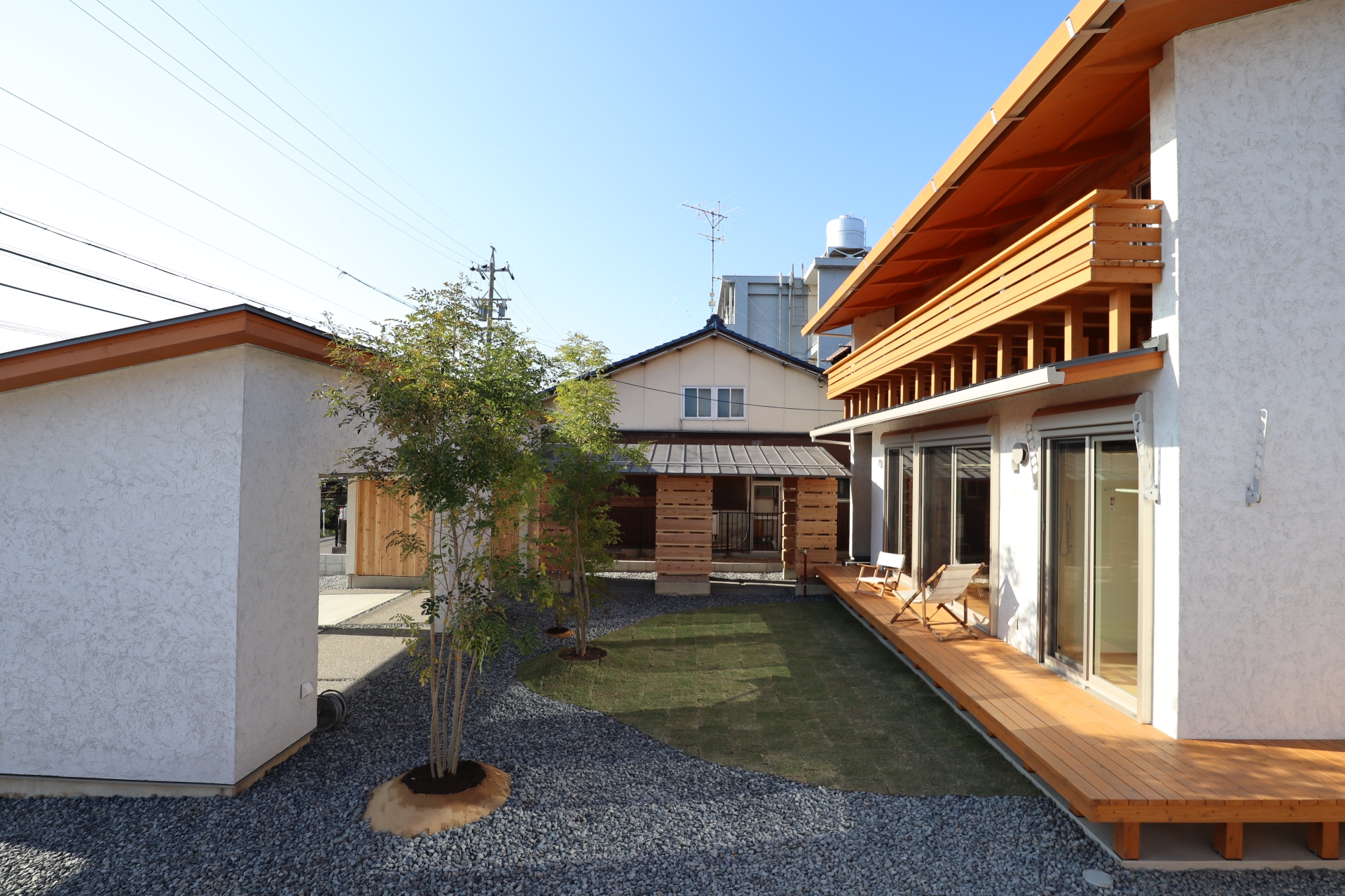 玄関からガレージまで屋根付きのアプローチに、ガレージには大容量外部収納も設置。