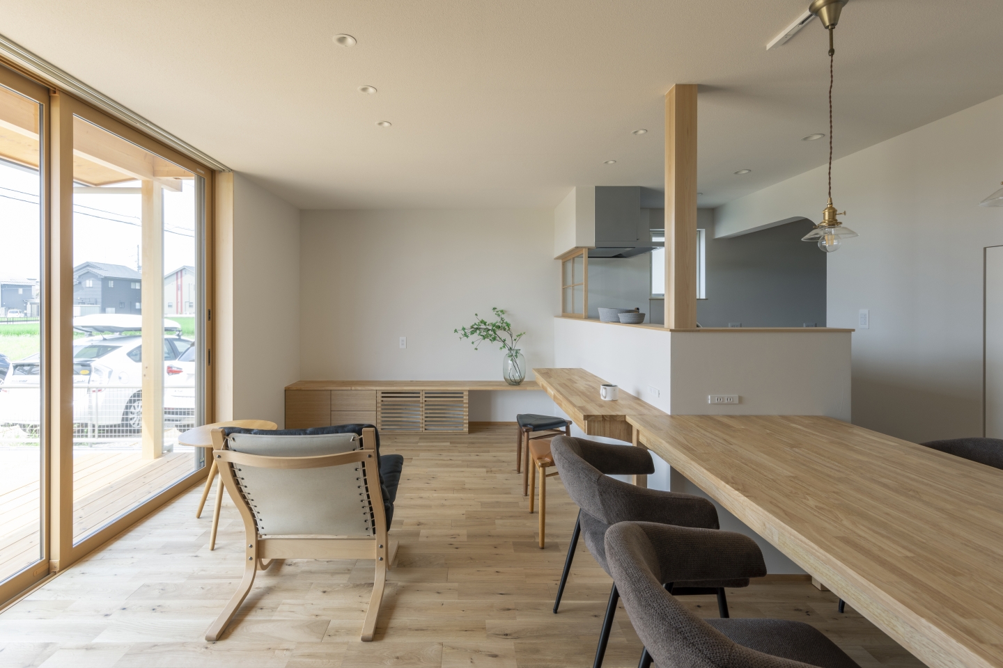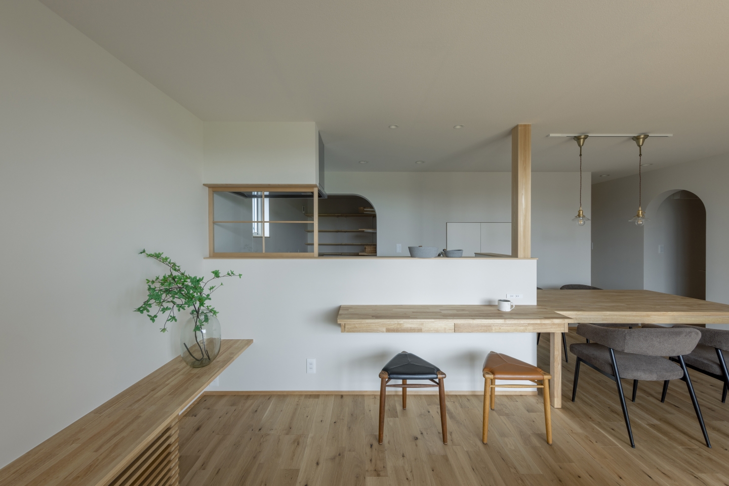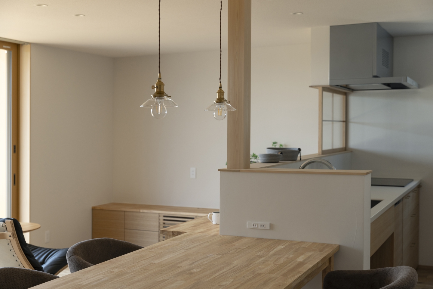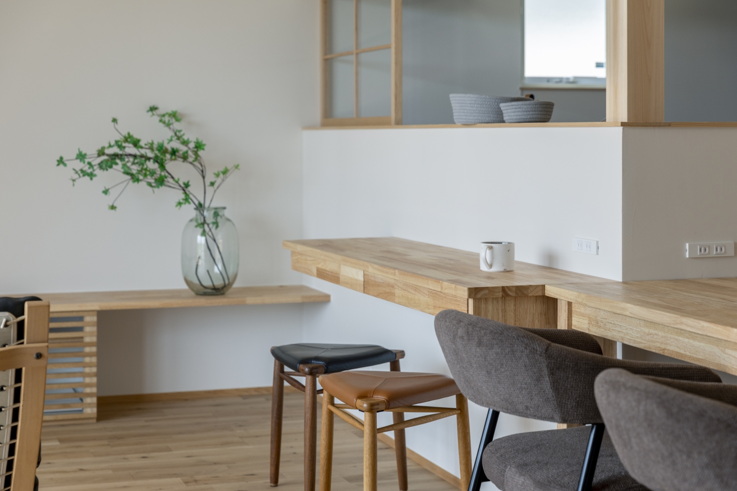 造作のダイニングテーブルは作業スペースと連続させることによりシンプルでオリジナリティーのある空間になりました。
