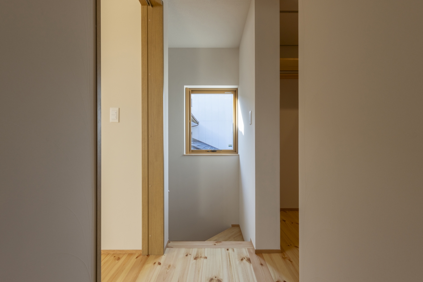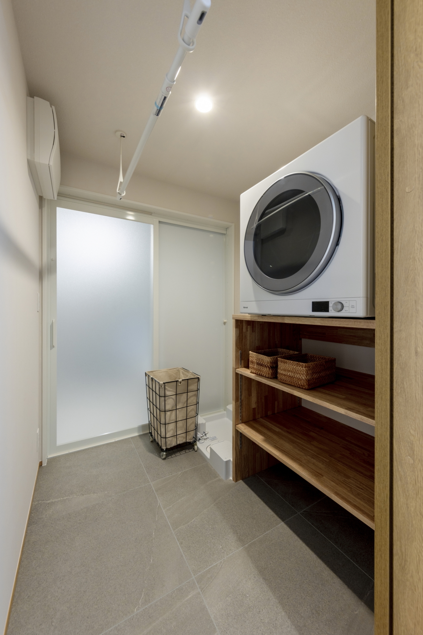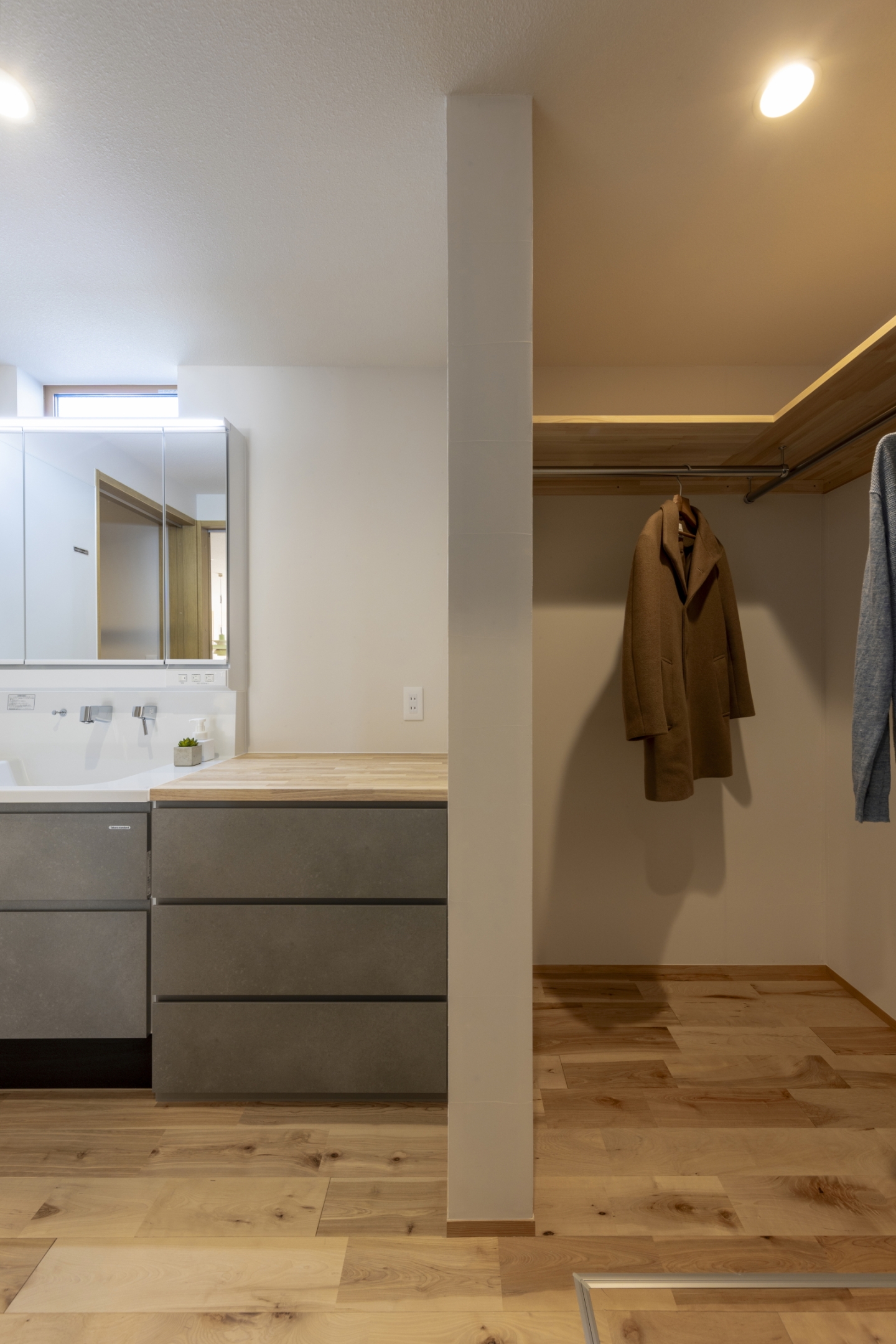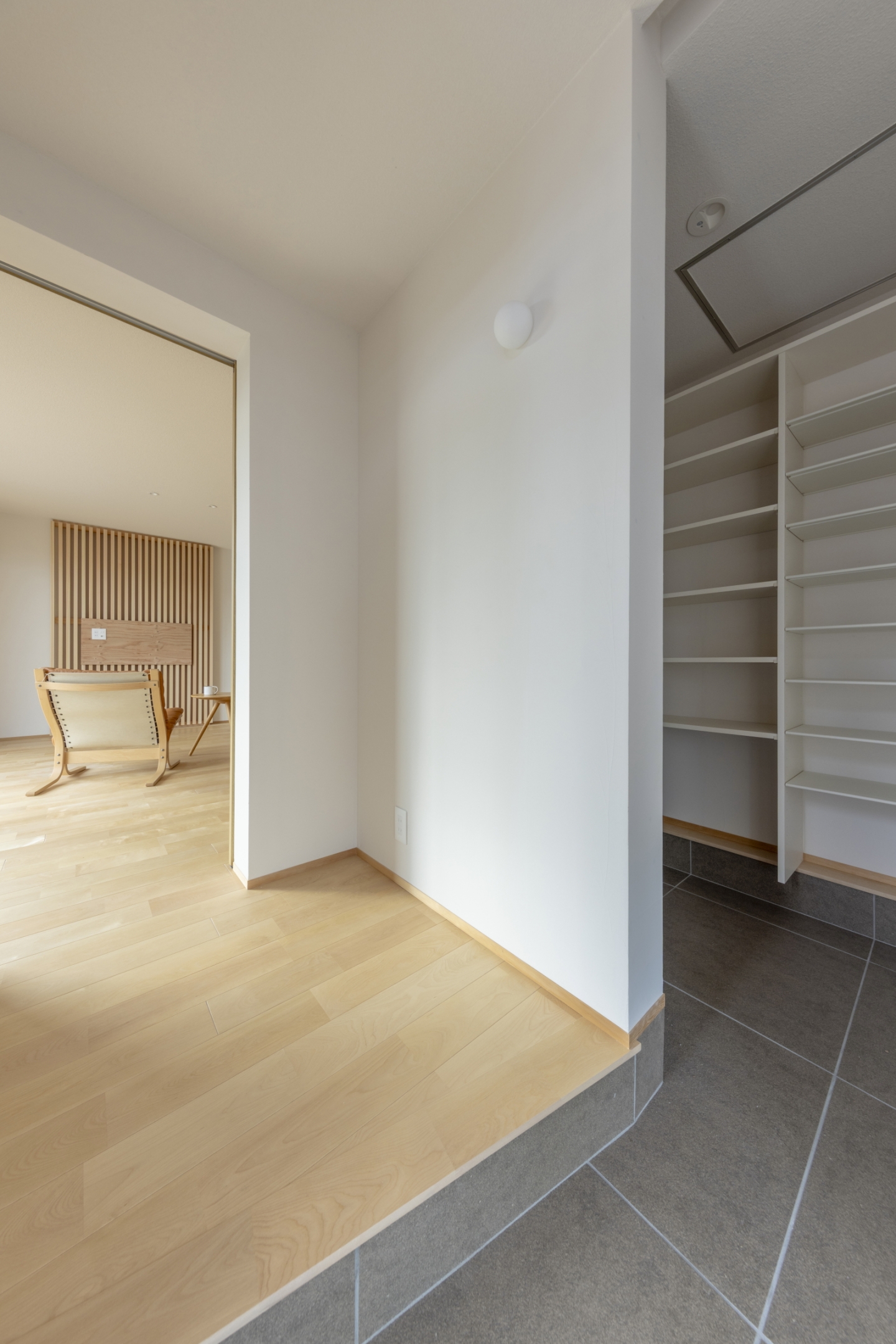洗面室に隣接してウォークインクローゼットを設けたので、短い動線で楽に家事を行うことができます。来客時などはロールスクリーンを下すと目線を遮ることができます。