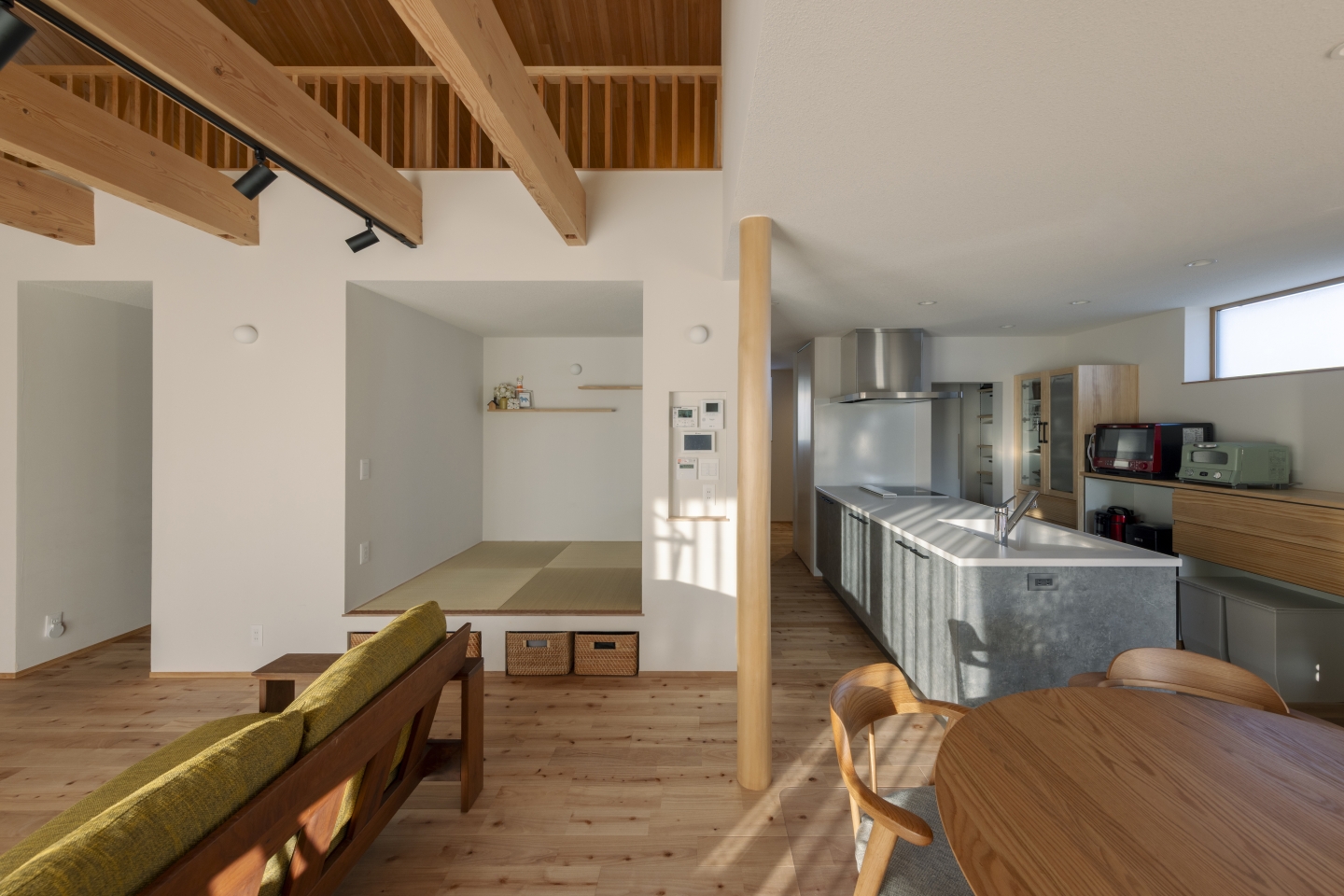 リビングは2階と繋がった勾配天井としたので広々とした空間になりました。