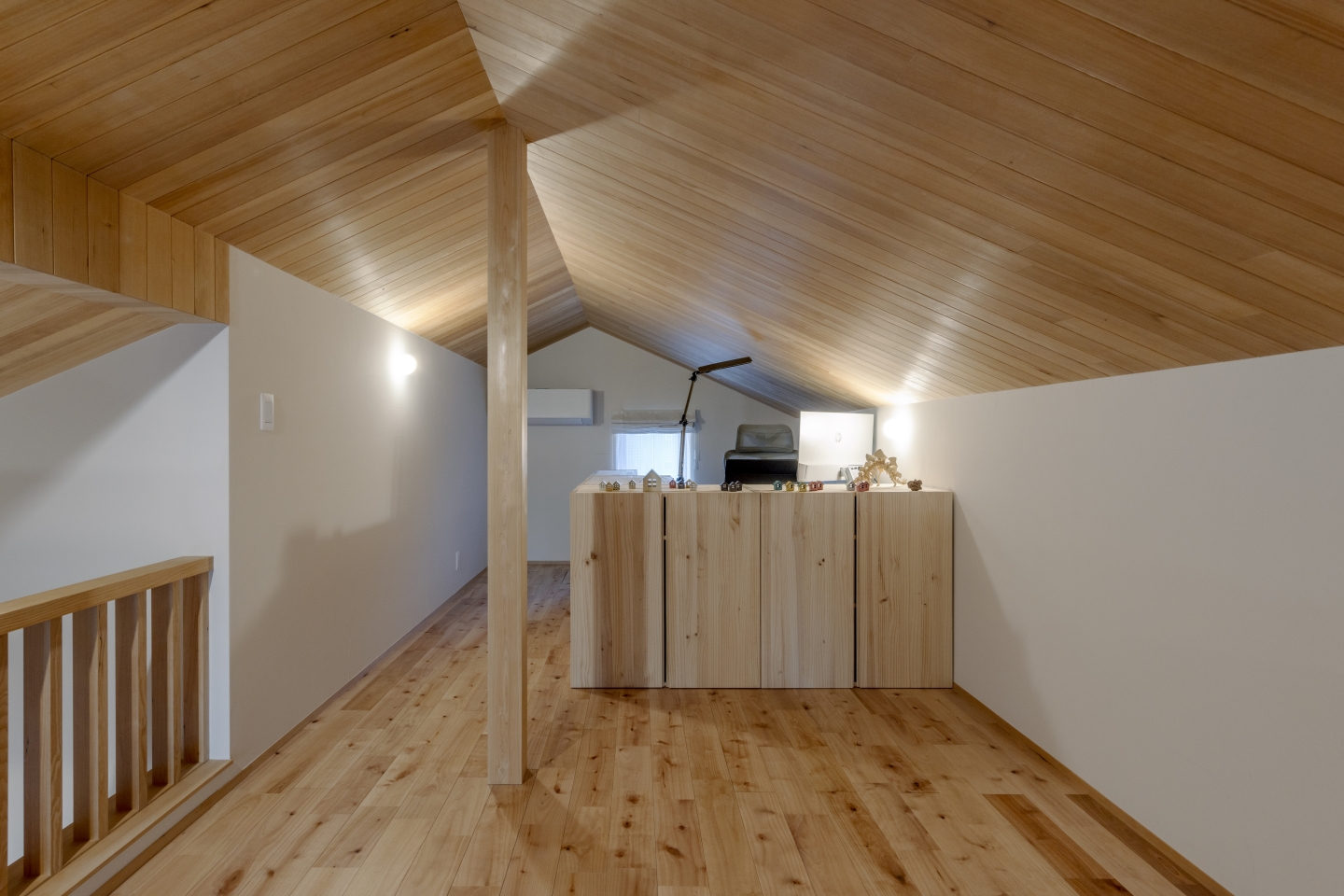 2階は大きな一つの空間としましたが、棚や植物なので仕切り、個室としても活用できる計画としました。
