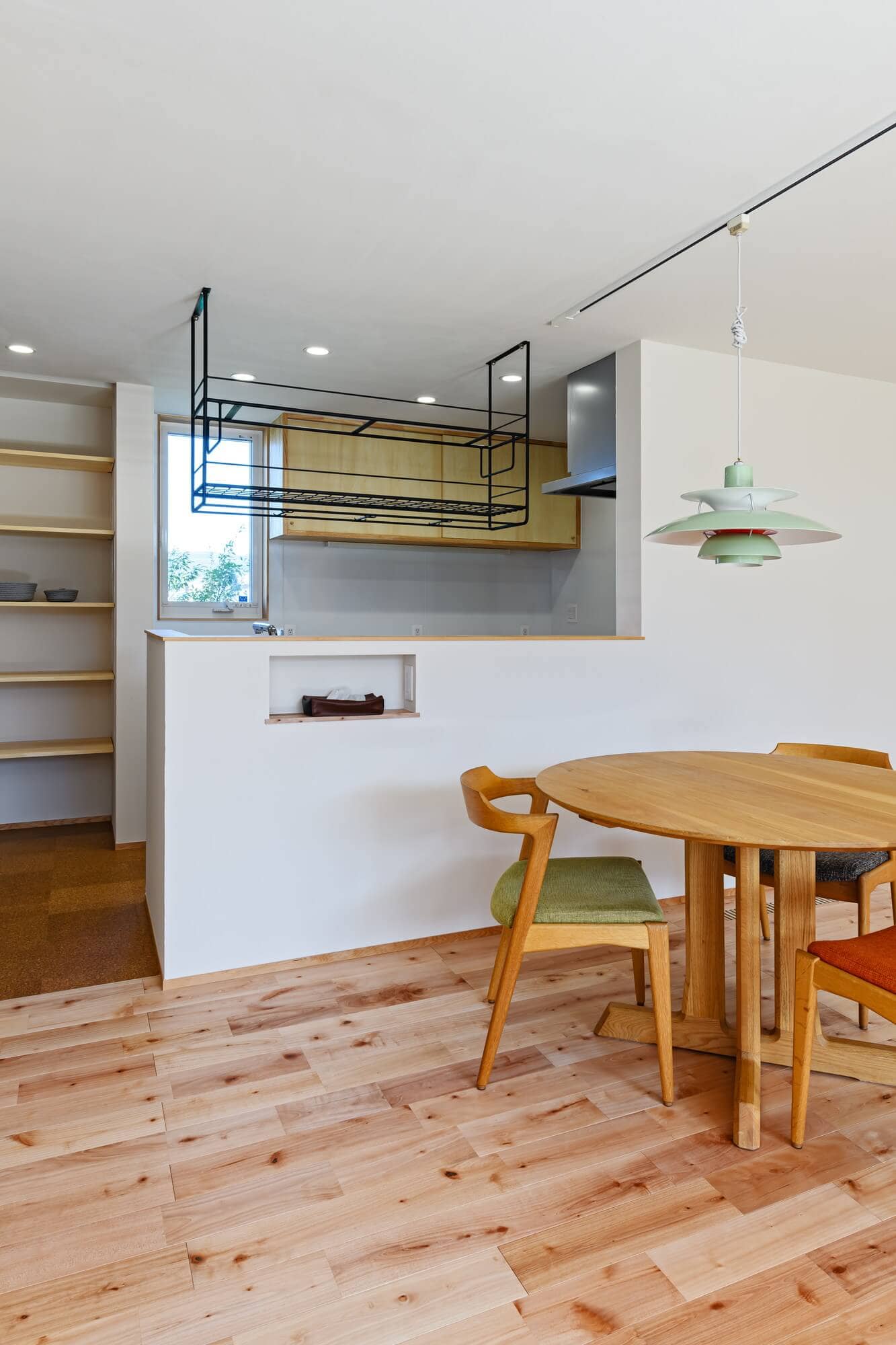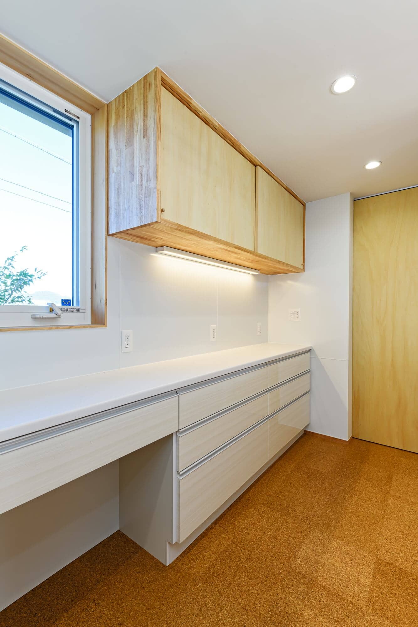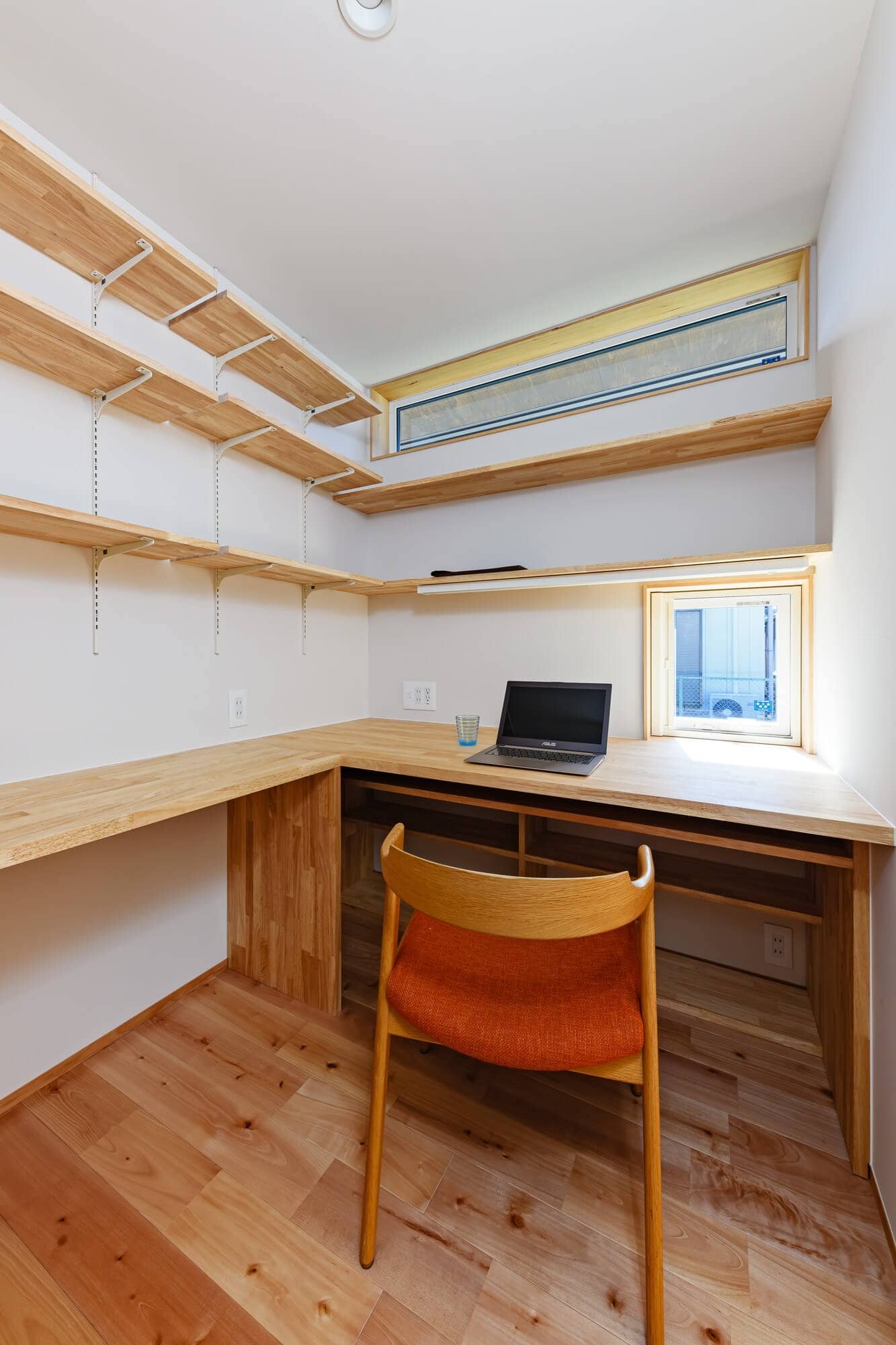 リビングには、家族の気配を感じつつ作業に集中できるワークスペースを配置。リモートワークに大活躍です。