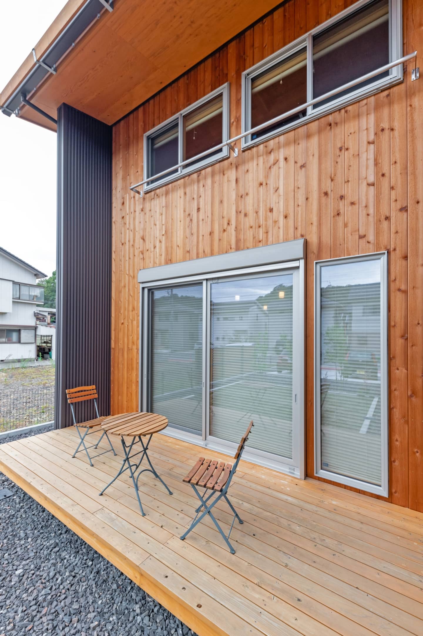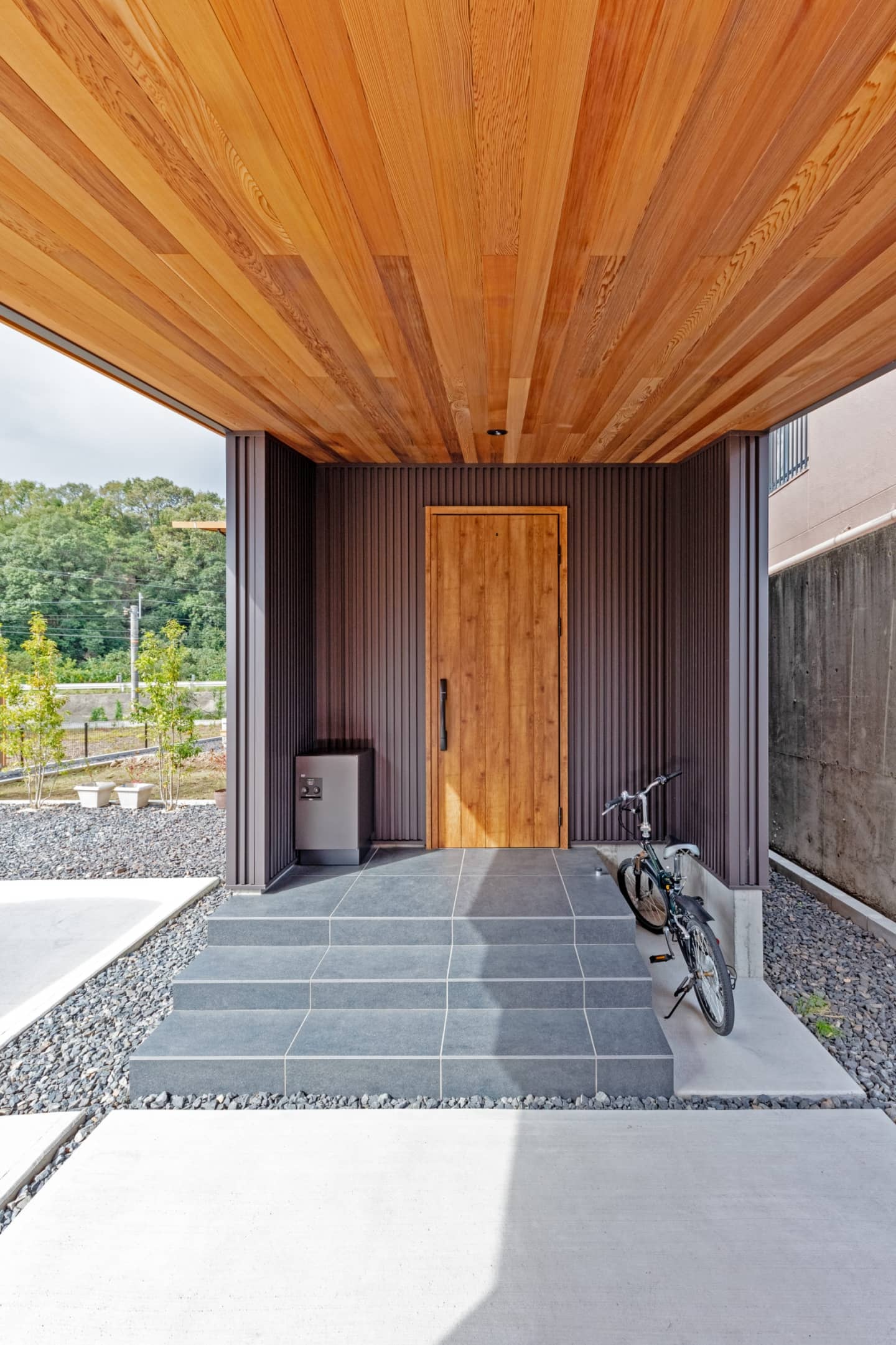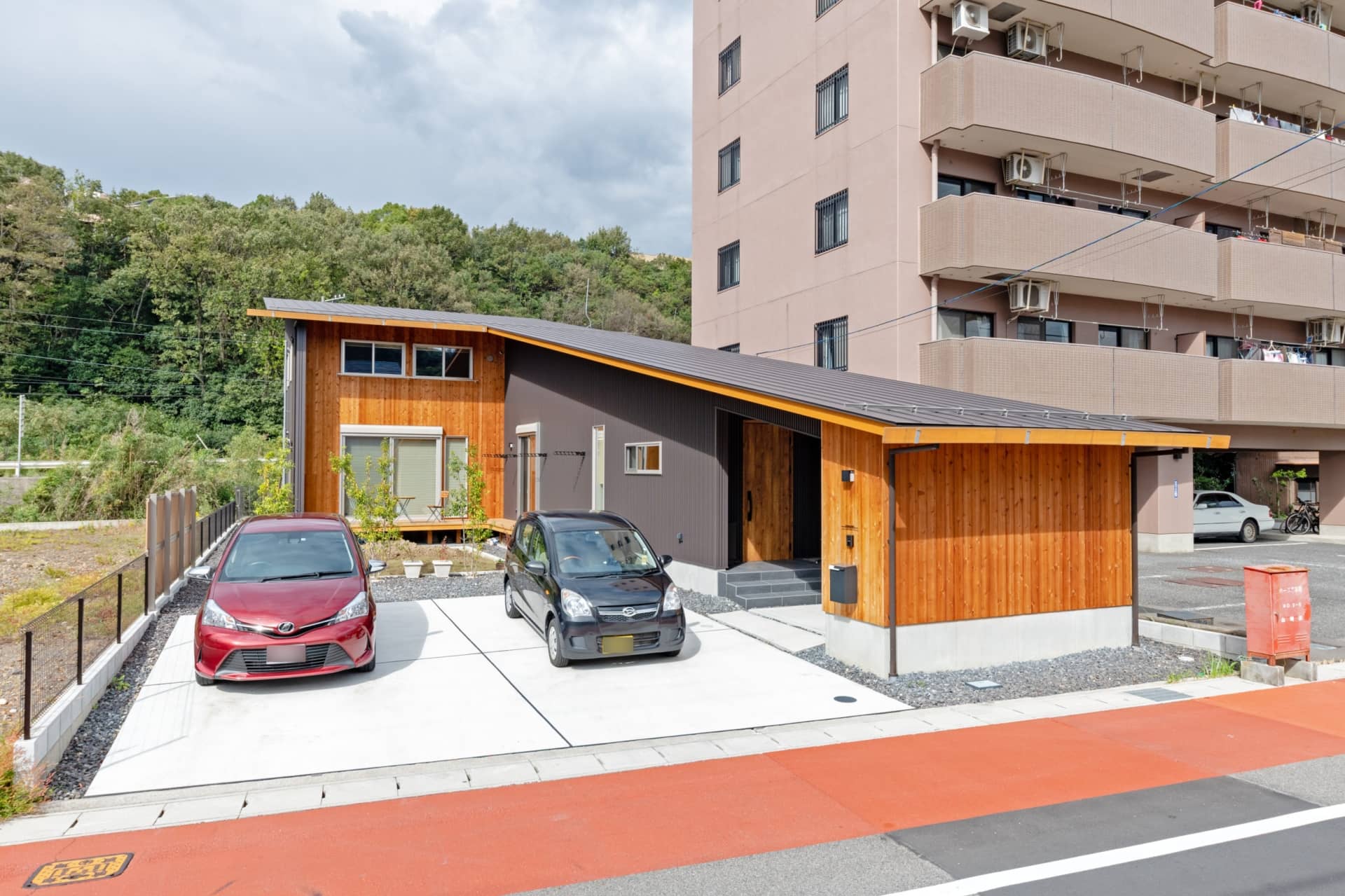 こちらのお住まいは2世帯住宅です。南北に長い敷地を利用した大きな片流れが特徴的で、屋根の長さは約27mを超えるものとなっています。