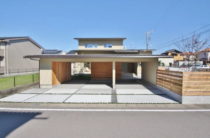 ガレージ付です。モルタル仕上げの壁には庭の木々を眺められるようベンチシートをデザイン。