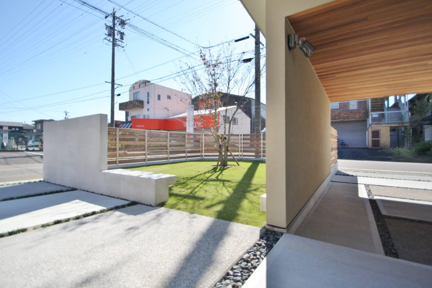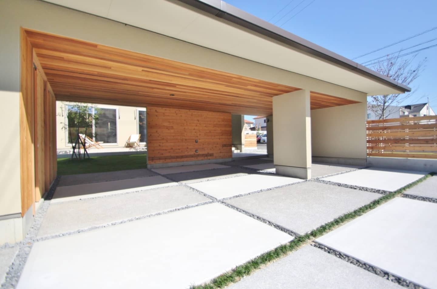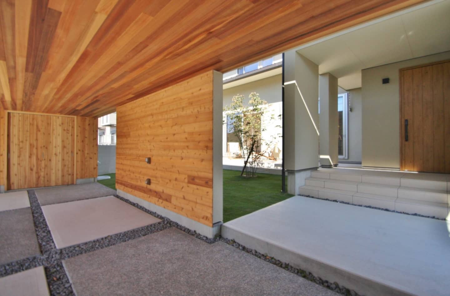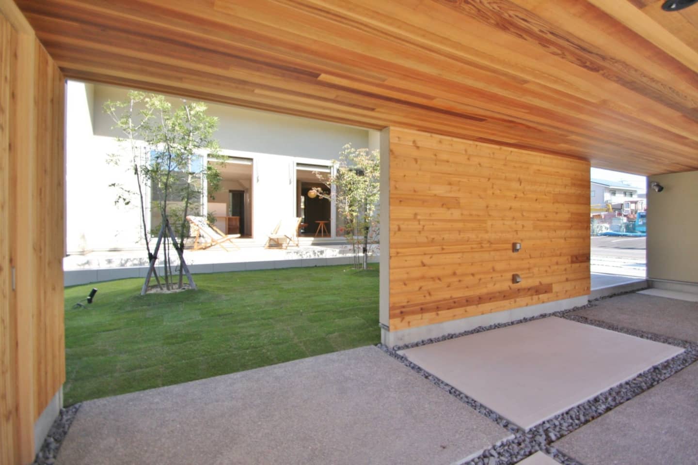 ガレージ付です。モルタル仕上げの壁には庭の木々を眺められるようベンチシートをデザイン。