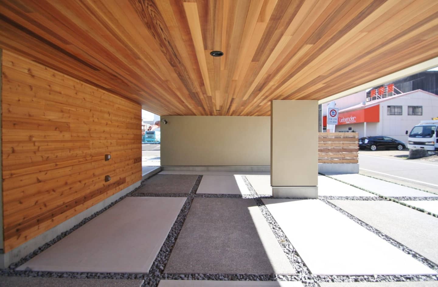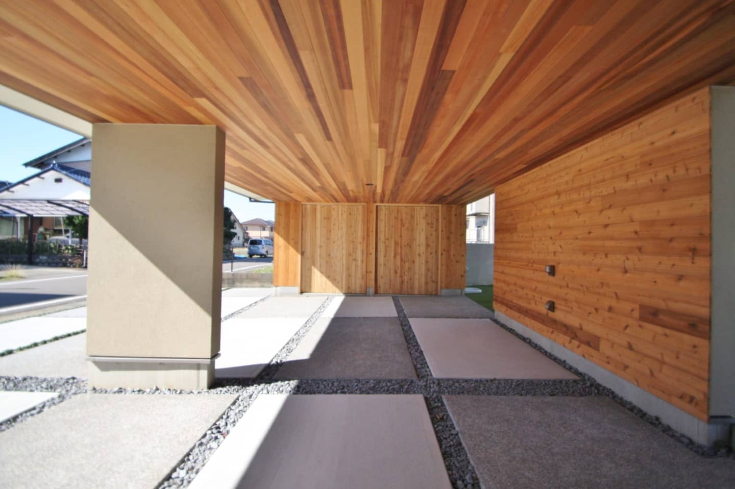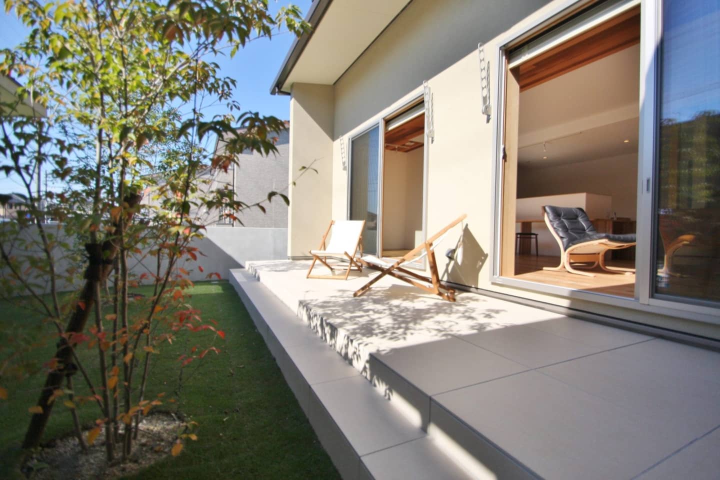 ガレージ付です。モルタル仕上げの壁には庭の木々を眺められるようベンチシートをデザイン。