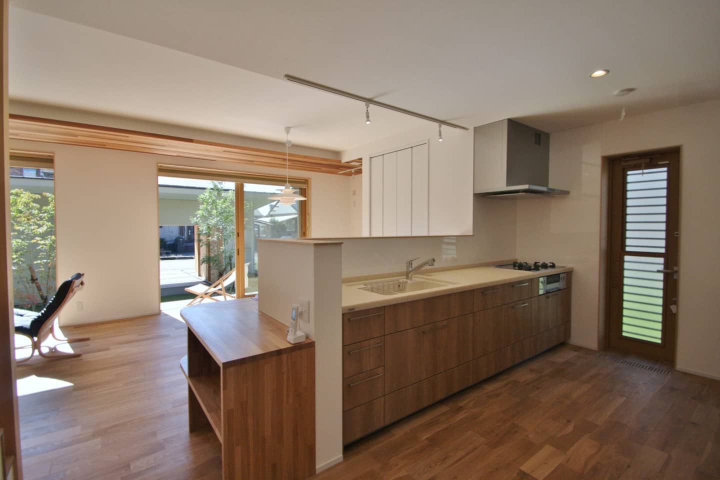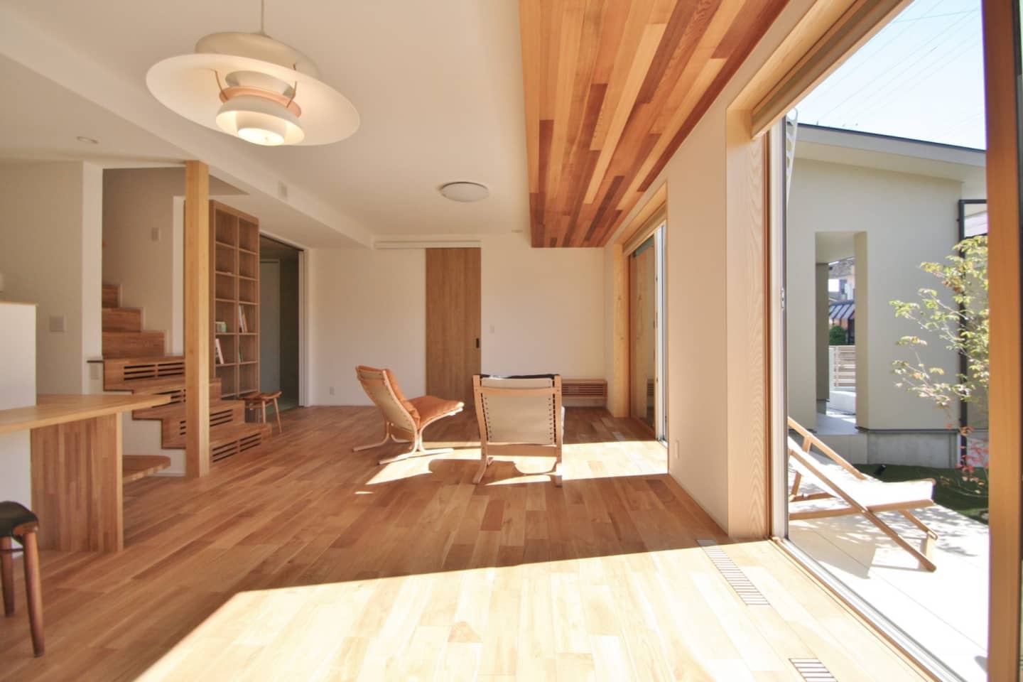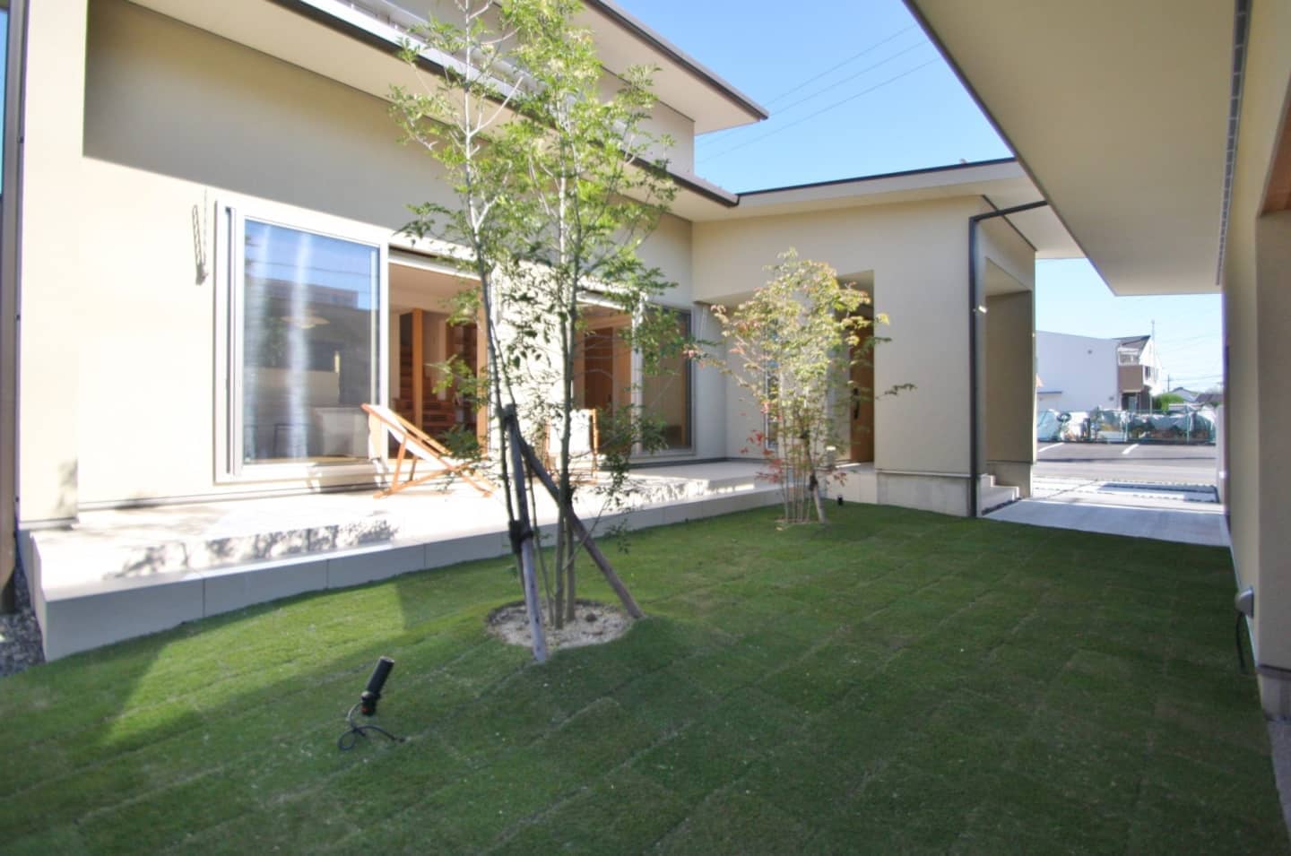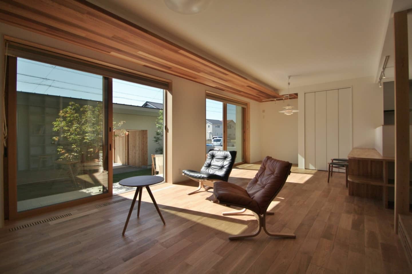 ガレージ付です。モルタル仕上げの壁には庭の木々を眺められるようベンチシートをデザイン。