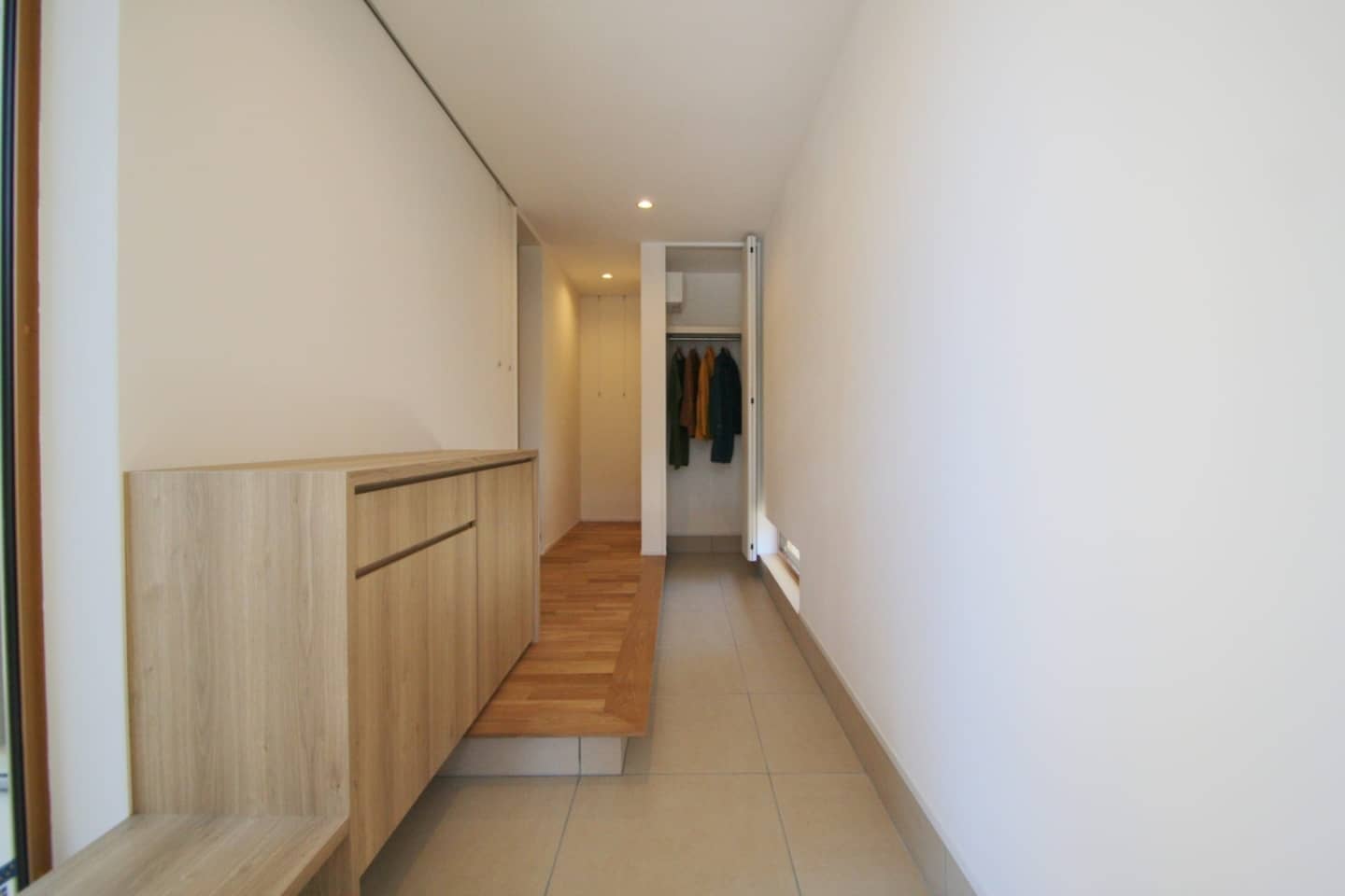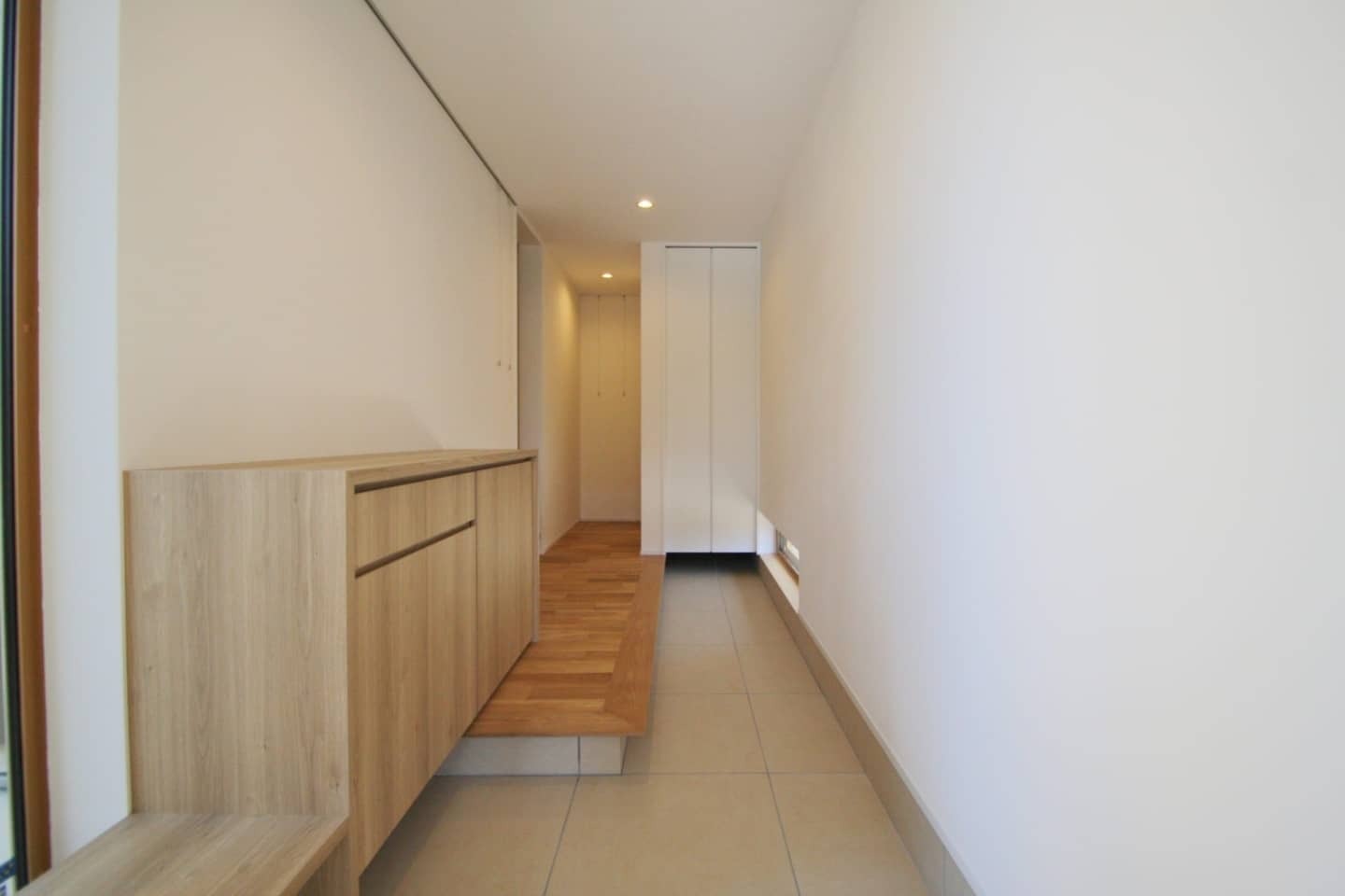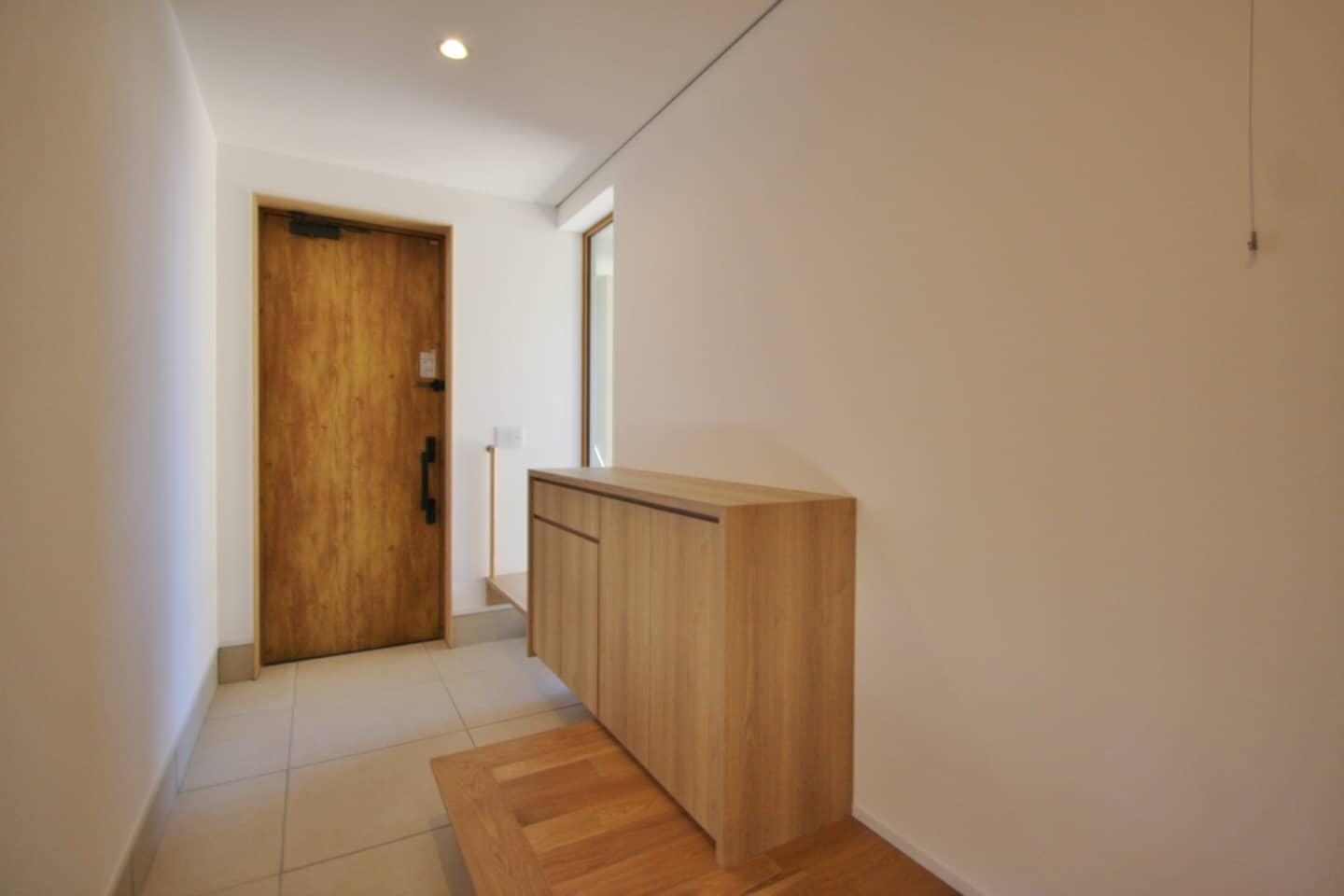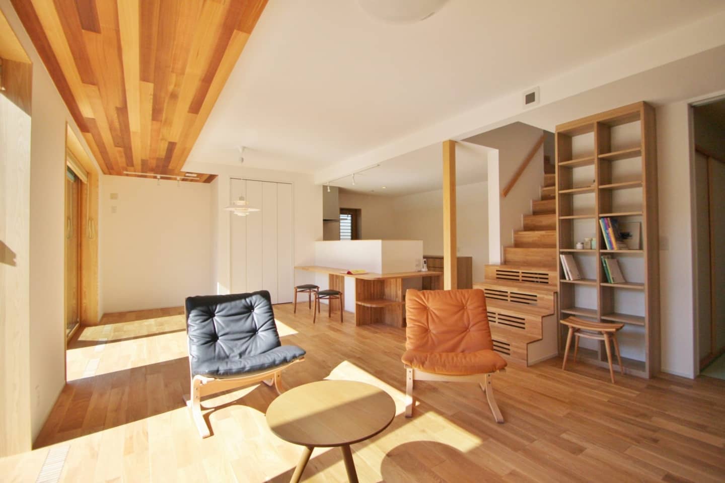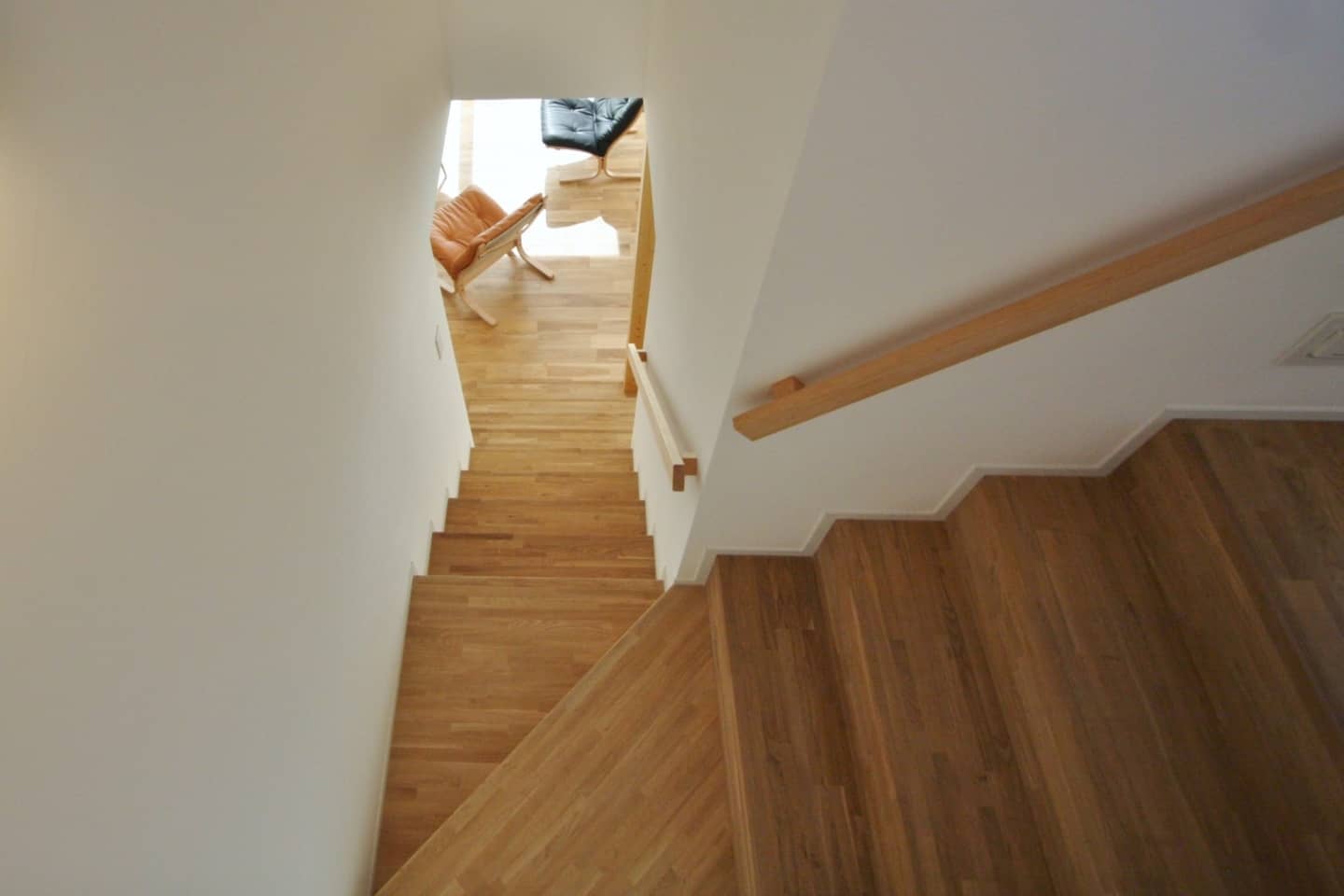 階段の手すりは既製品ではなく、エムズの新しい標準仕様の無垢の木の手すりです。