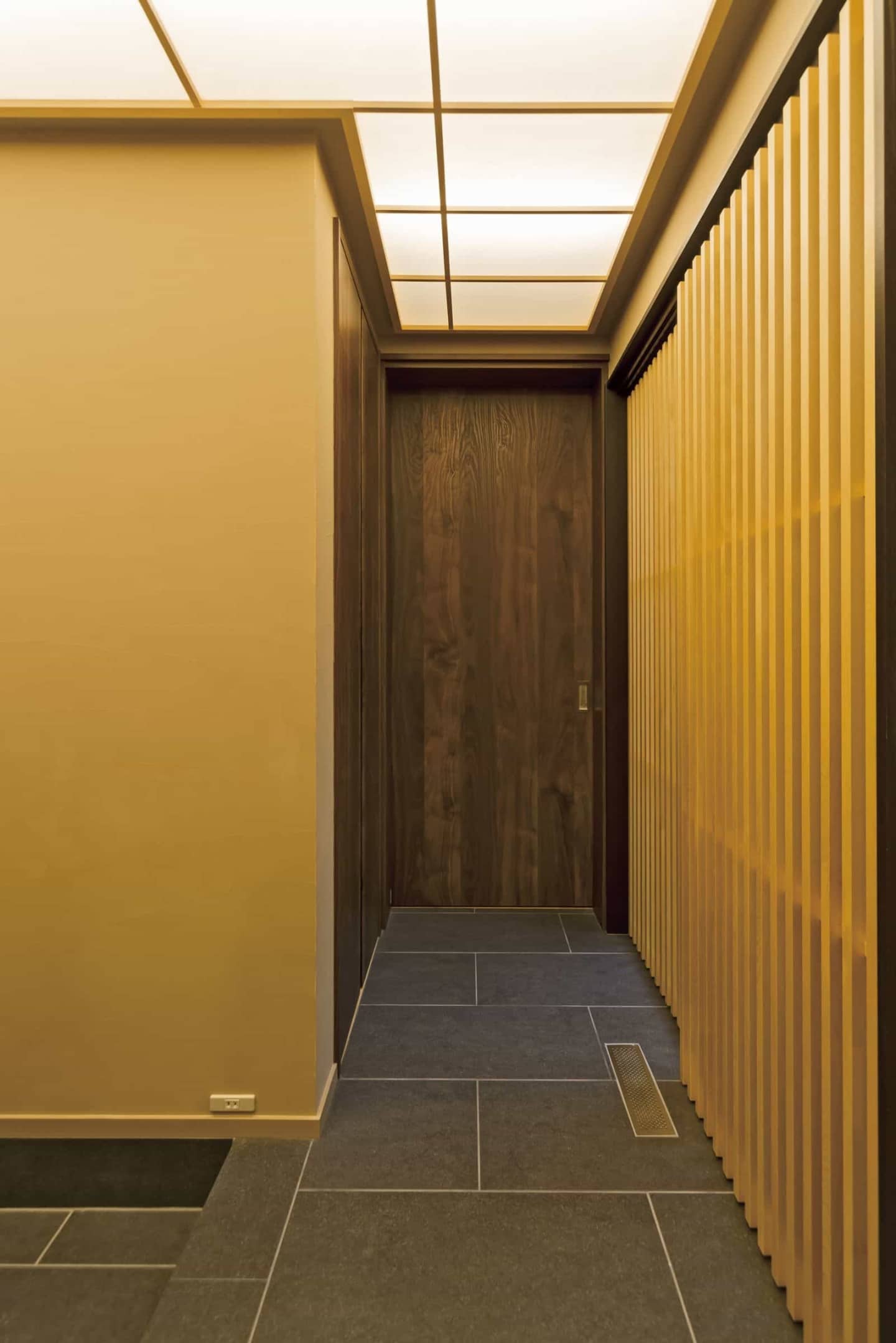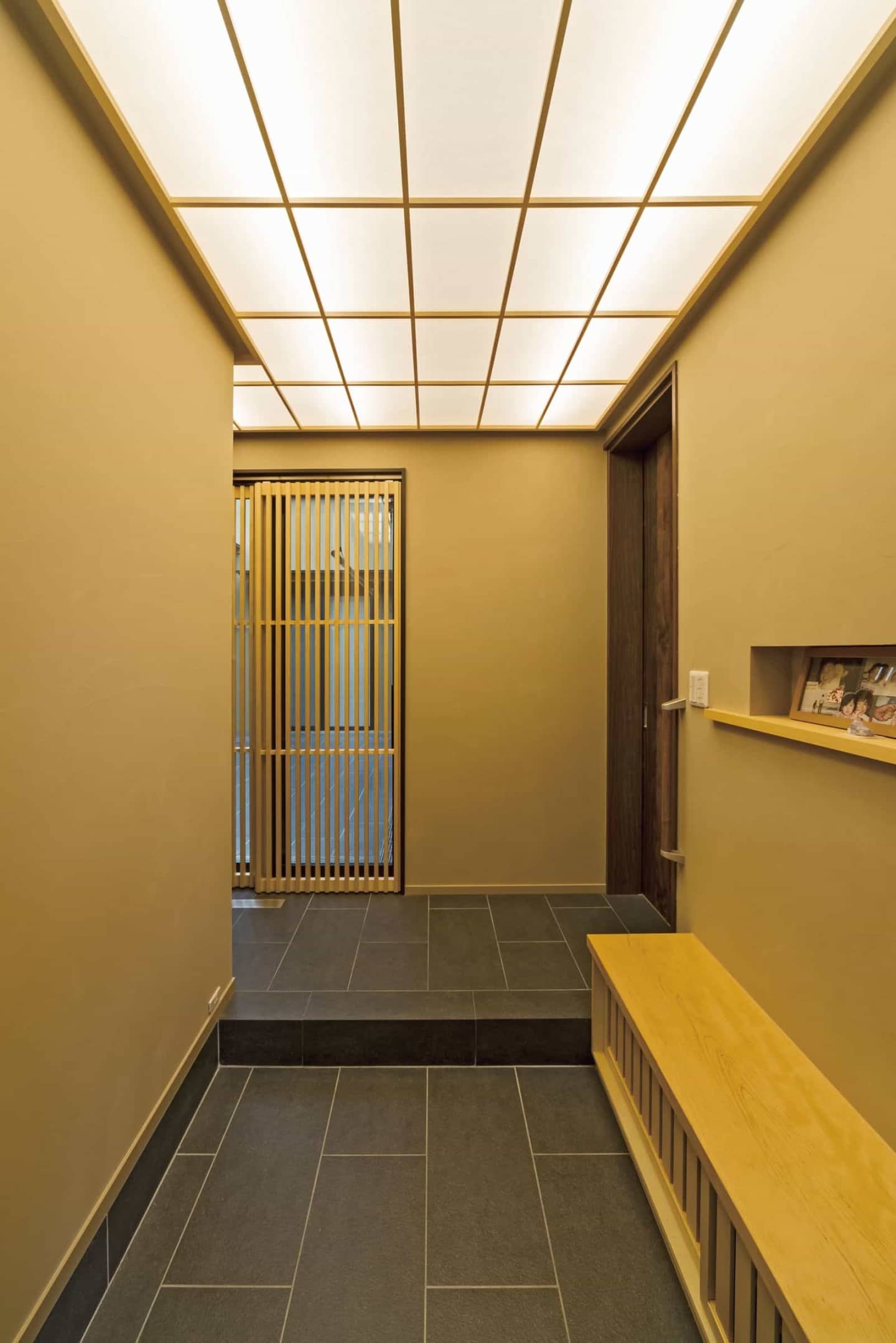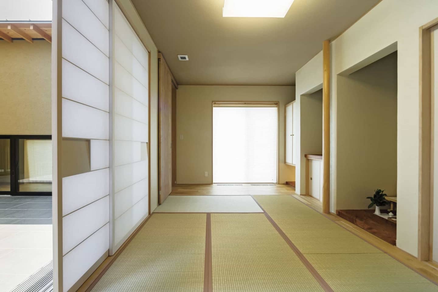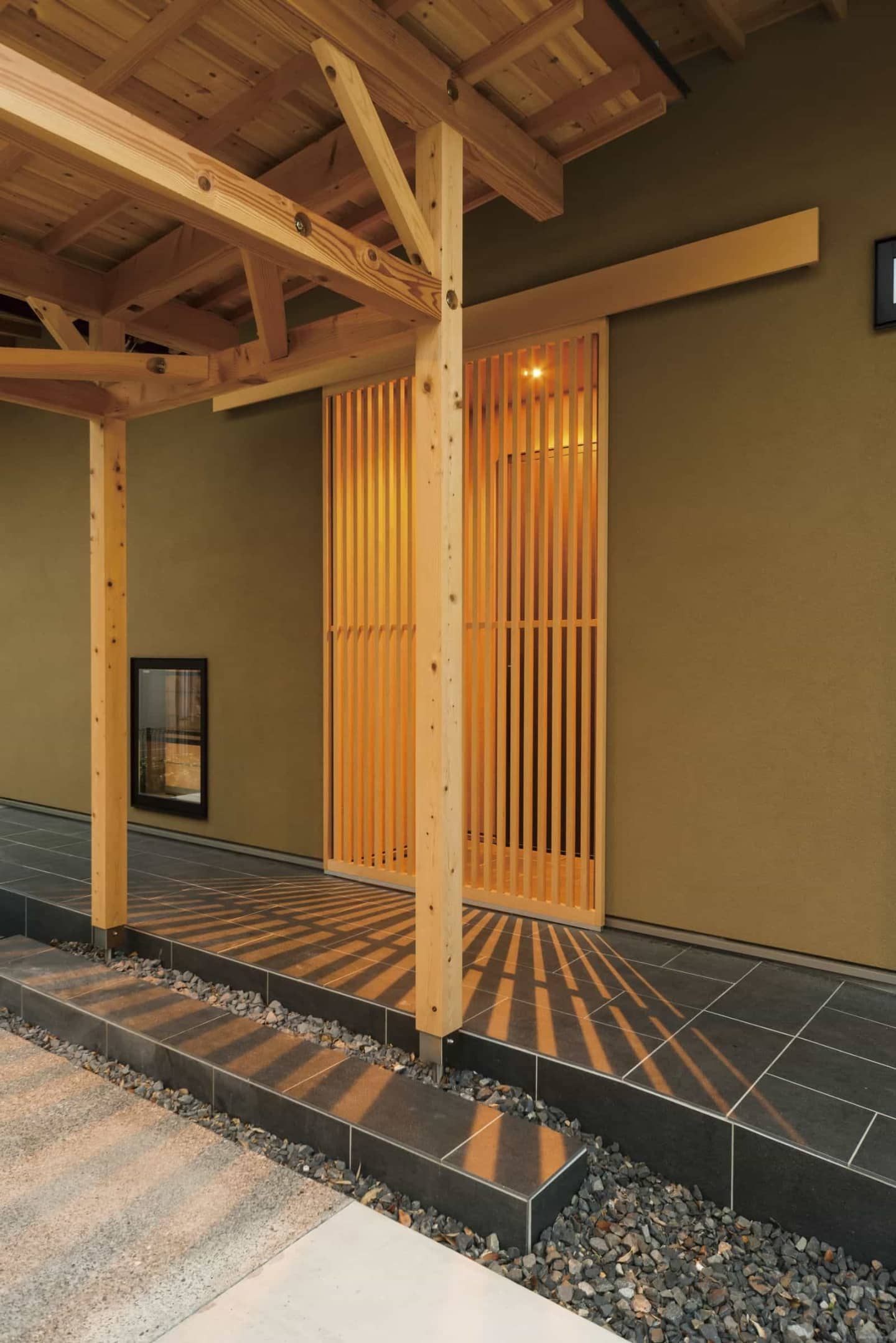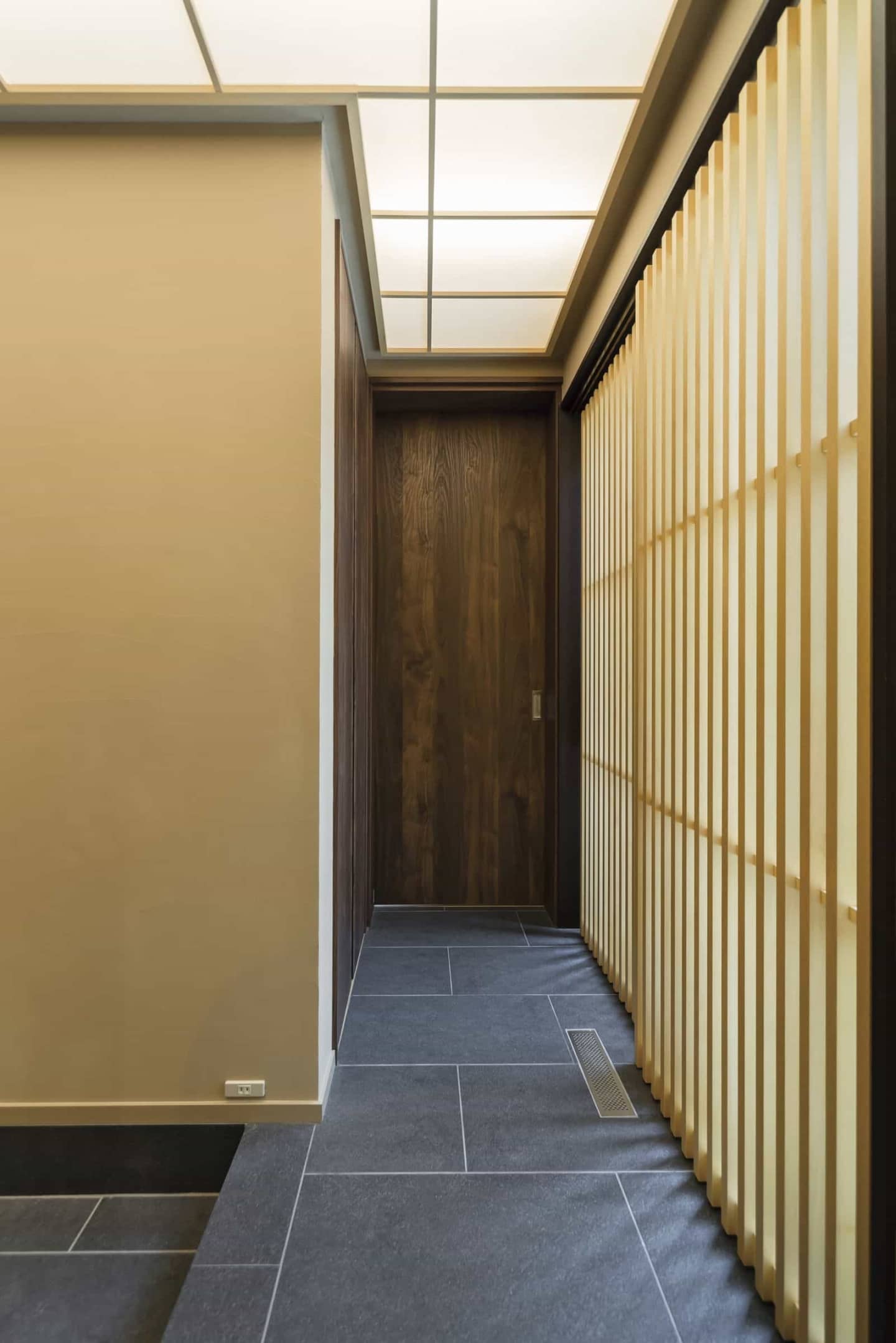 内外部、扉や家具に至るまで、色のバランスに配慮。明るすぎず、落ち着きのある絶妙な色合いを出しました。高気密高断熱、一体打ち基礎による床下蓄熱冷暖房を装備しました。1月のお引き渡しでしたが、冬の間はとても暖かく過ごせたとのことです。また、日本独特の陰影の美しさ、「陰翳礼賛」の世界を引用し、障子や格子を使って日射と視線・空気をコントロールすることで、ただ明るいだけの空間ではなく、陰影の美しさを演出できる空間としました。