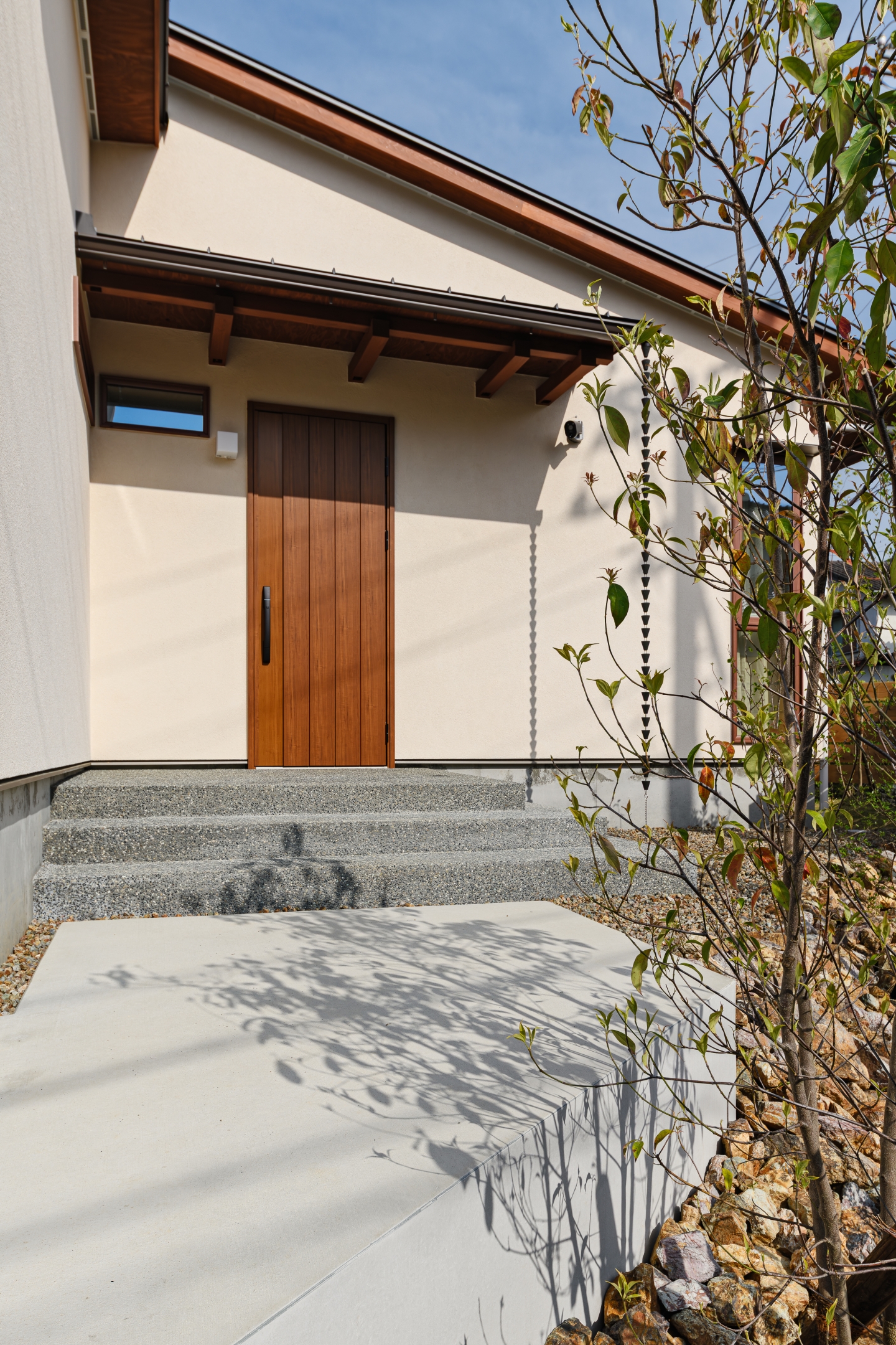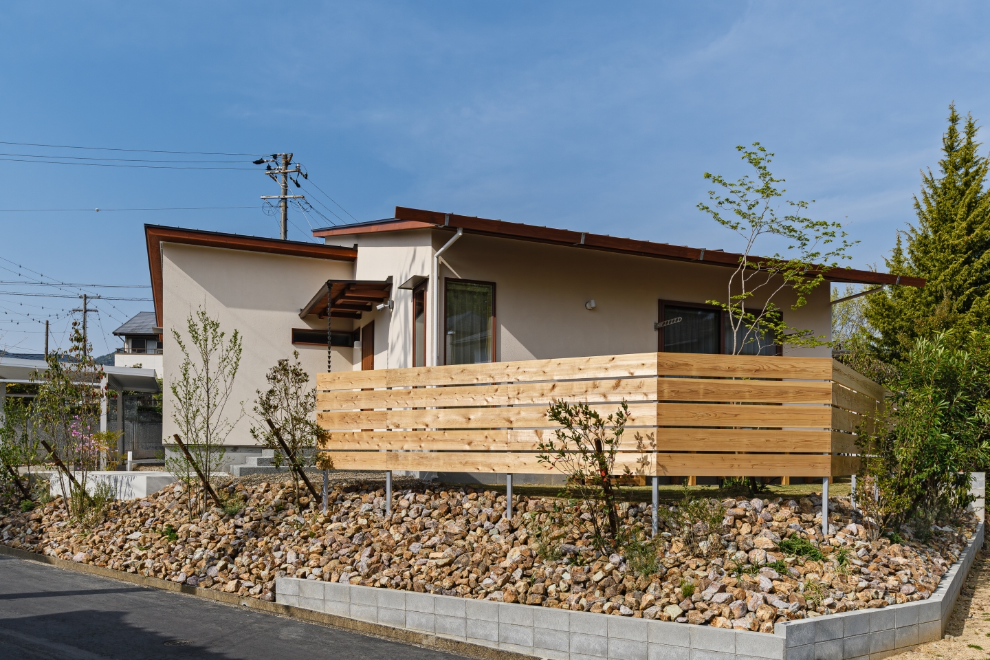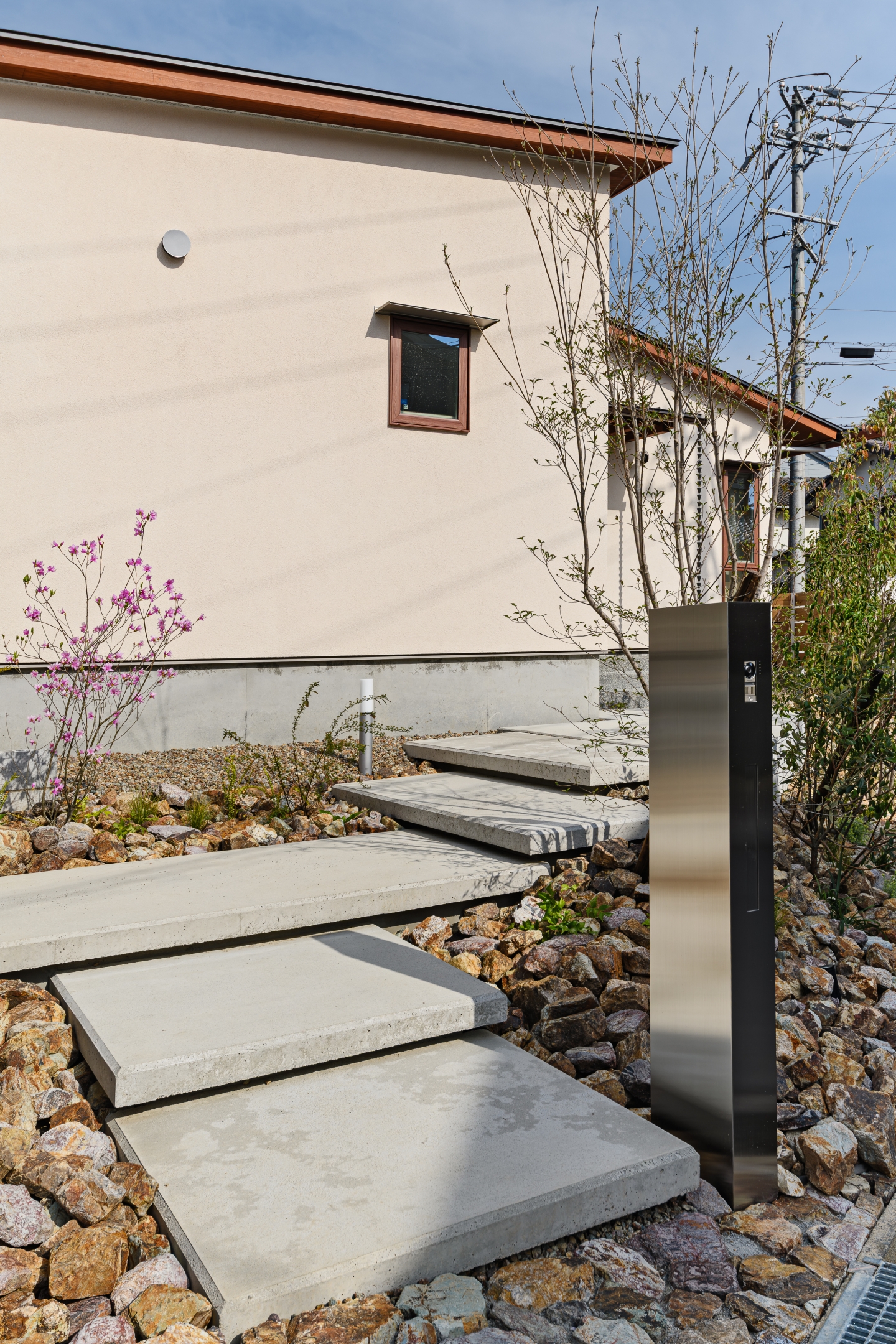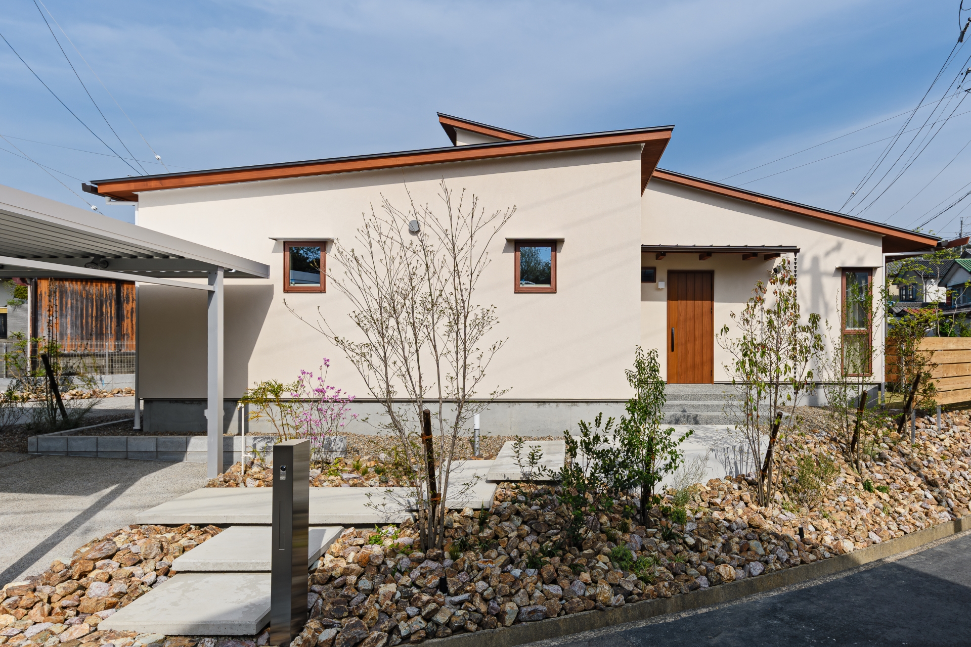 外観はシンプルな平屋に、外構には自然石や植栽をたくさん使用し、まちになじむ丘のようになりました。