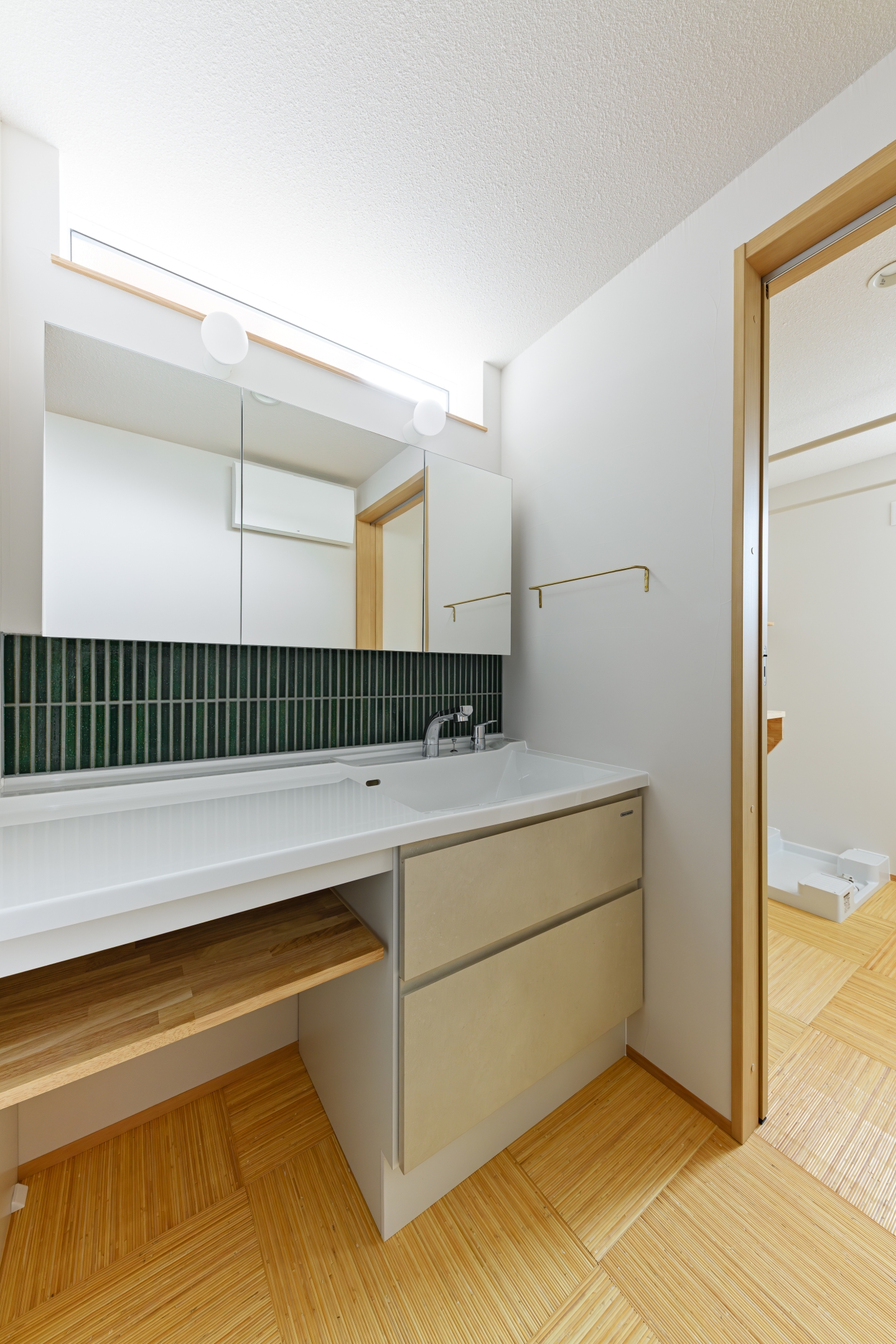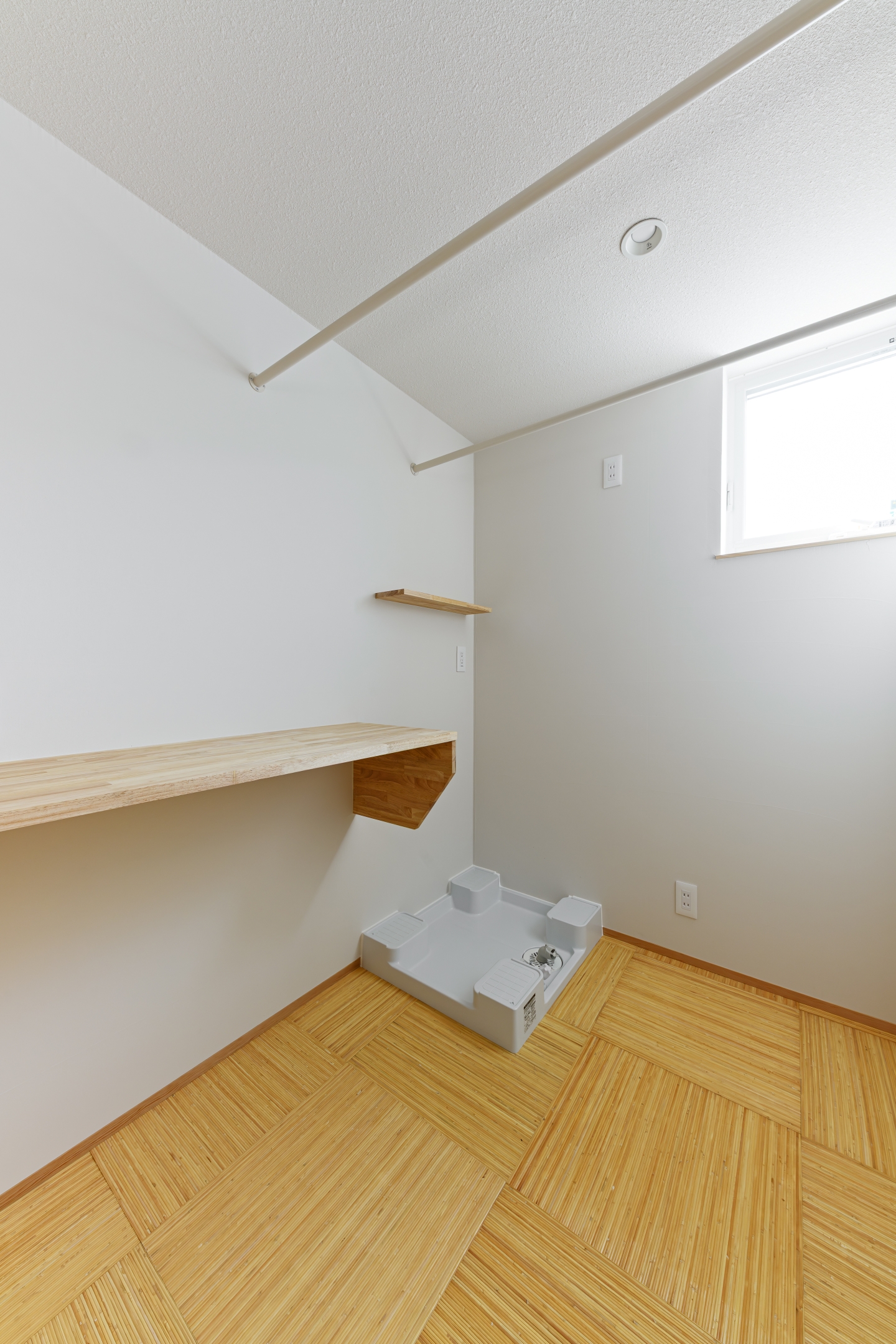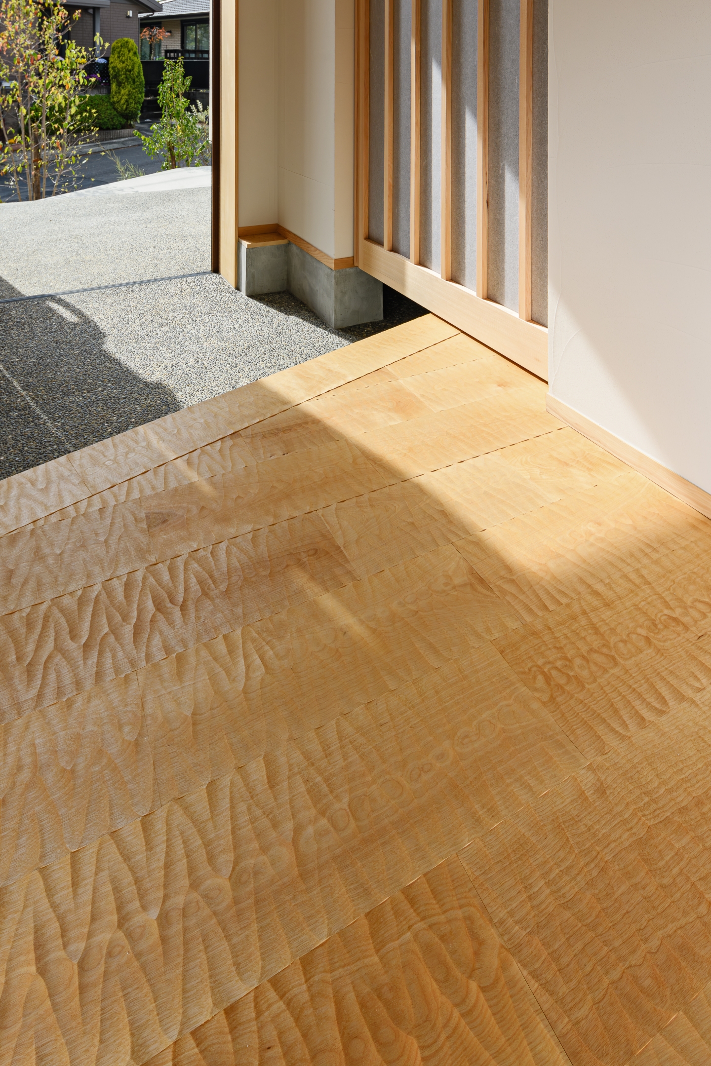 玄関入ってすぐ出迎える床は、足触りの良いなぐり加工の床を採用。