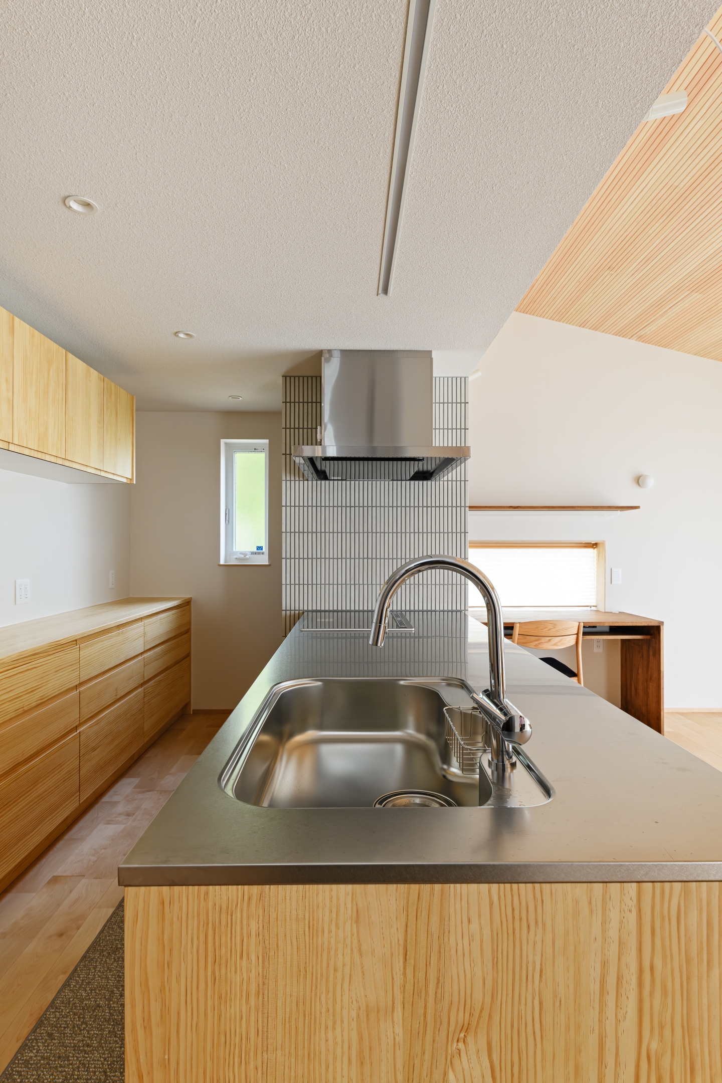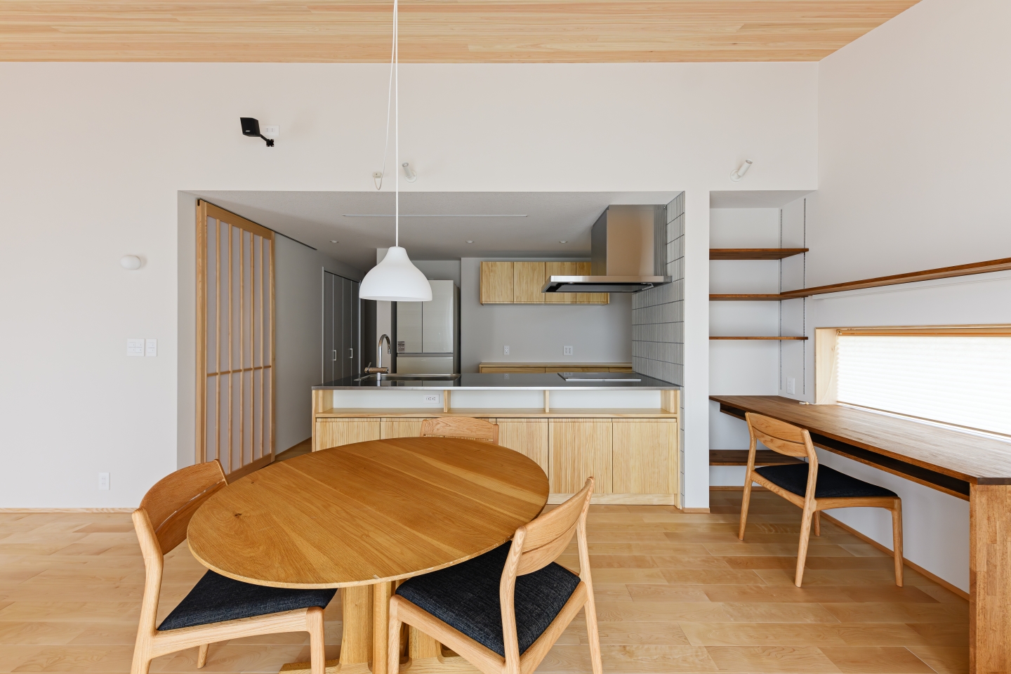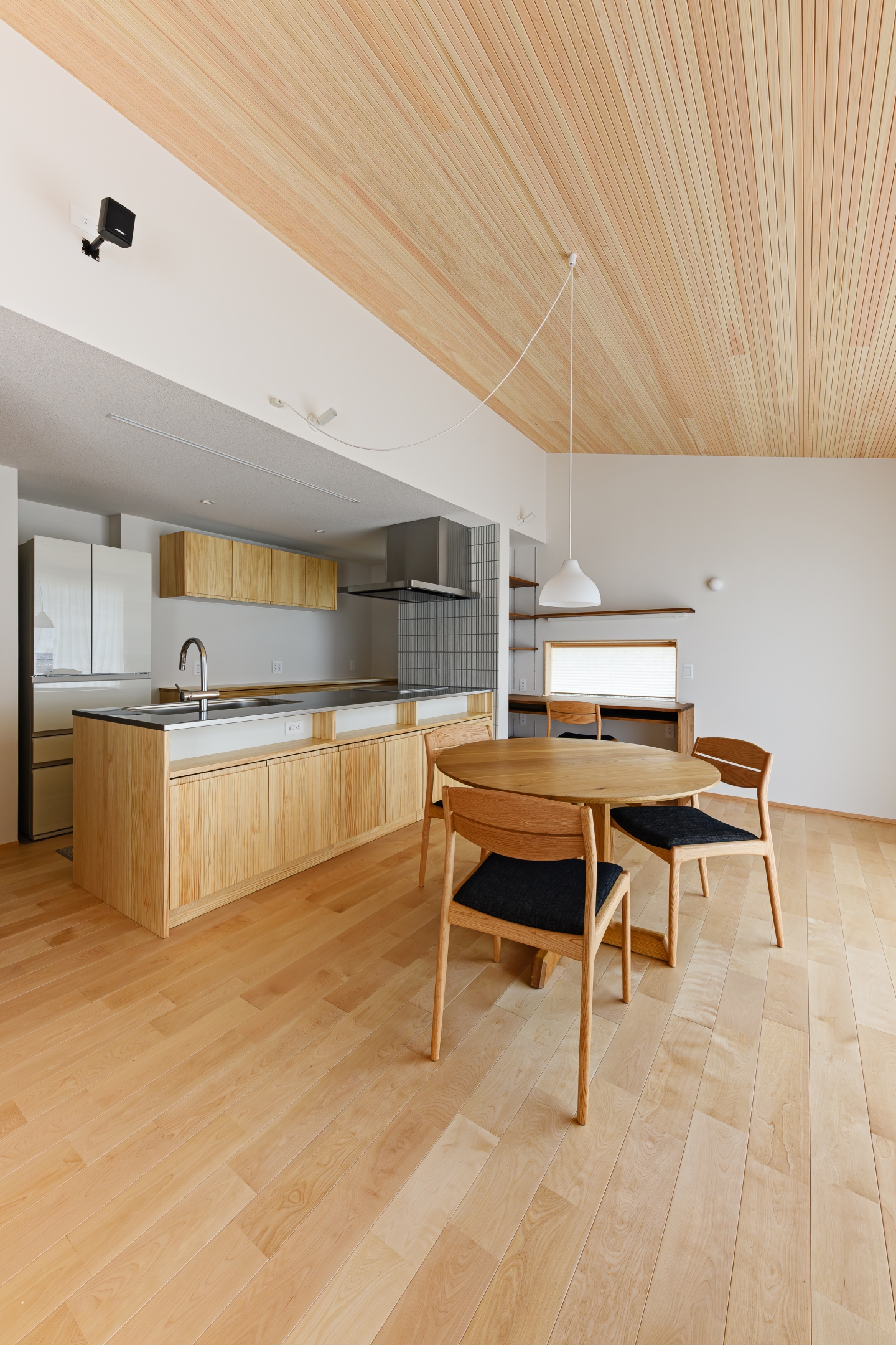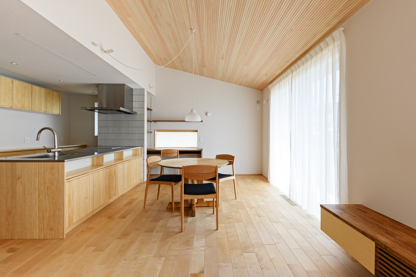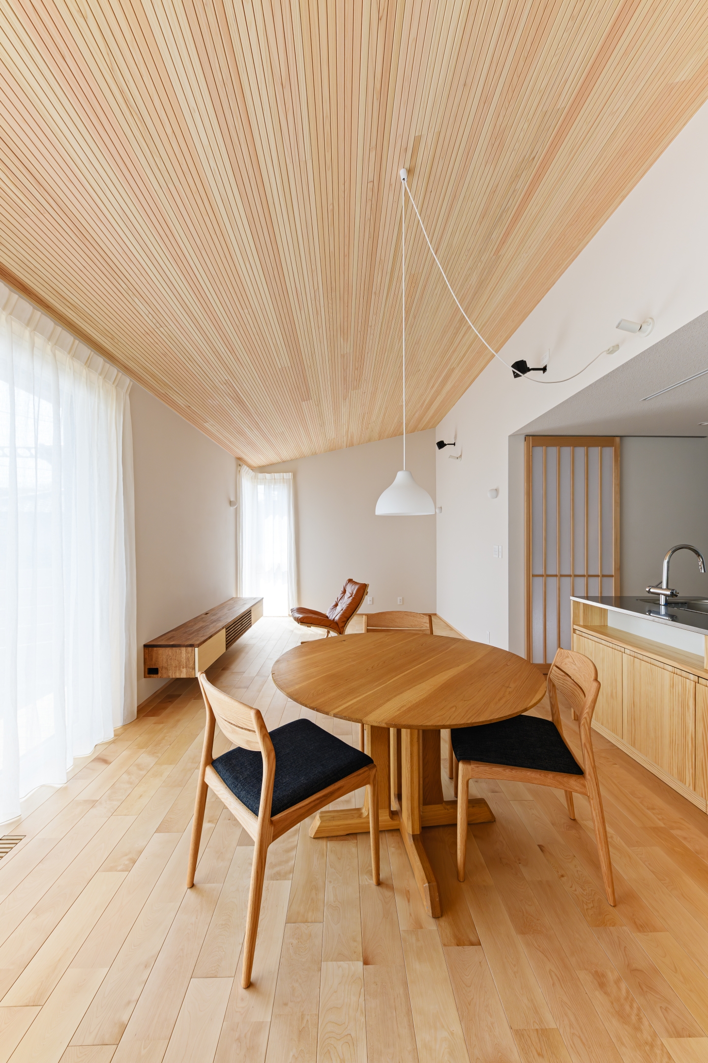 リビングダイニングは勾配天井+板張りでダイナミックに。