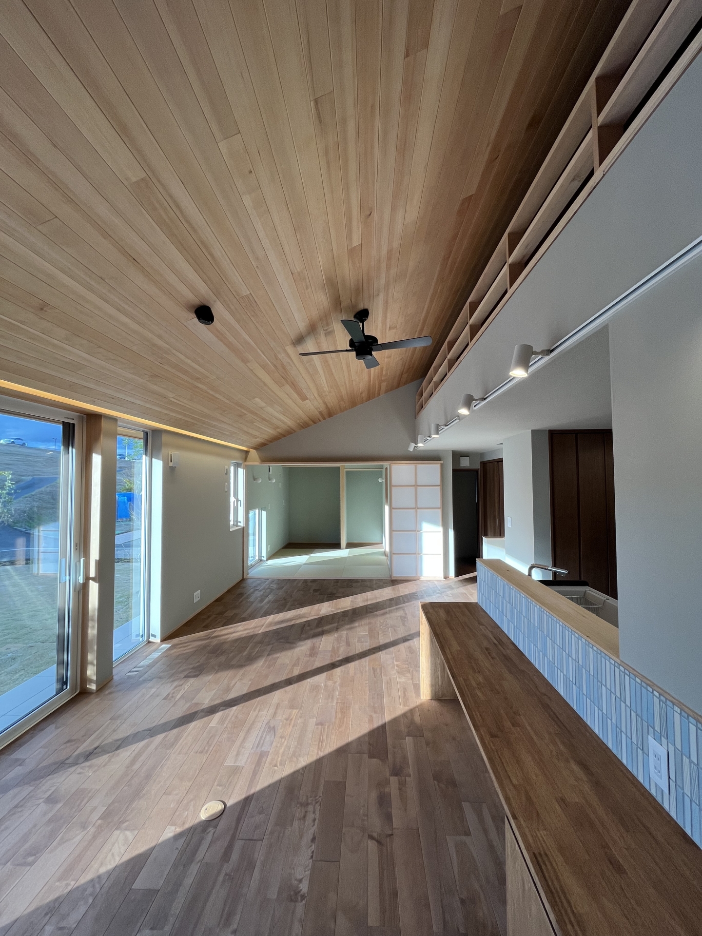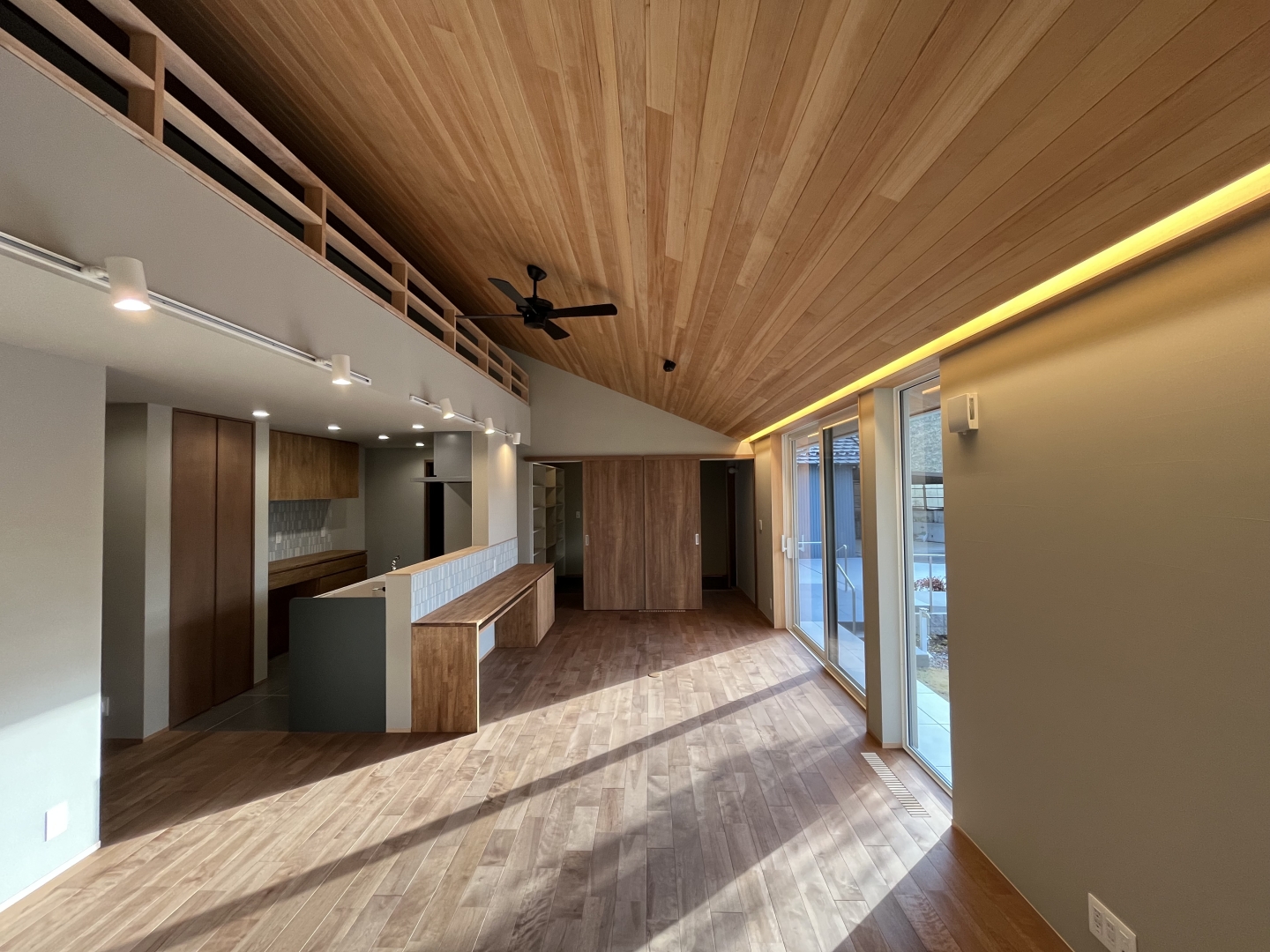 勾配天井のリビング・ダイニングは、開放的な空間となっており、大開口からの日当たりも確保。