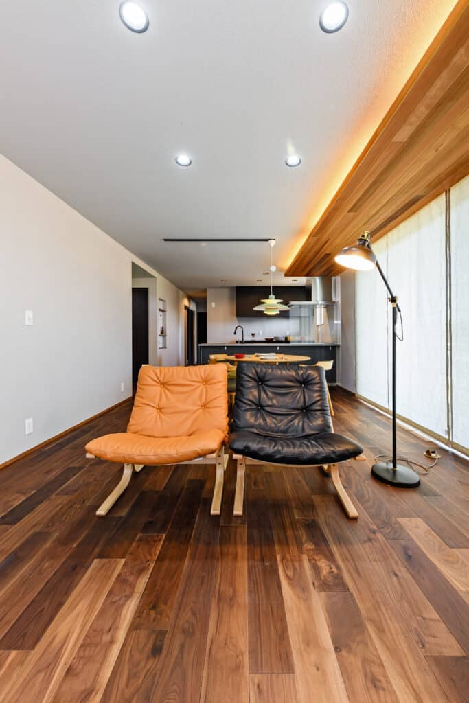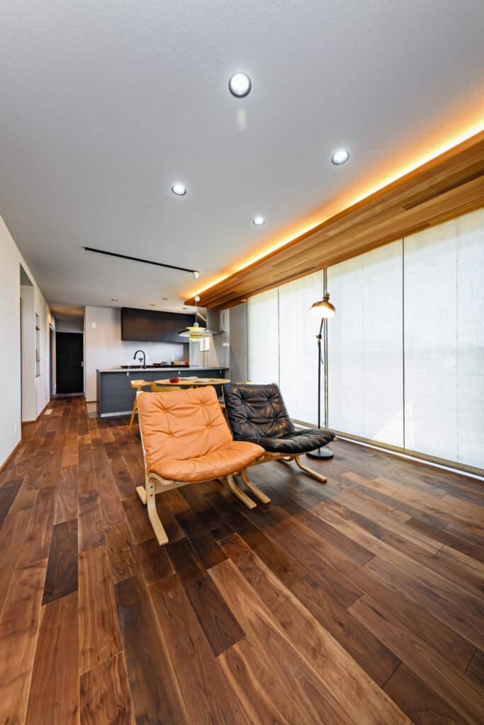 大人数の家族もゆったり過ごせる横長LDKの大開口の外には、しっかり屋根も確保しています。洗面脱衣につながるWICLはリビングからも近いので使い勝手の良い配置になっています。