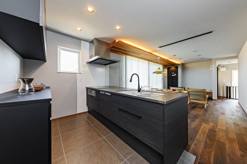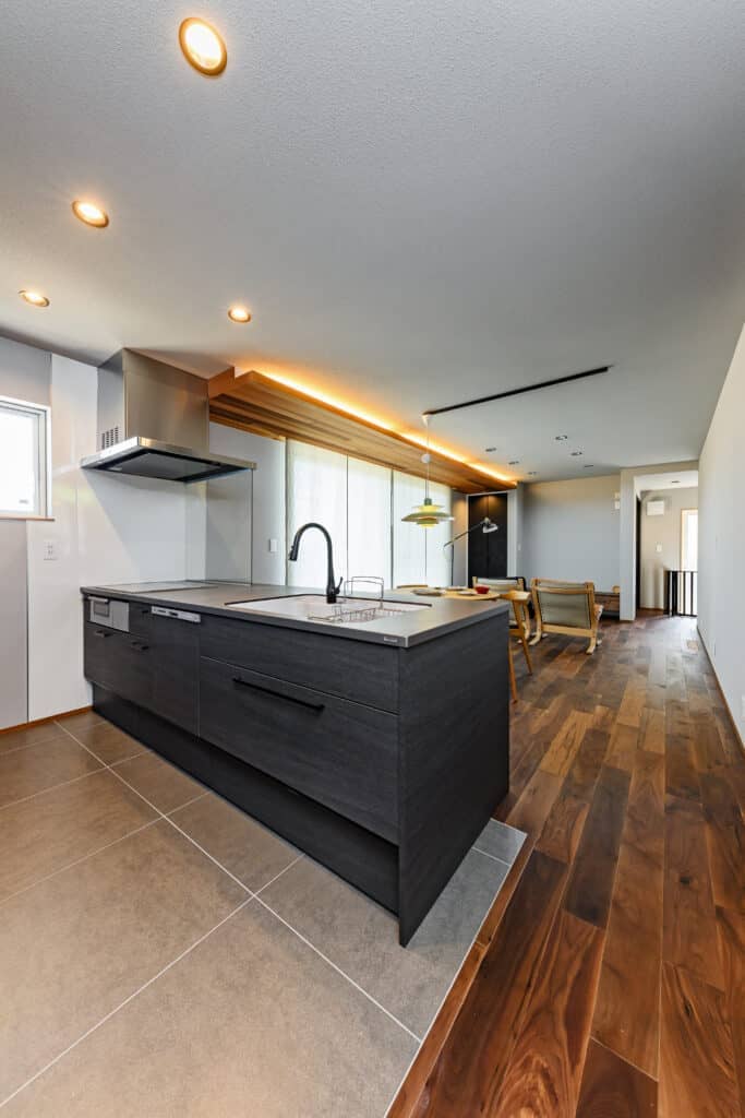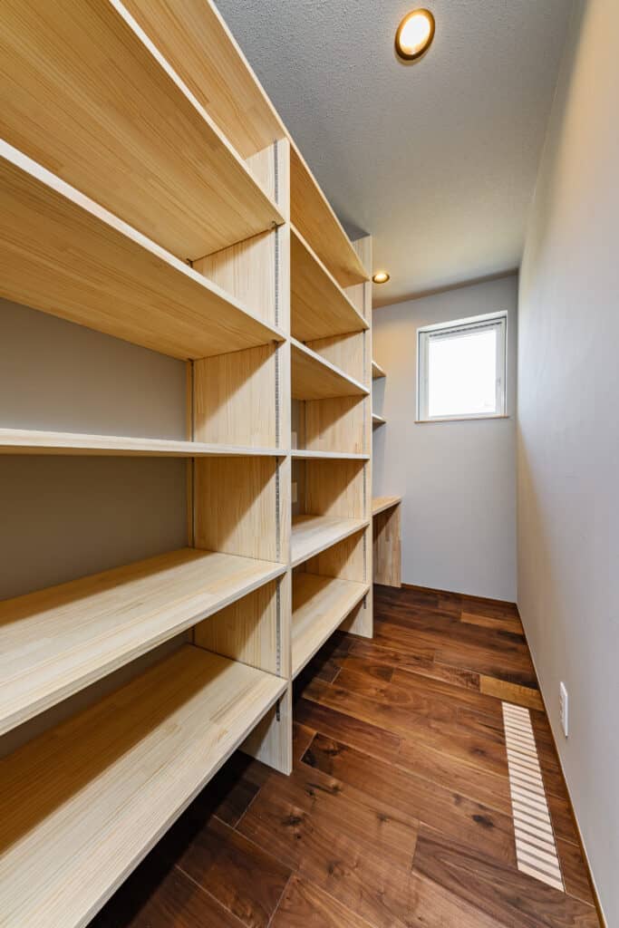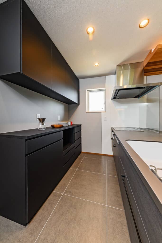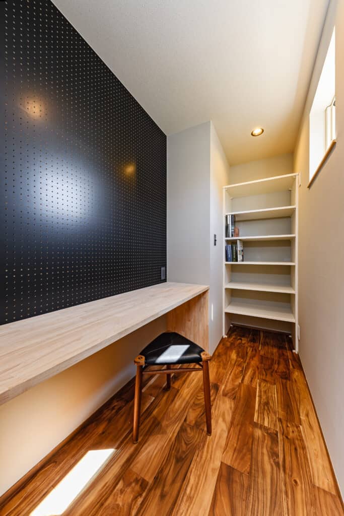 キッチンにはパントリーが隣接しており、小さな机を設置する事でワークスペースも兼ねています。他にも独立のこもれる書斎もあり、居場所をたくさんつくることが出来ました。