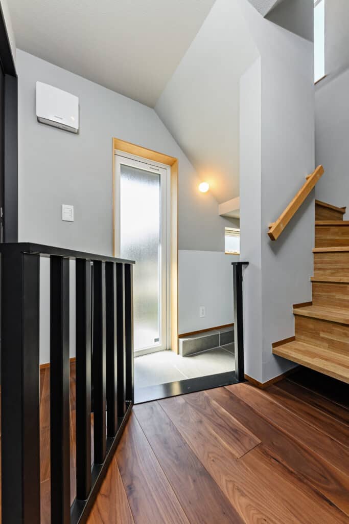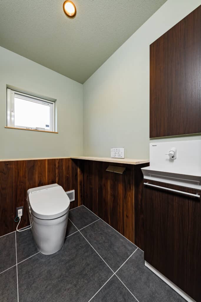 外観は東西に長い屋根のデザインとしましたが、南に軒を出してパッシブ設計にも配慮しました。