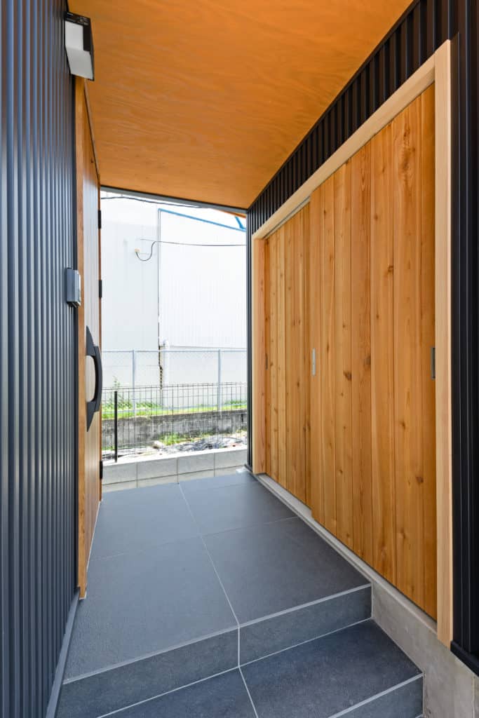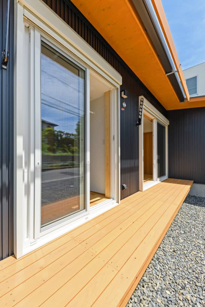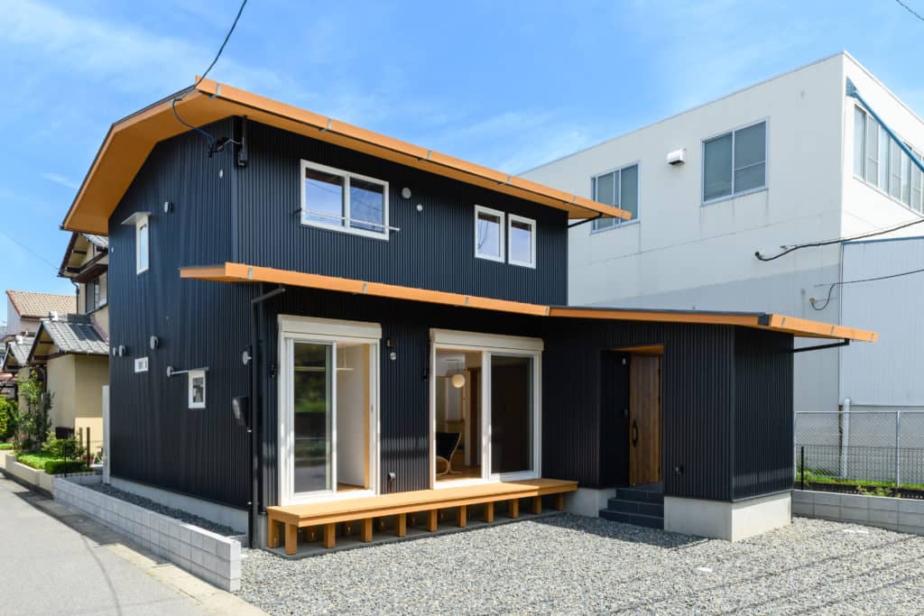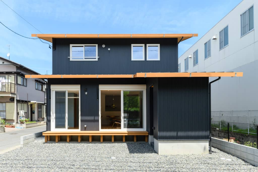 黒色のガルバリウムの外壁にオレンジ色の樋隠し、白色のサッシ、軒裏もオレンジ色でエムズらしい外観になりました。