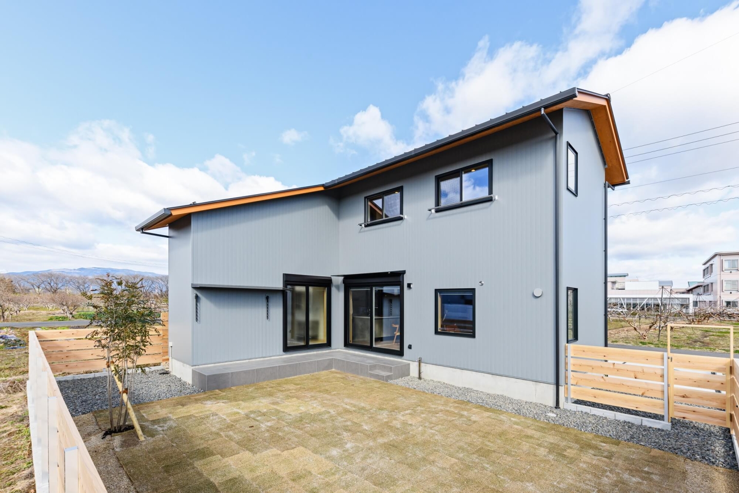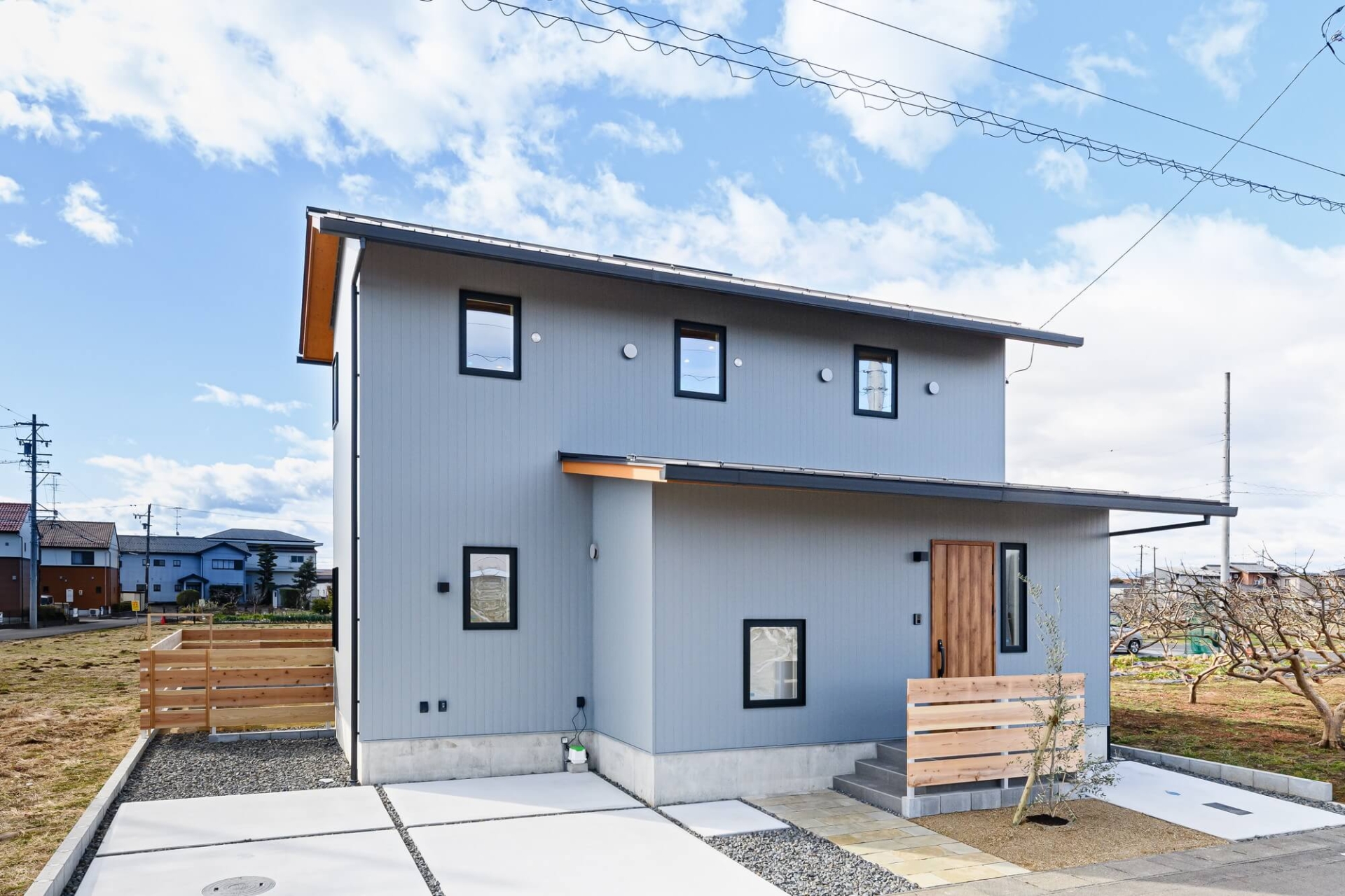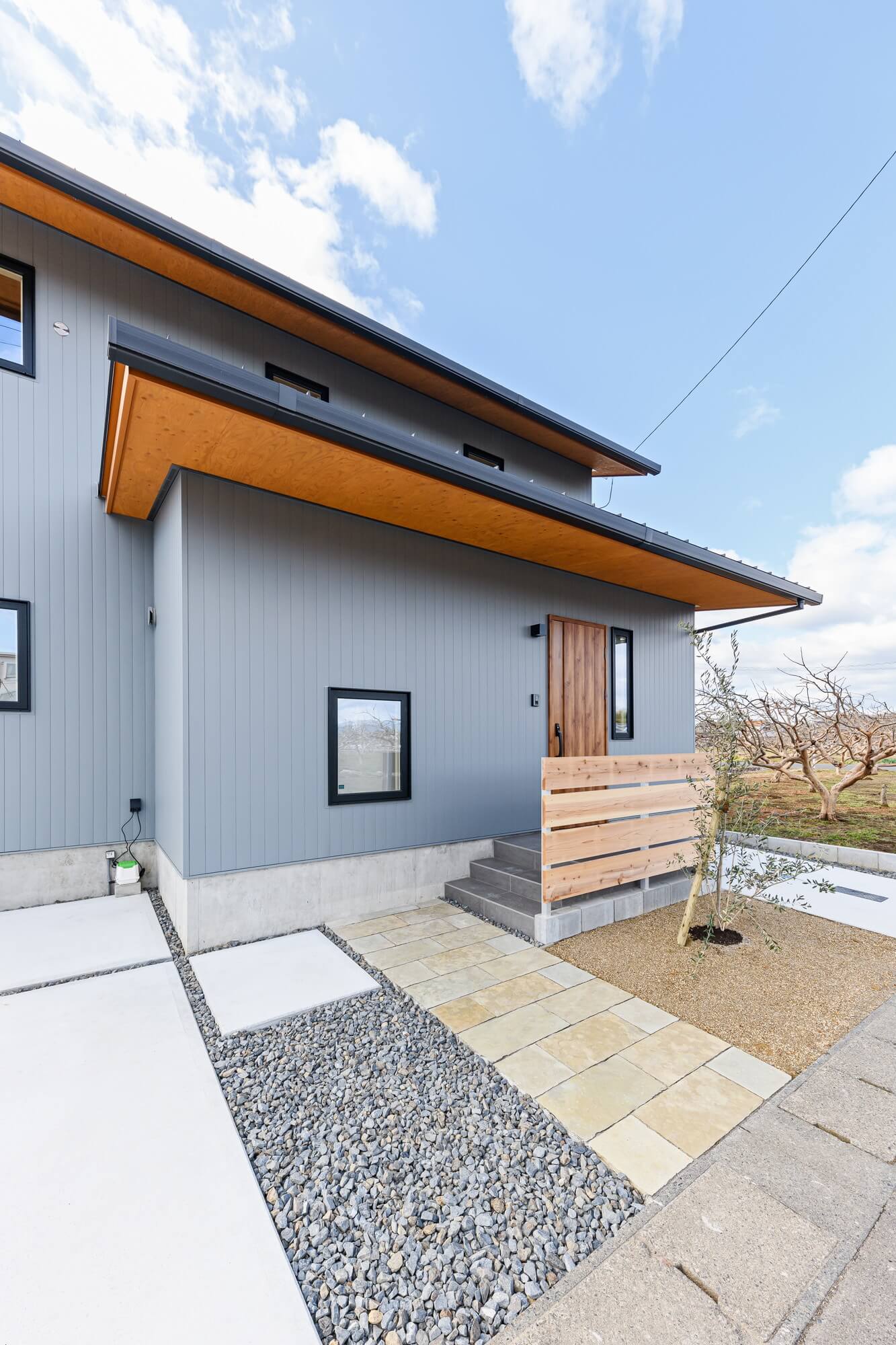 人気のグレーのガルバ外壁に玄関まわりを中心に、大きめの軒が特徴的なお住まいです。