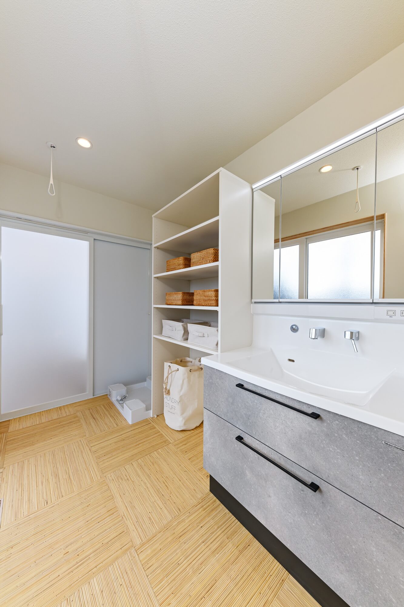 南に飛び出した洗面脱衣室は、サンルームとして、また西隣地の目隠しにも有効活用しています。