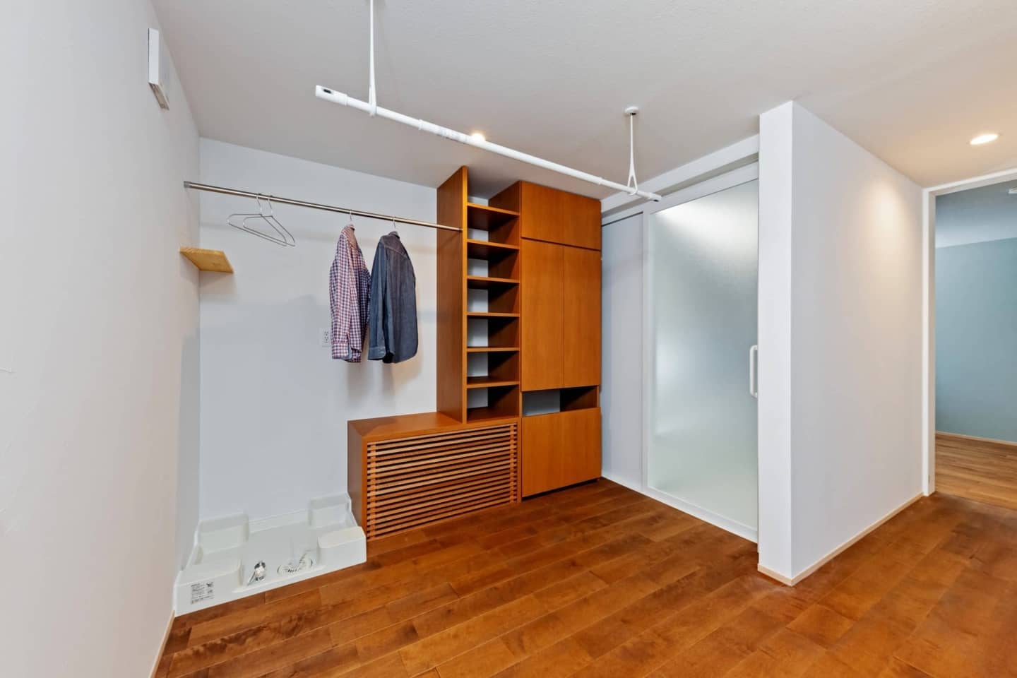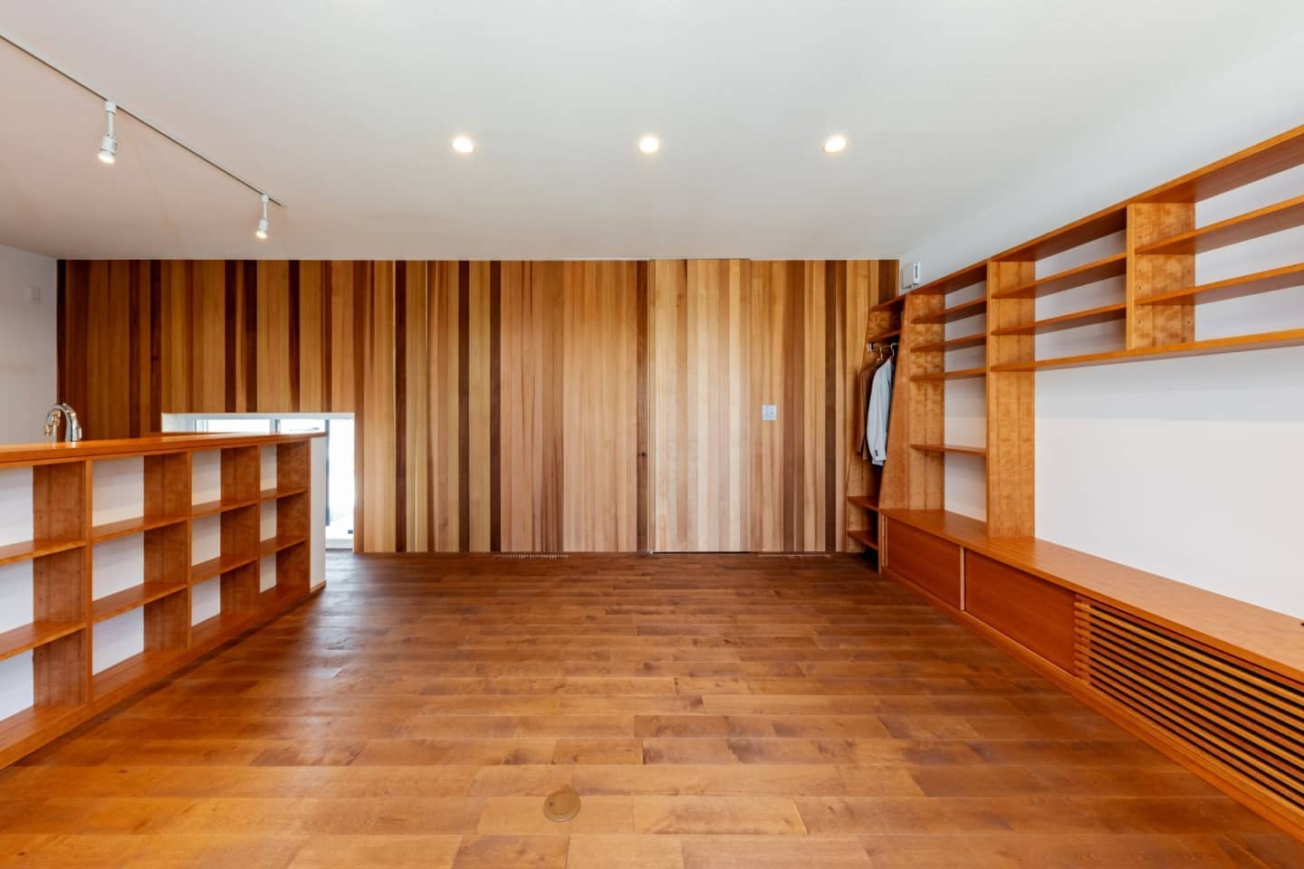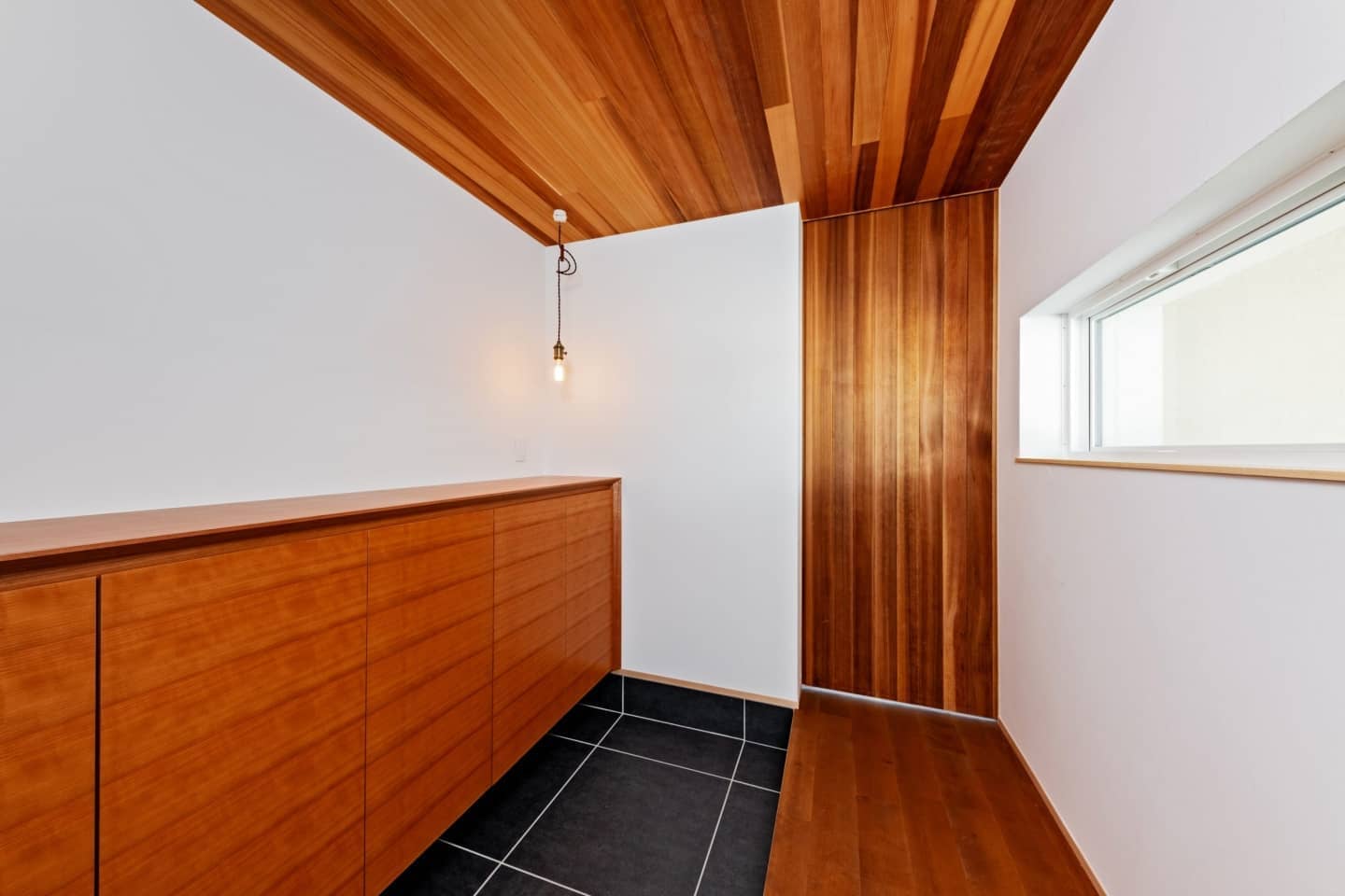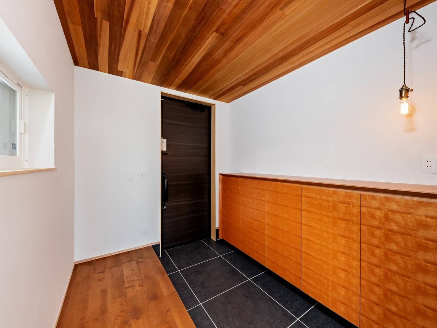 玄関の天井は板張りの素敵な玄関です。ビルトインガレージには2台分のスペースがあり、雨の日や雪の日に重宝するだけでなく、車への荷物の出し入れに便利な腰まども採用しました。