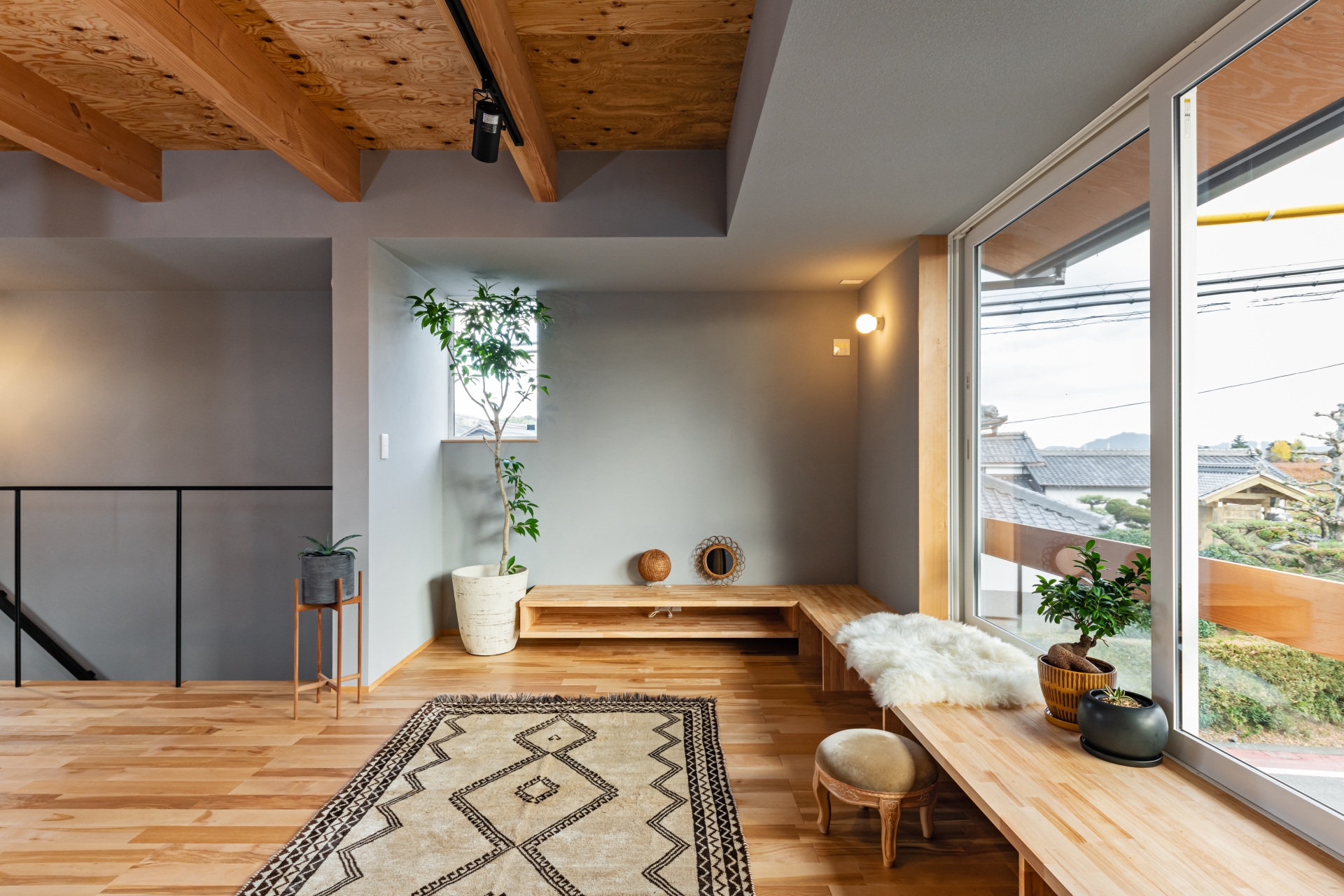LDの南サッシ足もとに配置したベンチは、腰掛けて日向ぼっこや床に座りデスクとして利用したり使い方は住まい手次第です。