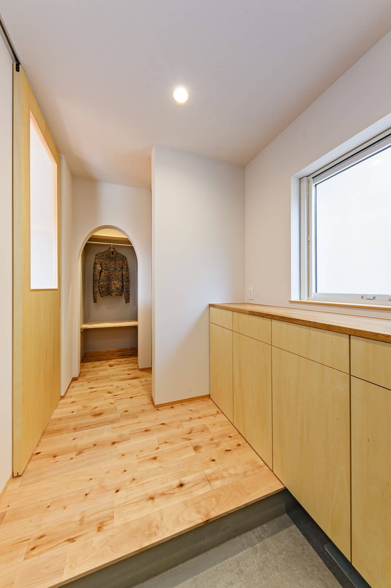 玄関には収納力抜群な造作下駄箱を設置しました。