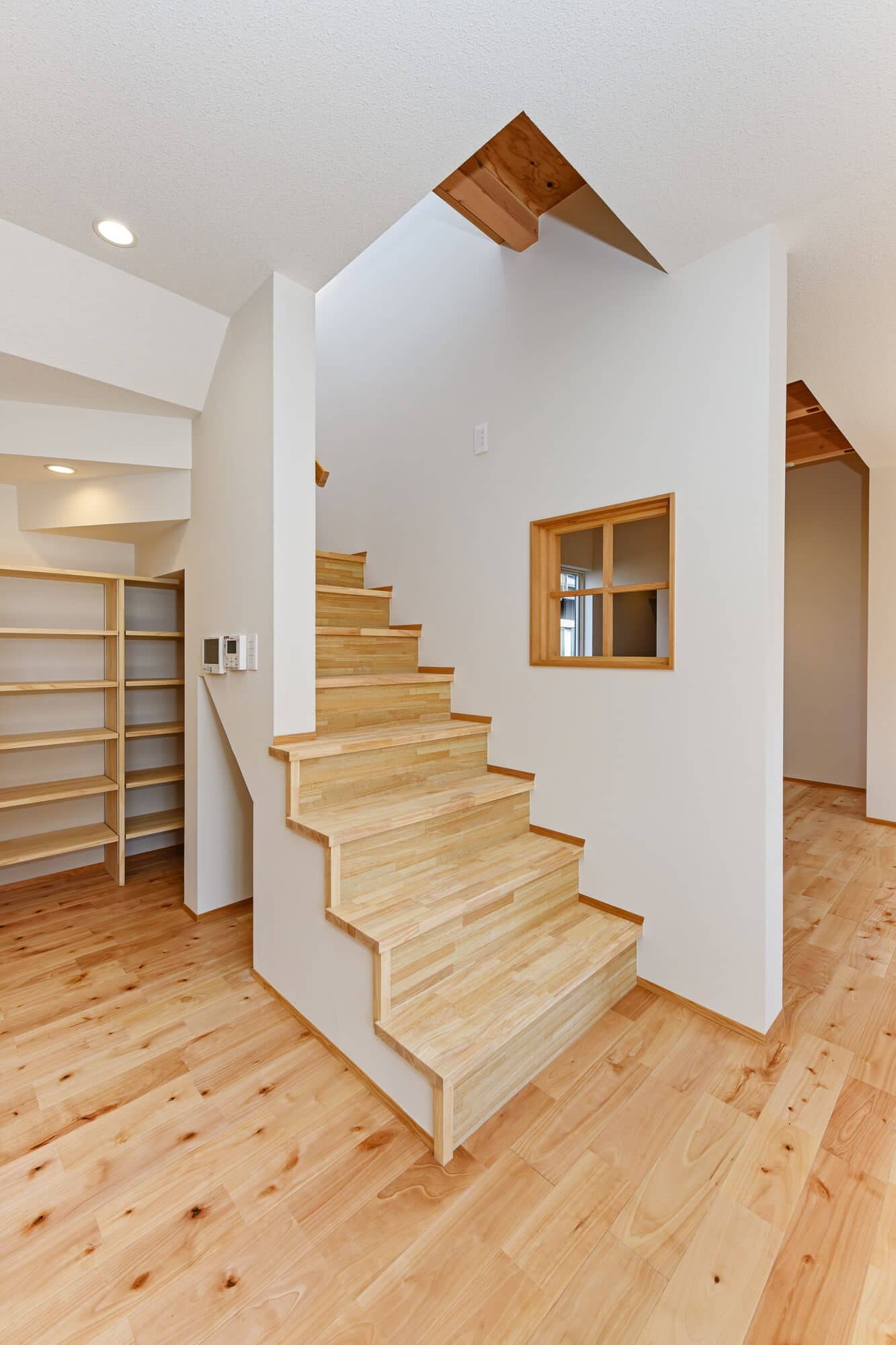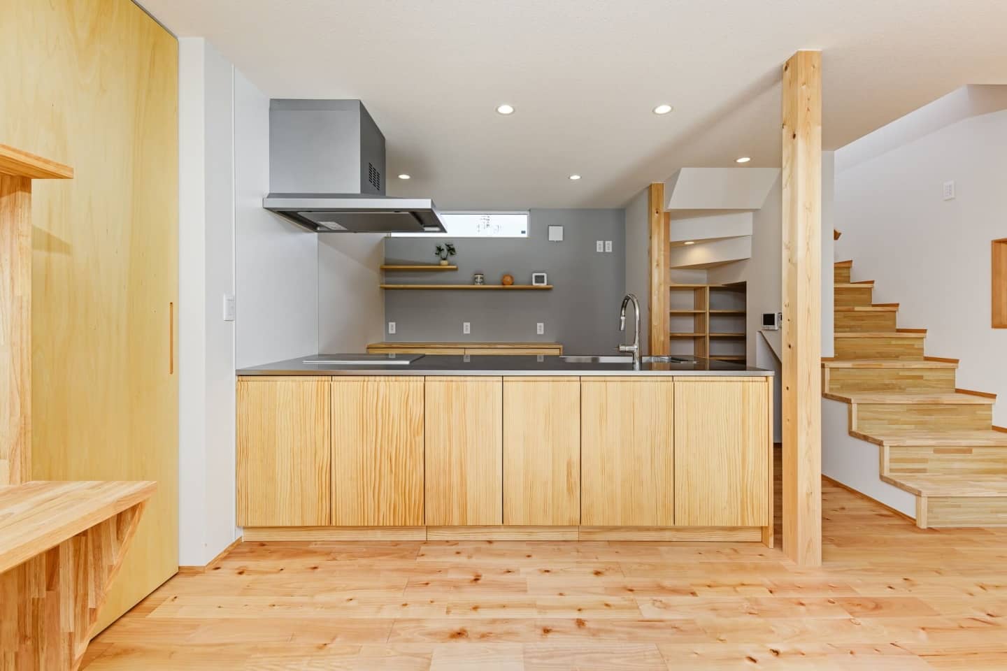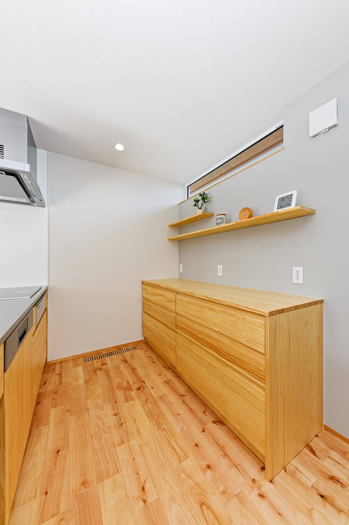 キッチンはお庭を見ながらお料理できる配置に。キッチンとホビースペースの間の壁には小さな窓を設置し、各々が別々の時間を過ごしていても、家族の雰囲気を感じることができる仕掛けになりました。