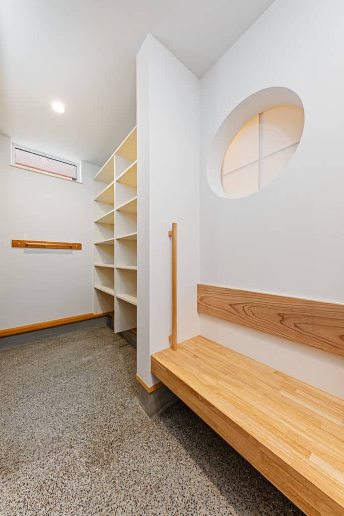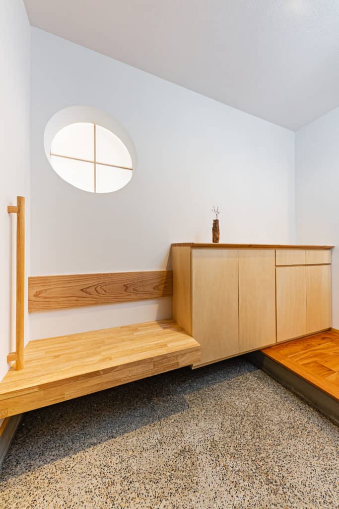 キッチンから寝室へ向かう途中には庭を眺めながら作業が出来るスタディコーナー兼ワークスペースがあり、家族全員で使うことを想定しています。