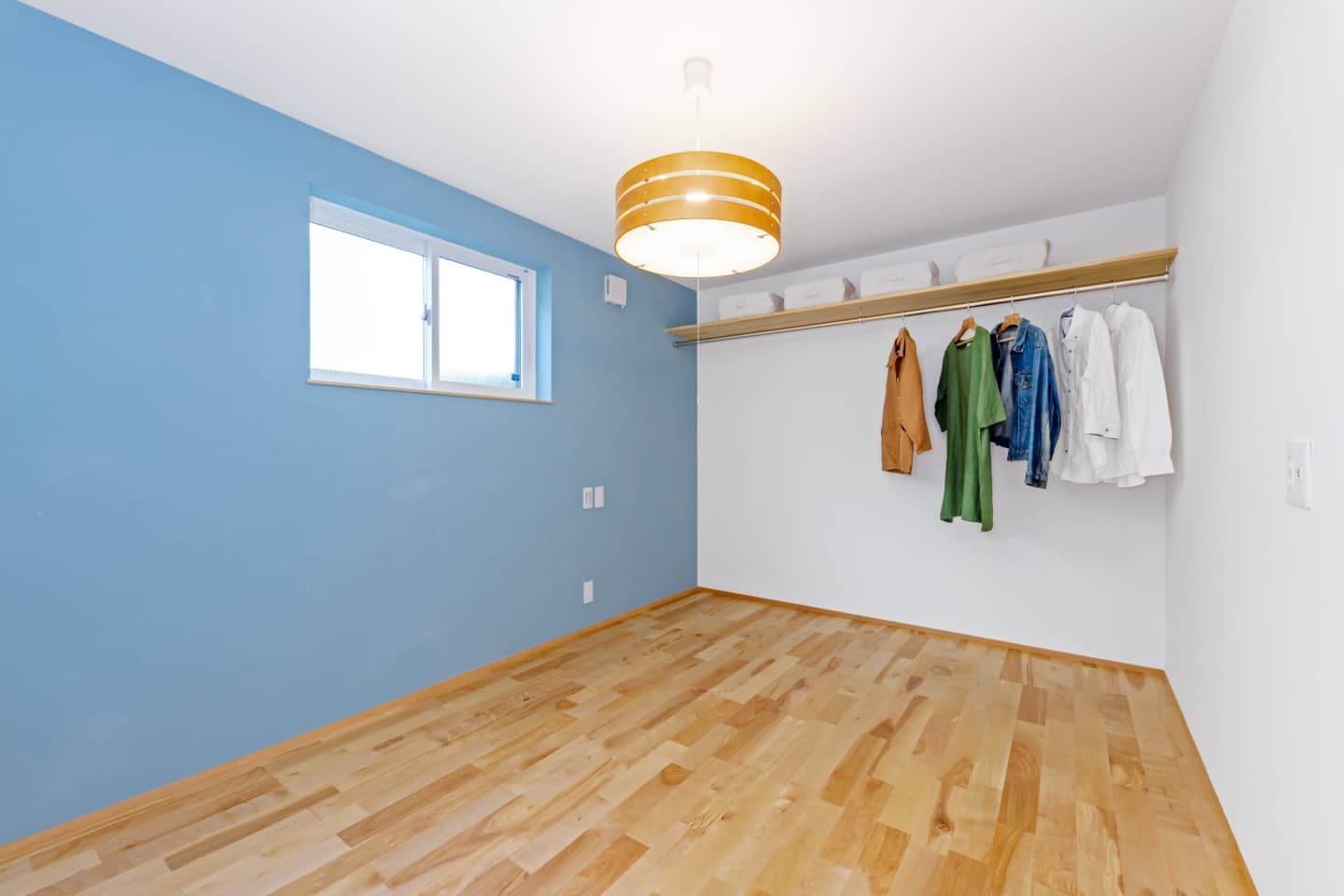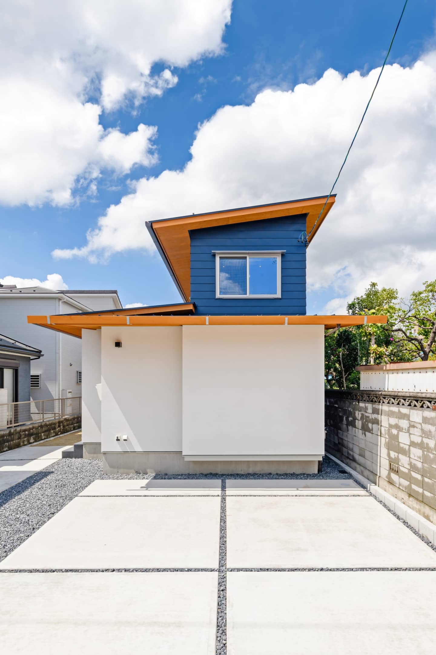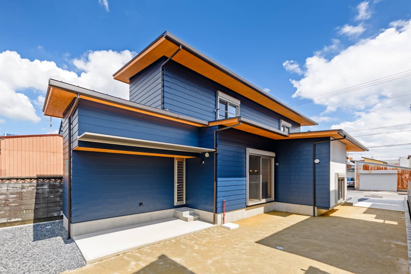 外観はダークブルーの横貼りガルバリウムと塗り壁を合わせています。玄関部分には板張りもあります。