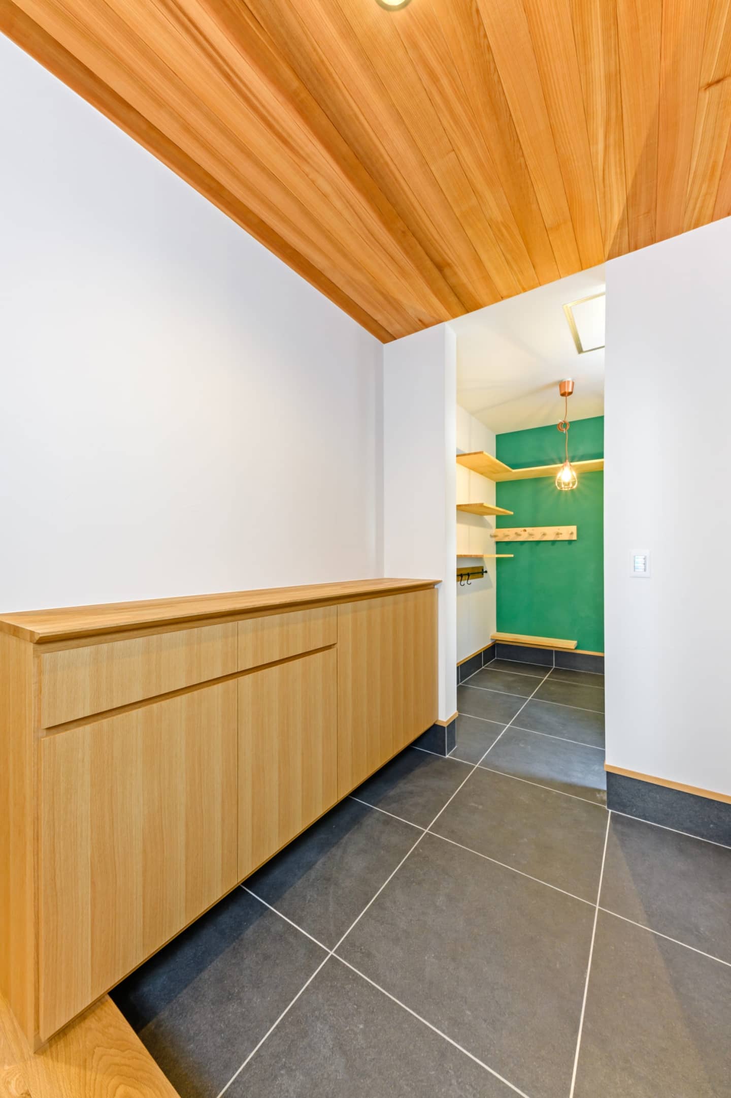 玄関に入ってすぐには、棚の配置にもこだわった大容量土間収納。玄関収納には引き出しの中にコンセントがあり、ウォークマンなどの充電もできます。