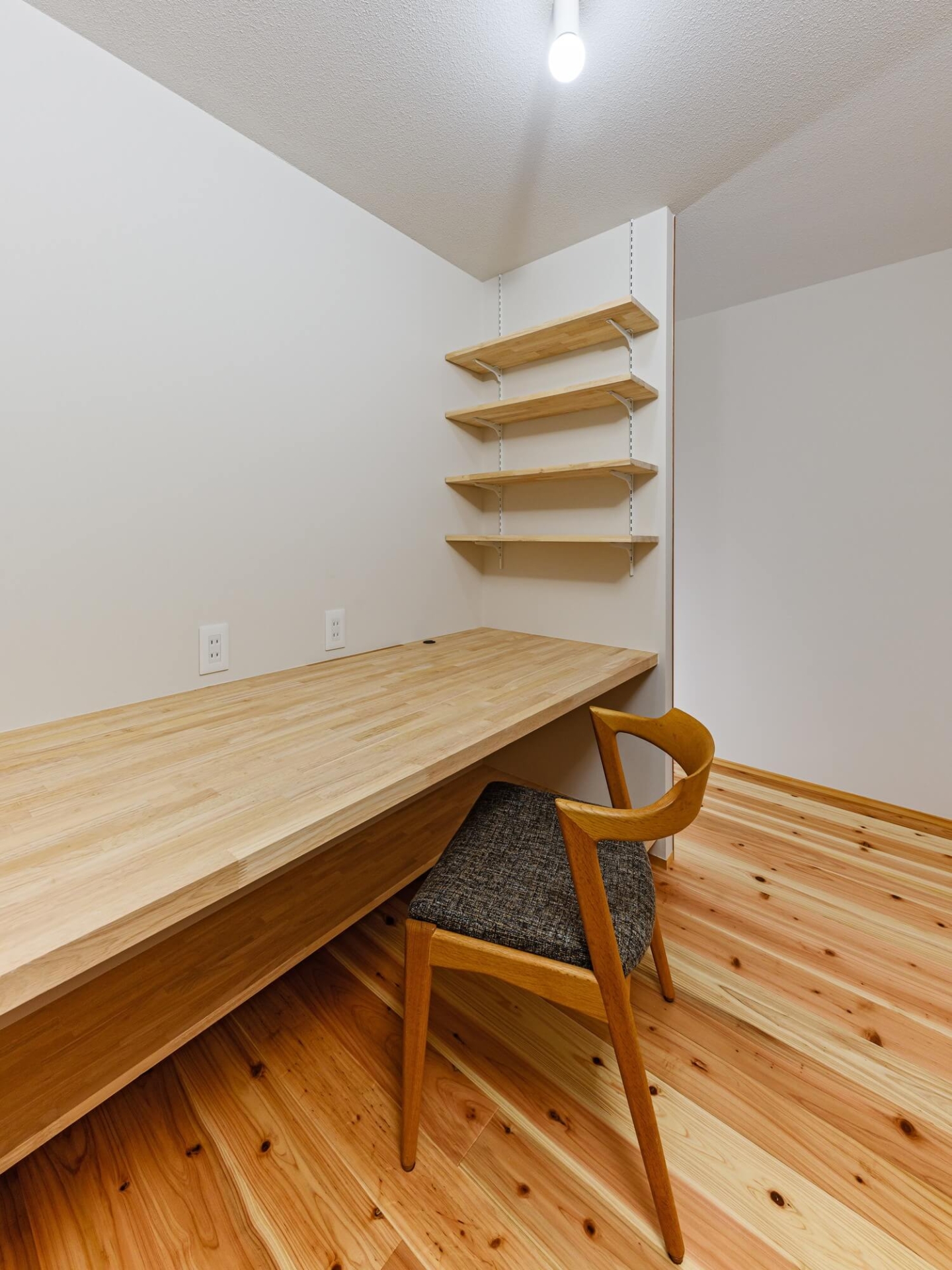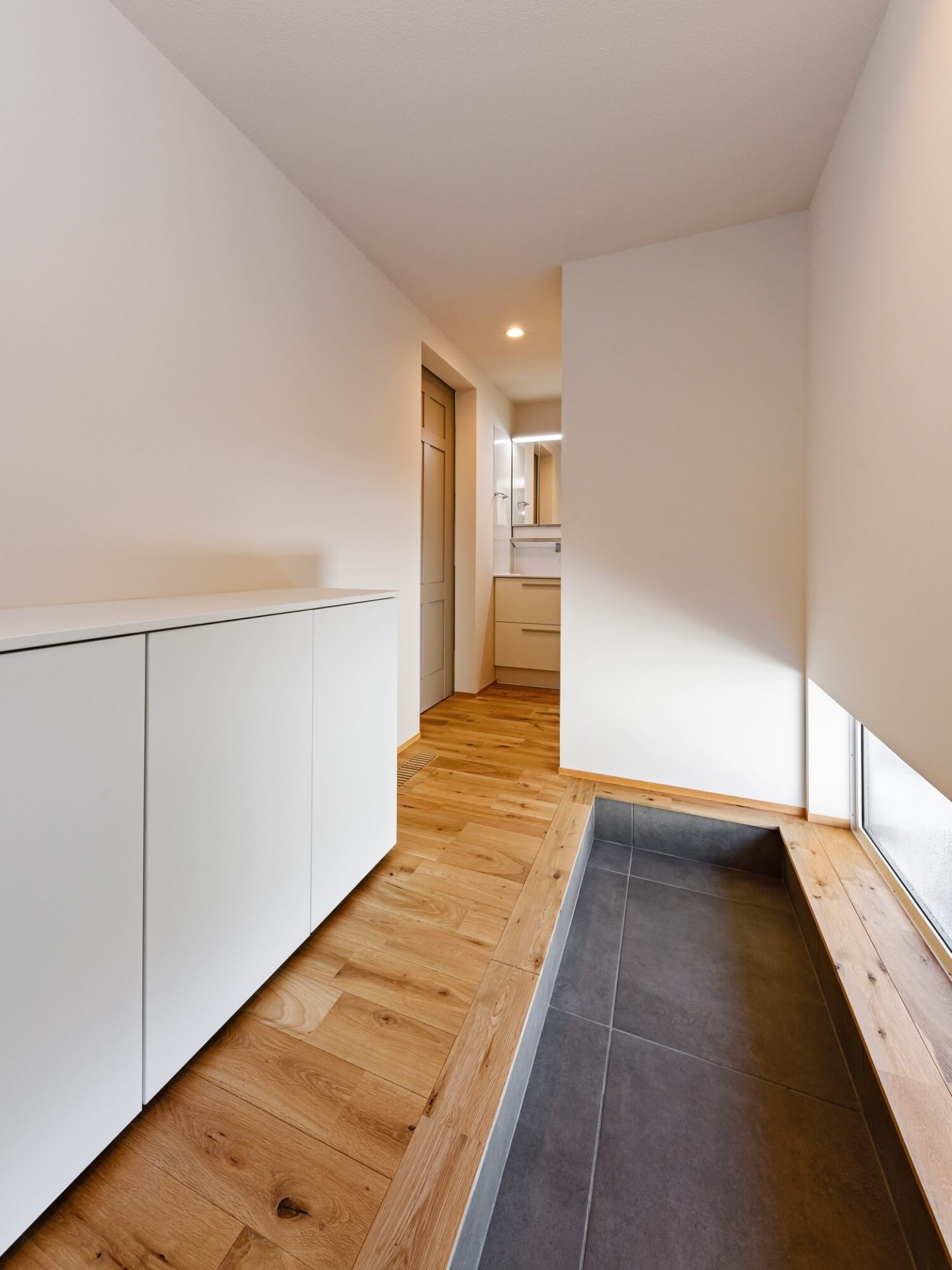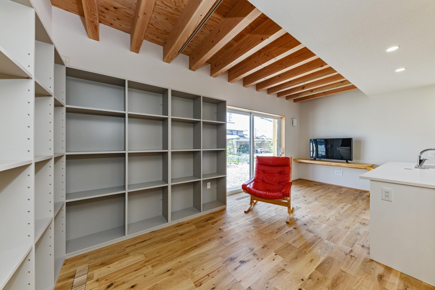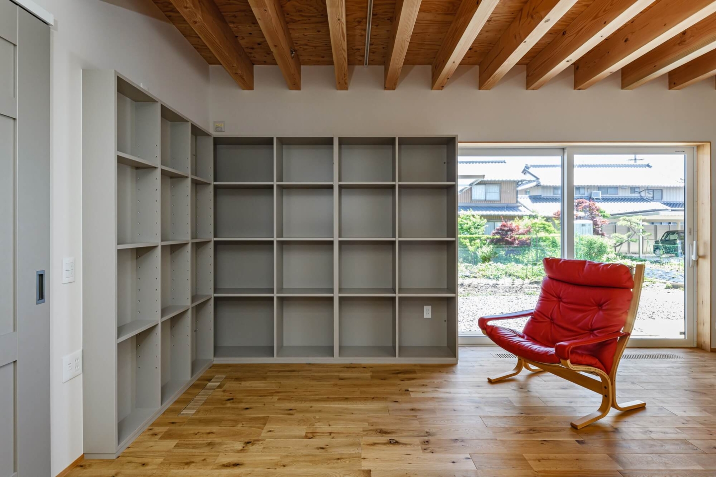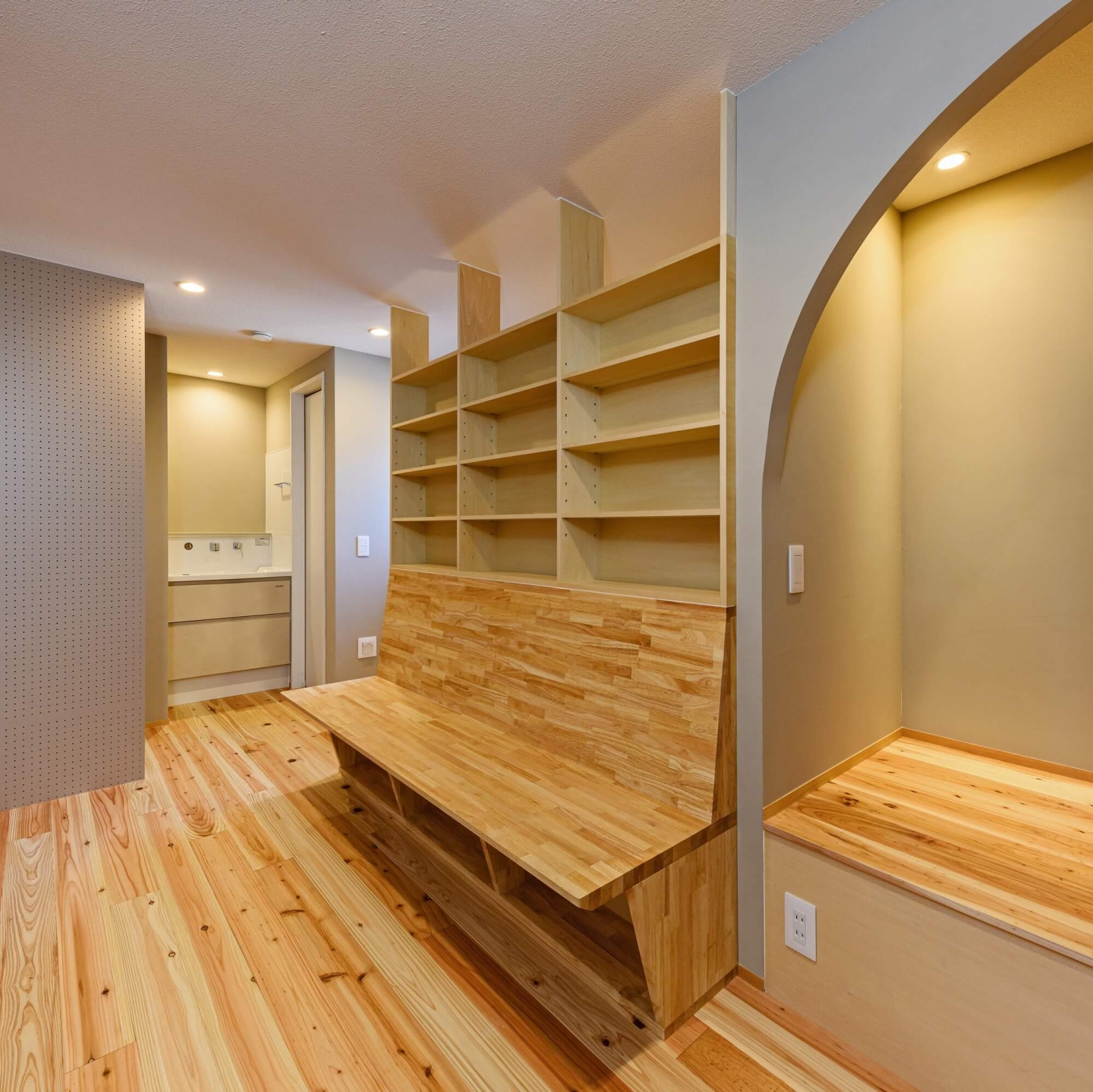 四角くシンプルな間取りのお住まいです。1階は18帖のLDKを中心にファミリークローゼットやパントリーの収納スペースに加え、ゆったり4.5帖の洗濯・脱衣室など数字以上にゆったりとした空間です。2階は寝室や個室以外にご主人さまと奥さまそれぞれ籠れる個室もあり、階段ホールを利用した家族ライブラリー:大きな本棚+小上がりヌックも備え居場所もたっぷり!家族みんながゆったり住まえる素敵なお住まいになりました。