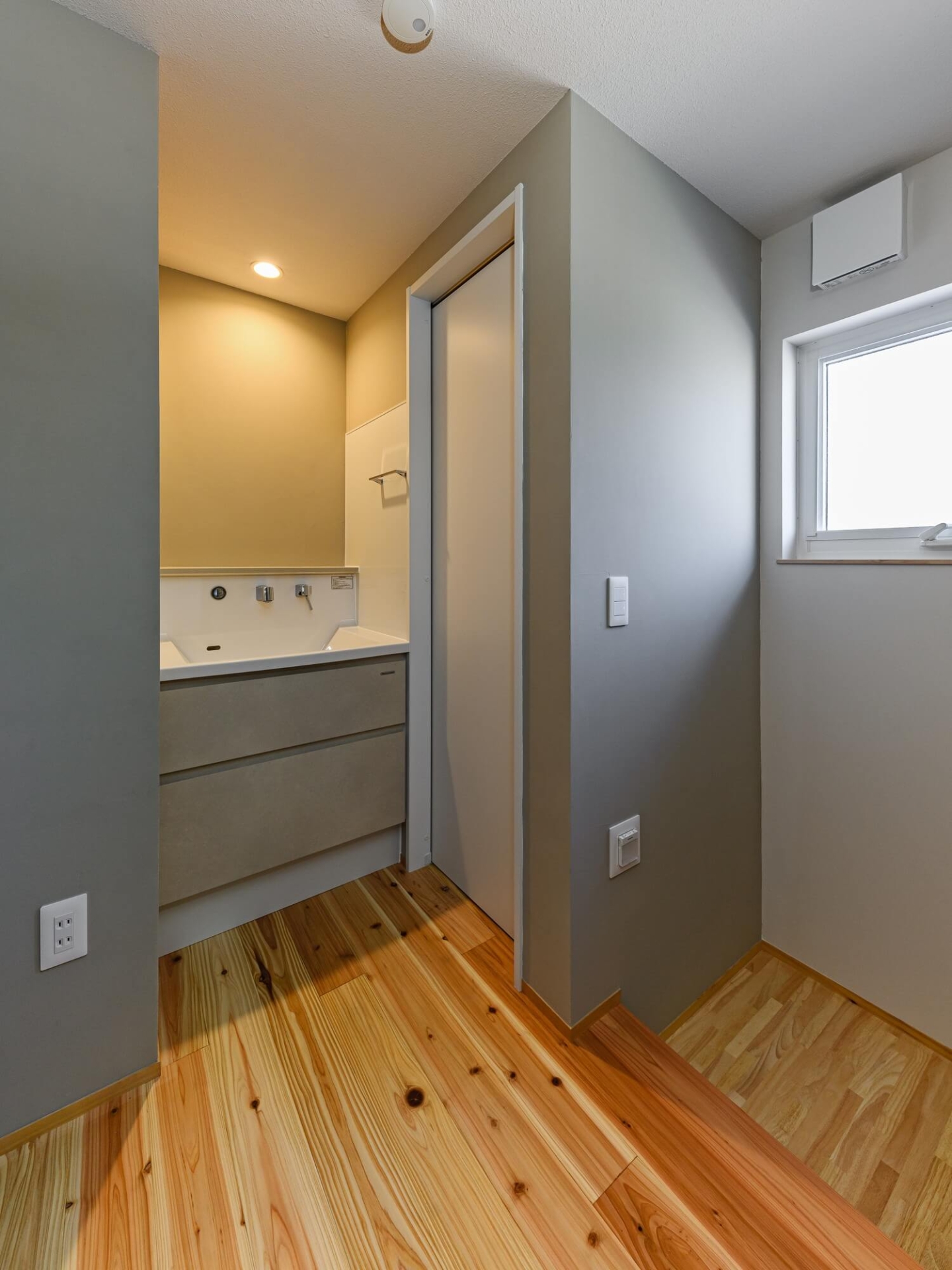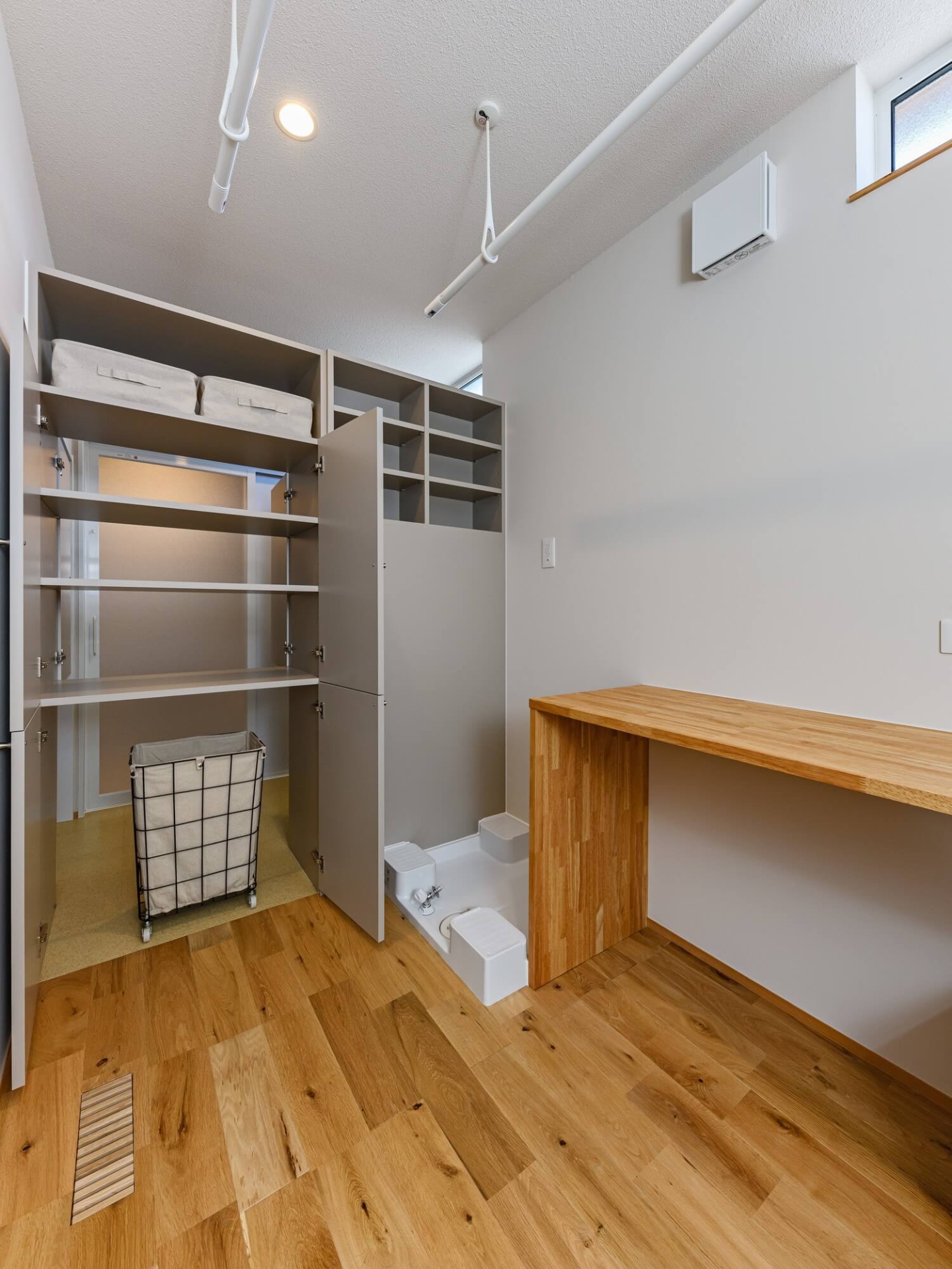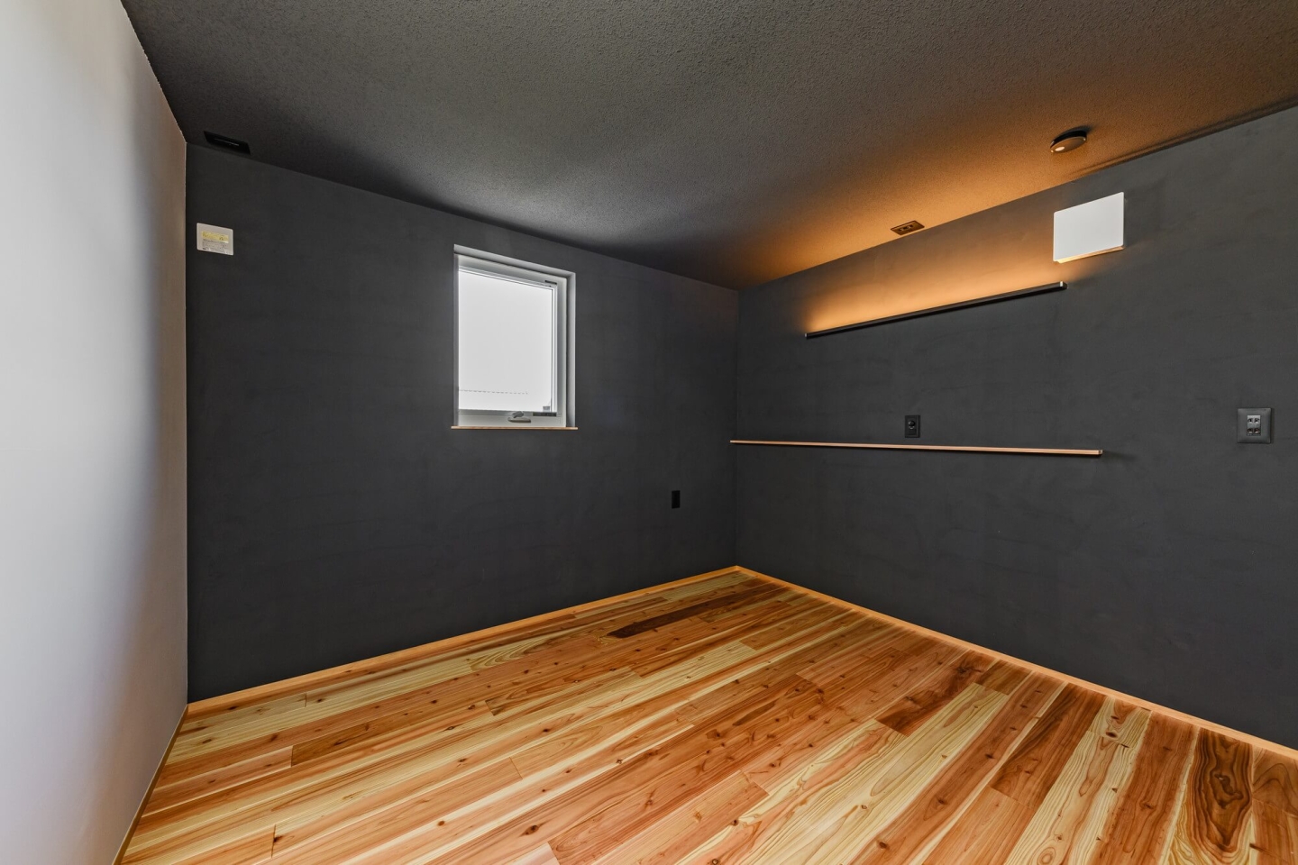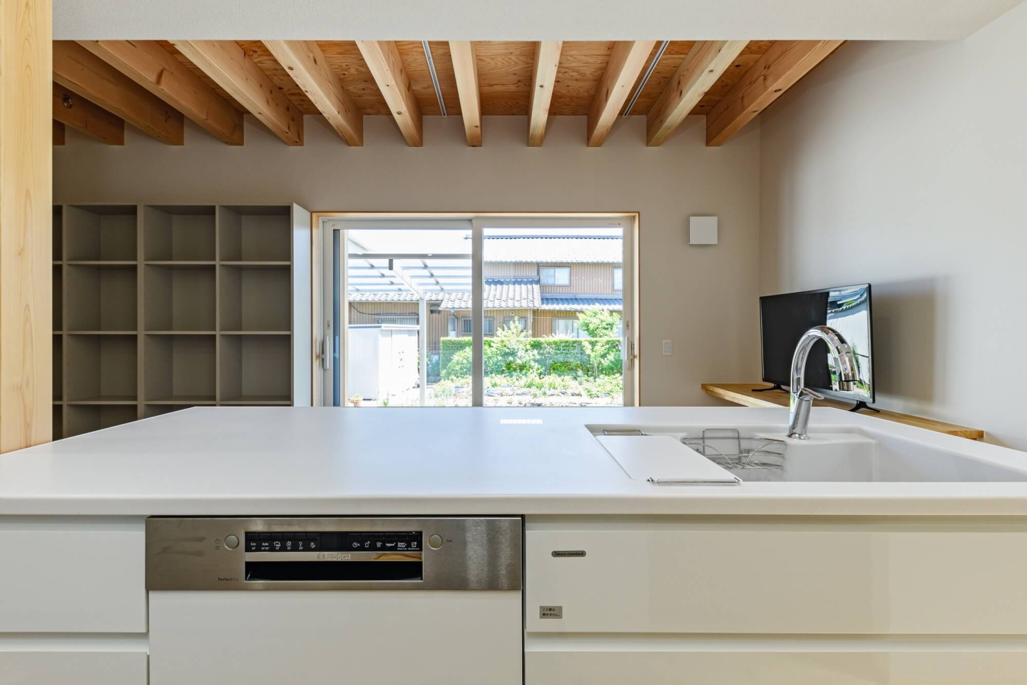 奥様こだわりのキッチンはコンロ(加熱機器)レスのためレンジフードもなくスッキリ!そしてご希望の海外製食洗機をビルトインするとキッチンというよりオシャレな家具のような素敵なキッチンになりました。また、小気味よく配置されたリビングの天井梁や造作家具までグレーを基調にしたLDK、黒っぽい塗り壁が落ち着いた空間を演出する寝室もこだわりポイントです。そして隣り合う洗濯室と脱衣室の両方から仕舞える間仕切りタイプの造作収納家具もオーナー様のアイデアがいっぱい詰まってます。
