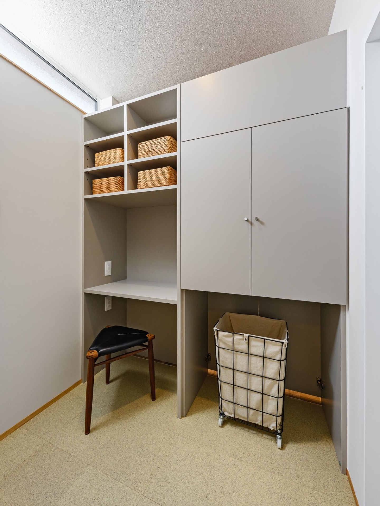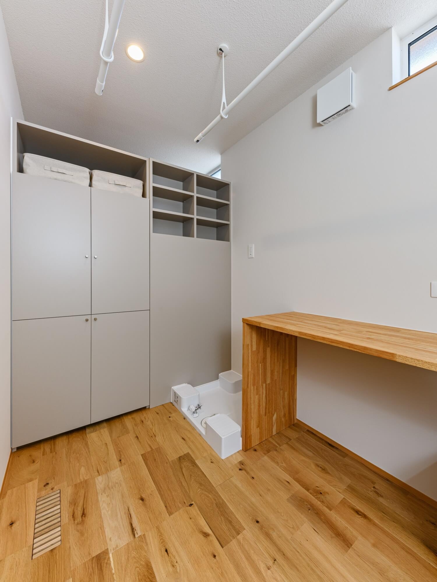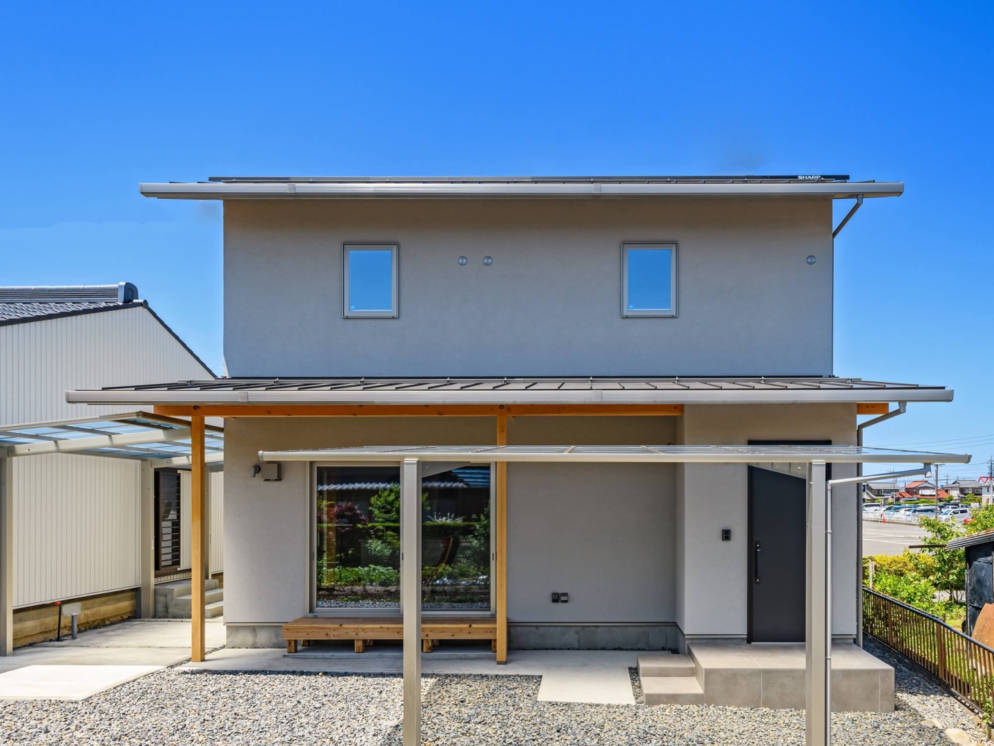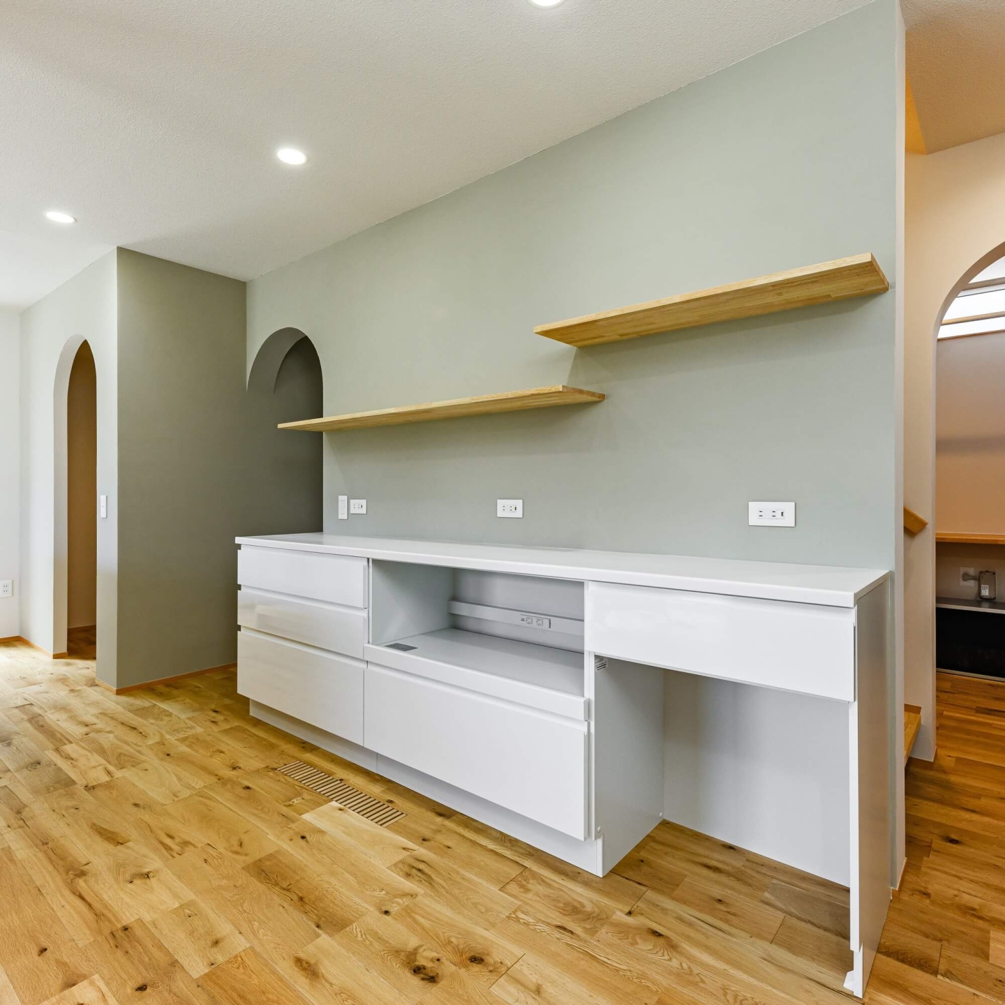 奥様こだわりのキッチンはコンロ(加熱機器)レスのためレンジフードもなくスッキリ!そしてご希望の海外製食洗機をビルトインするとキッチンというよりオシャレな家具のような素敵なキッチンになりました。また、小気味よく配置されたリビングの天井梁や造作家具までグレーを基調にしたLDK、黒っぽい塗り壁が落ち着いた空間を演出する寝室もこだわりポイントです。そして隣り合う洗濯室と脱衣室の両方から仕舞える間仕切りタイプの造作収納家具もオーナー様のアイデアがいっぱい詰まってます。