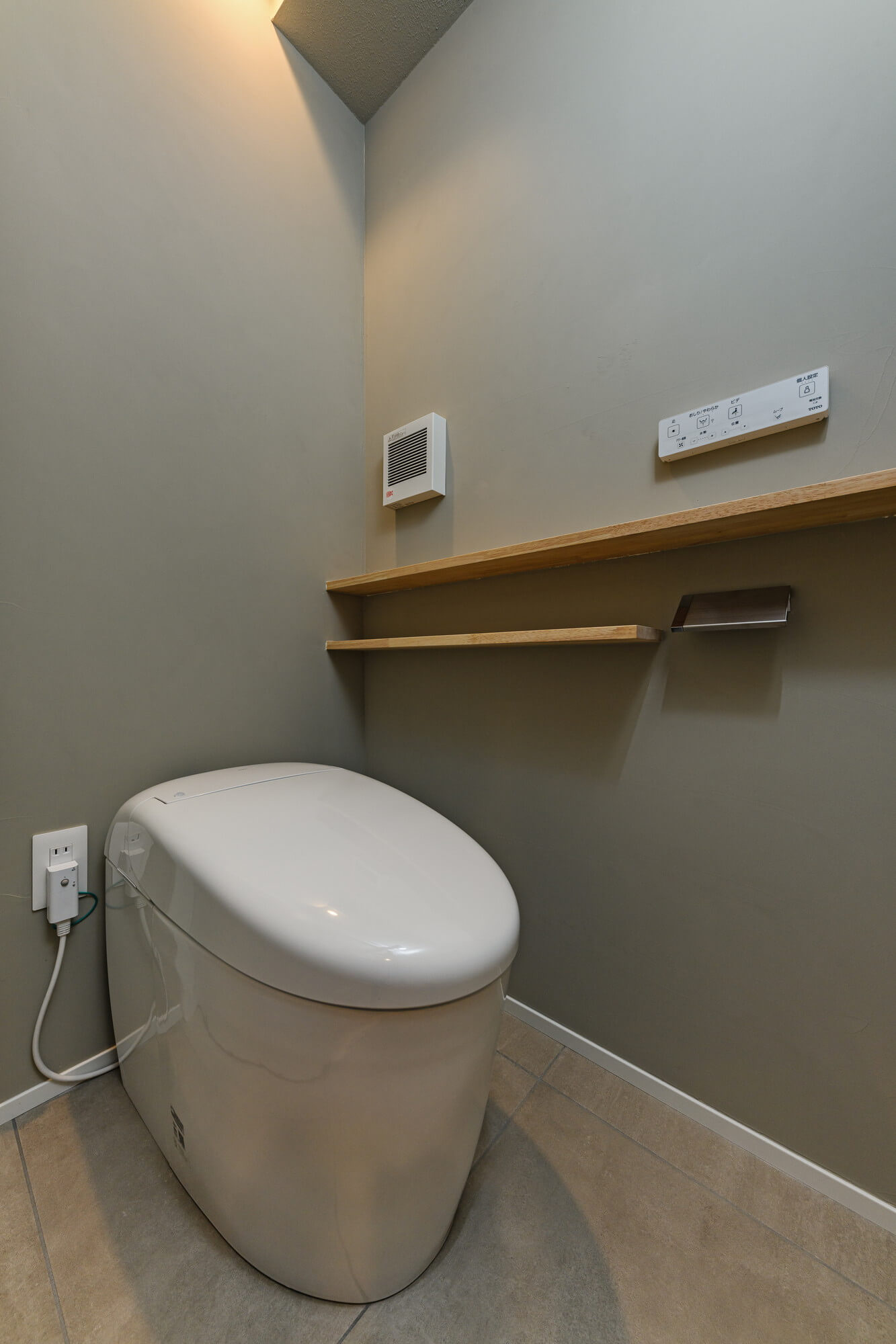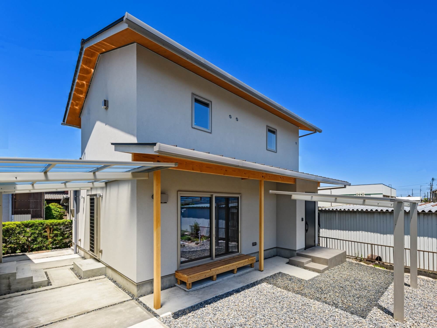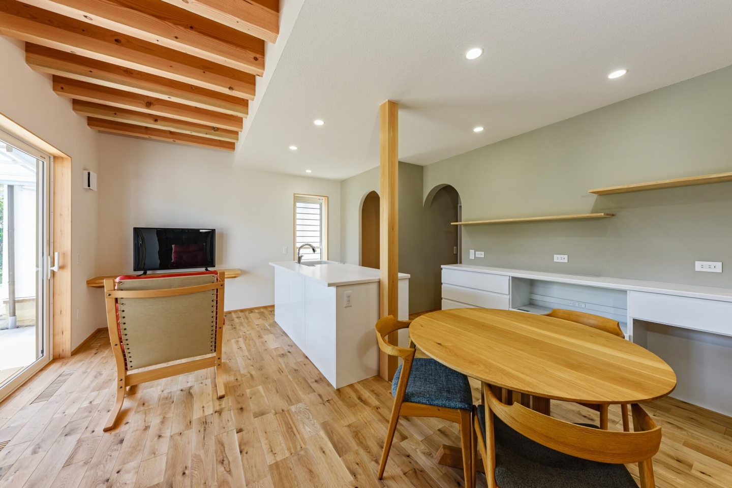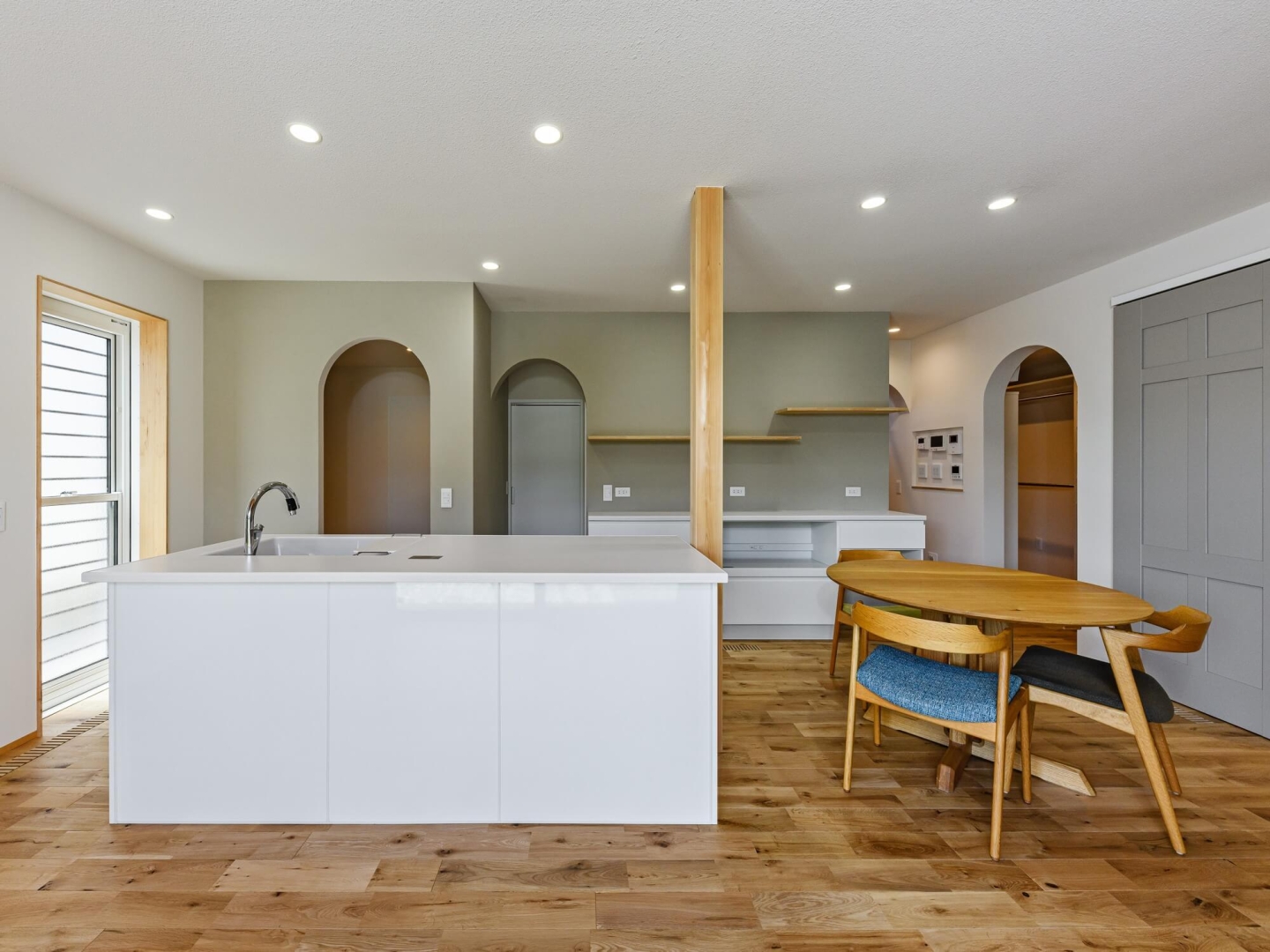 奥様こだわりのキッチンはコンロ(加熱機器)レスのためレンジフードもなくスッキリ!そしてご希望の海外製食洗機をビルトインするとキッチンというよりオシャレな家具のような素敵なキッチンになりました。また、小気味よく配置されたリビングの天井梁や造作家具までグレーを基調にしたLDK、黒っぽい塗り壁が落ち着いた空間を演出する寝室もこだわりポイントです。そして隣り合う洗濯室と脱衣室の両方から仕舞える間仕切りタイプの造作収納家具もオーナー様のアイデアがいっぱい詰まってます。