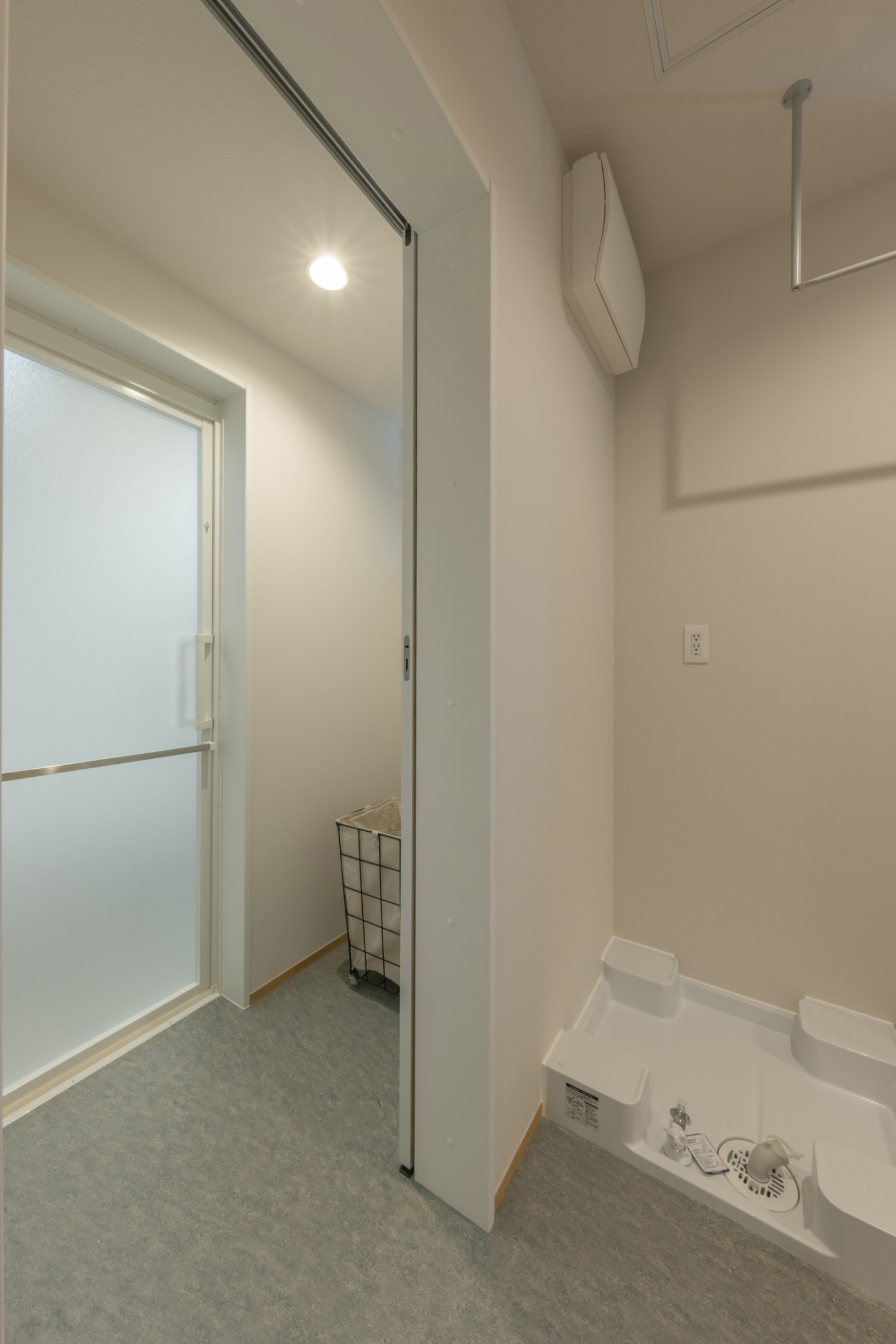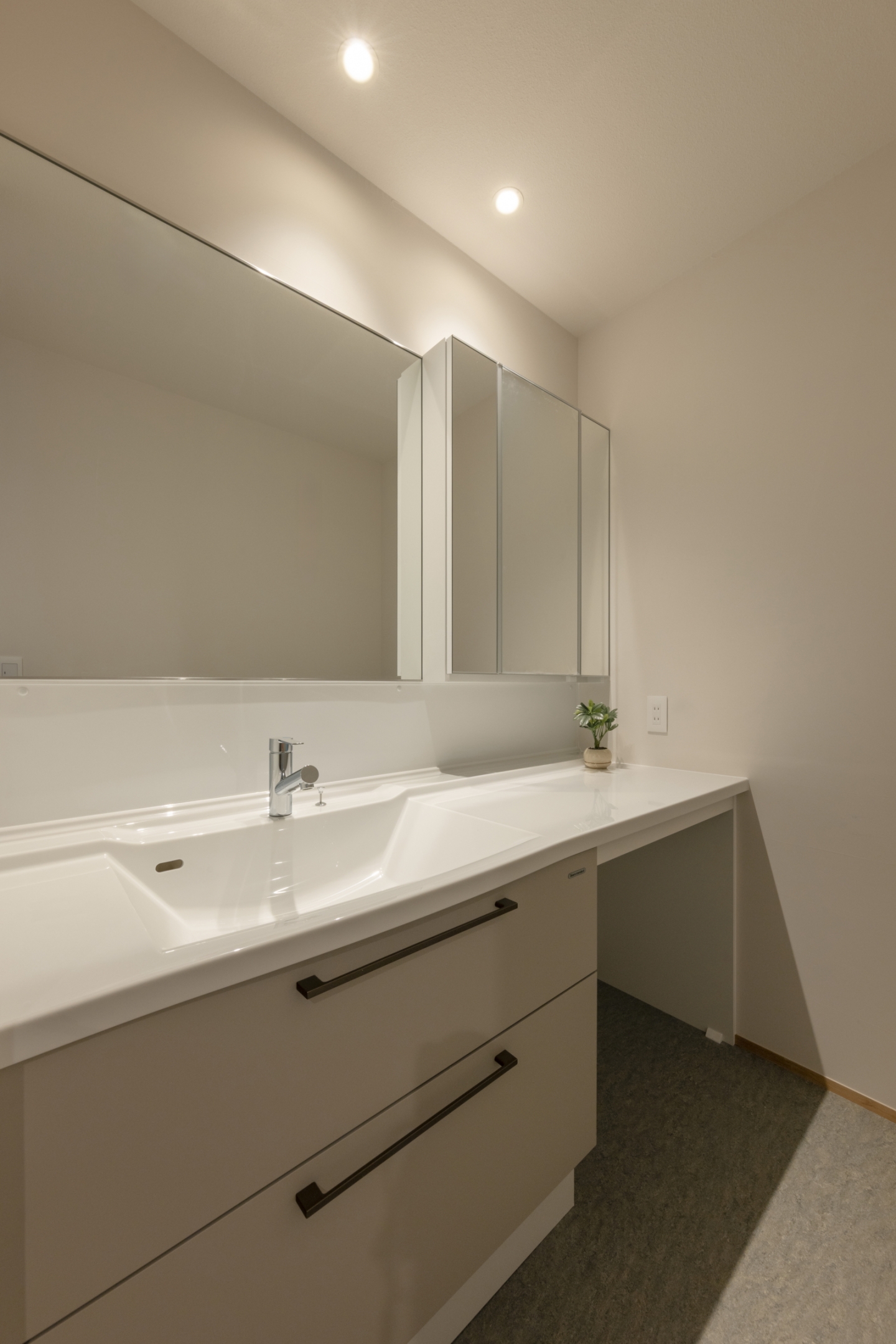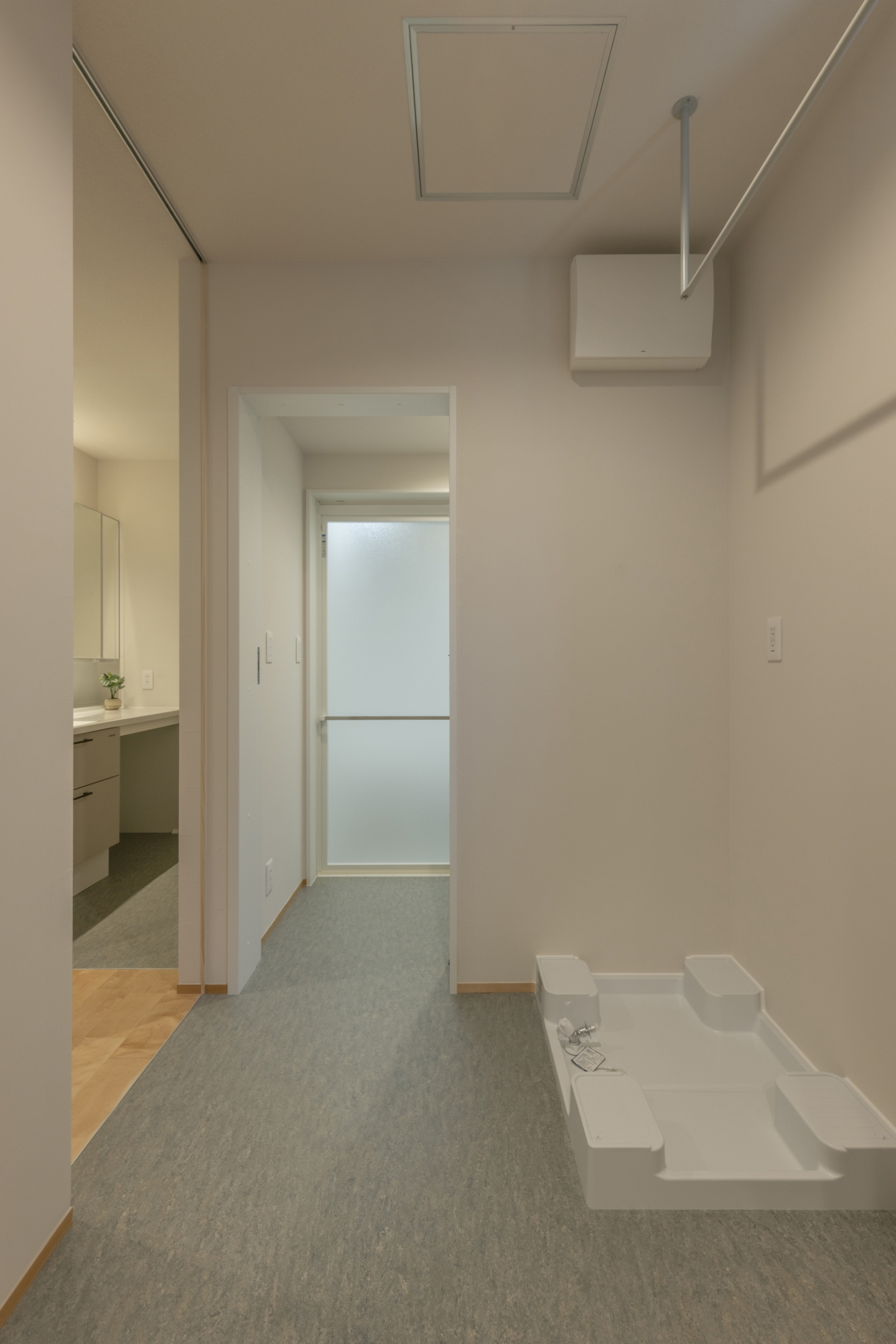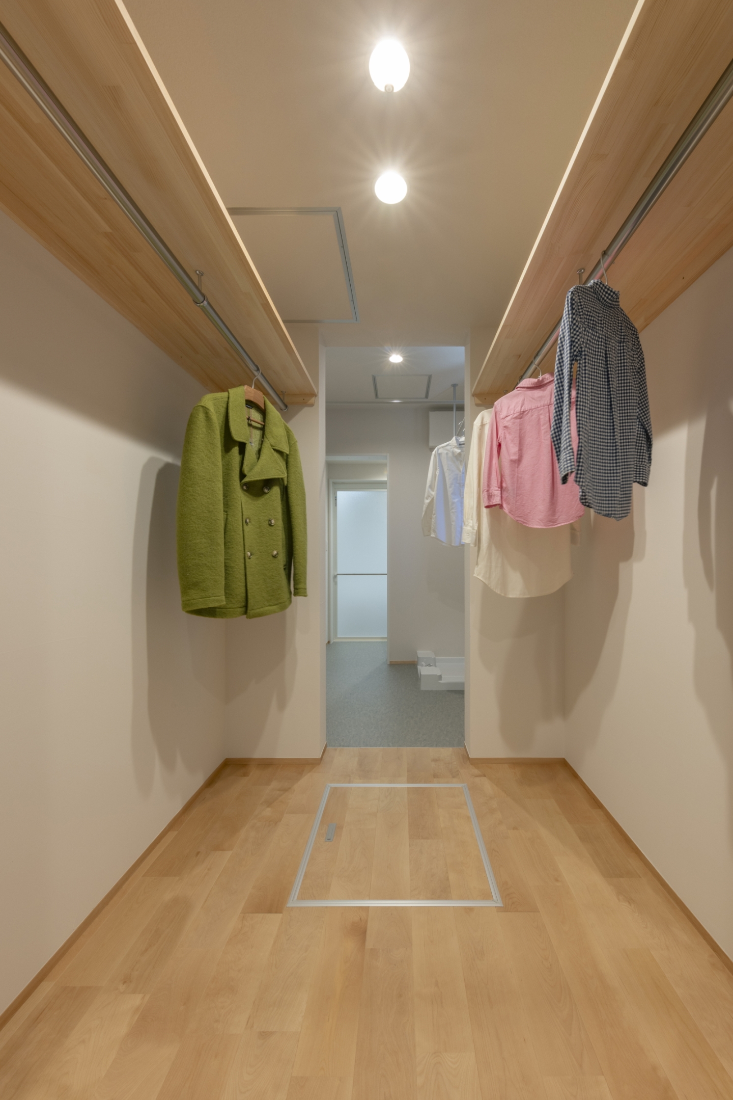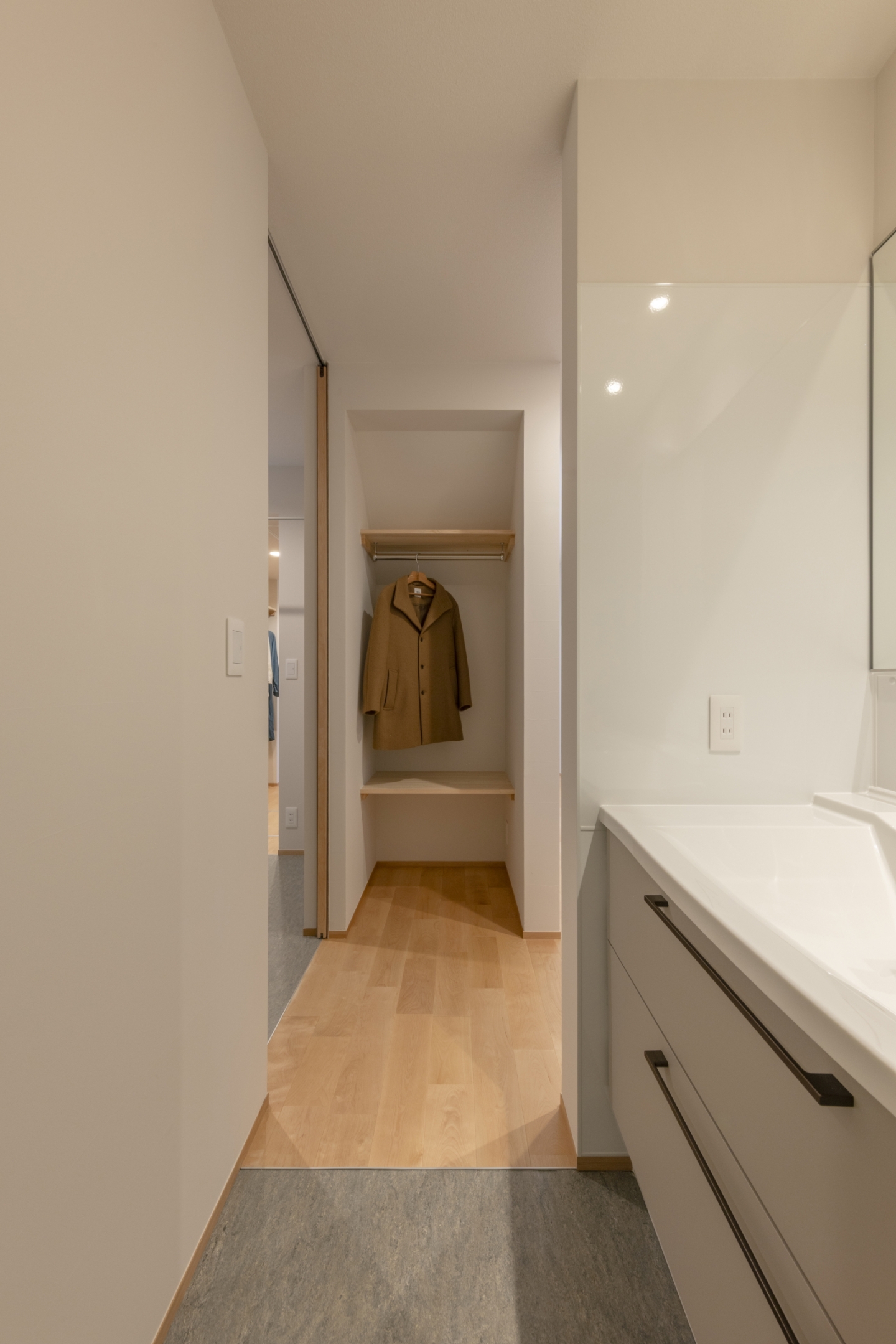 寝室・子ども部屋の両方からアクセスしやすい位置にウォークインクローゼットを配置し、脱衣室から洗面へとつながる動線とすることで、身支度がスムーズに行えるよう計画しました。