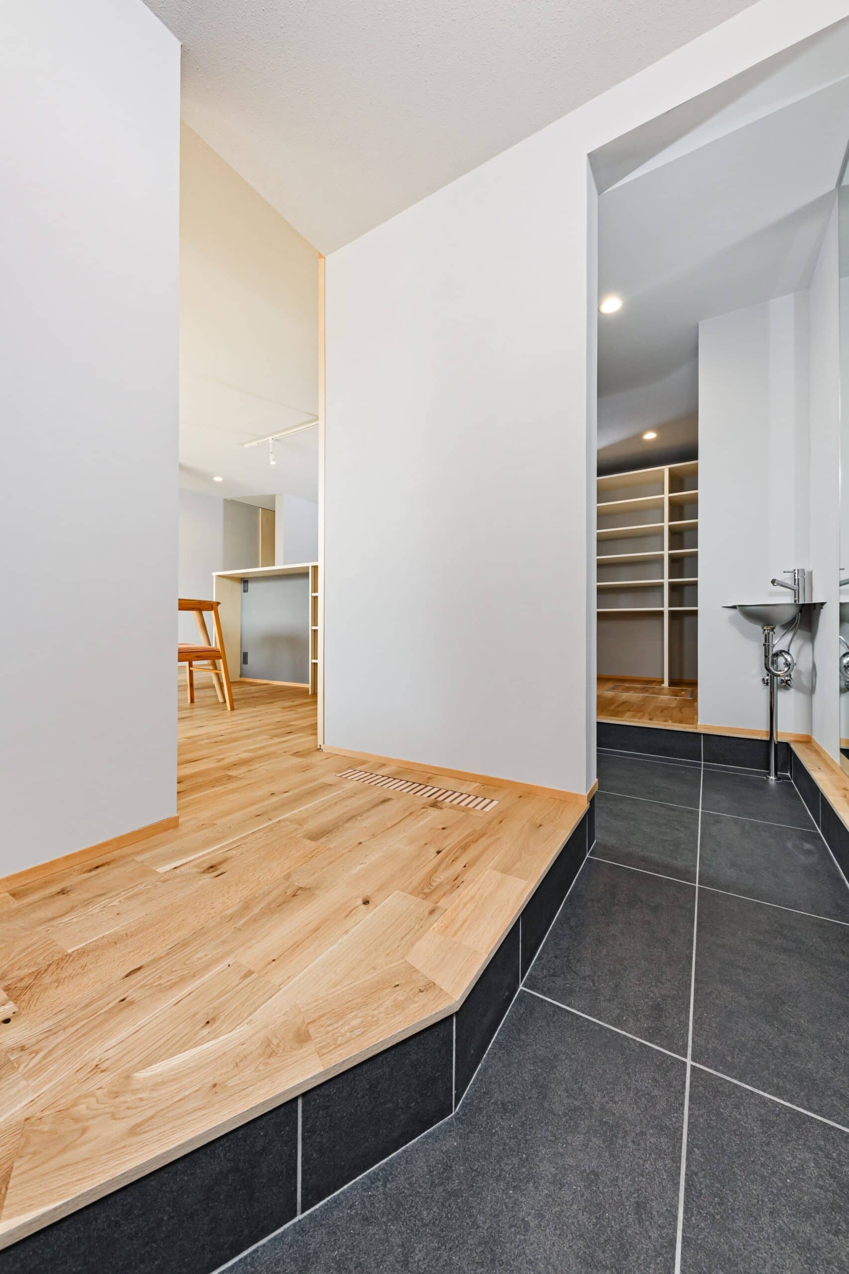 玄関を入ったところには可愛らしいデザインの造作手洗いを設置。WICLも隣接しているので、手を洗ったらすぐ着替えをすることができます。